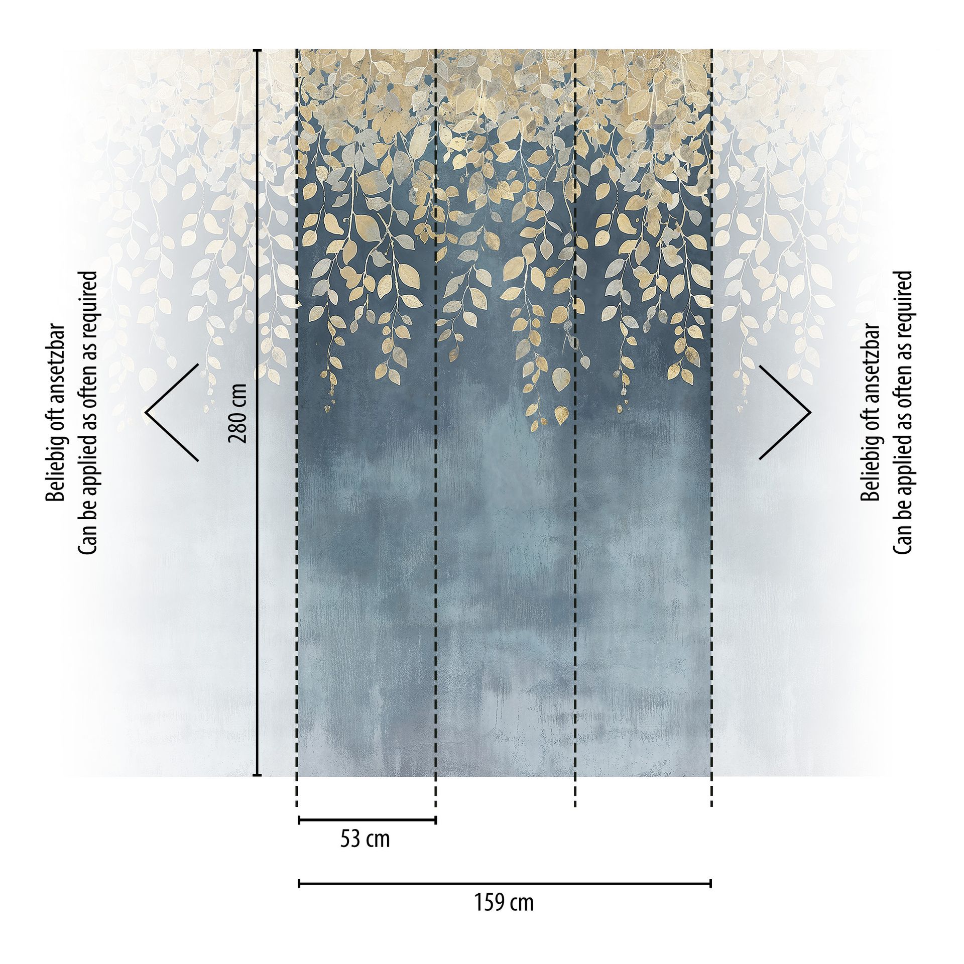 Diese botanische Tapete zeigt elegante Blätterranken, die wie ein natürlicher Vorhang von der Decke herabfallen. Der tiefblaue Hintergrund wird von goldgelben Blättern durchzogen, die eine harmonische und beruhigende Atmosphäre schaffen. Der fließende Übergang von dichtem Blätterwerk zu offenem Raum verleiht Räumen eine besondere Tiefenwirkung.
