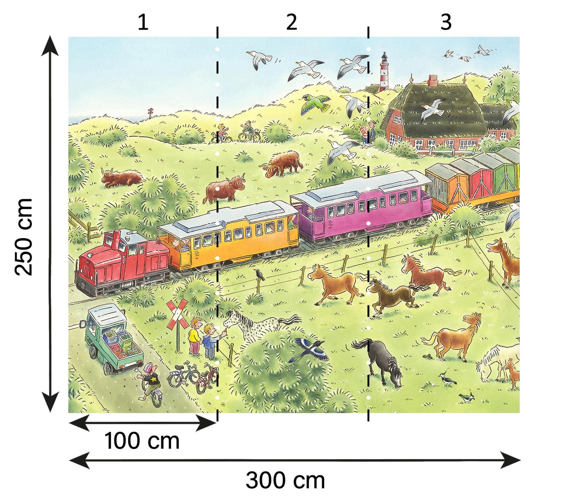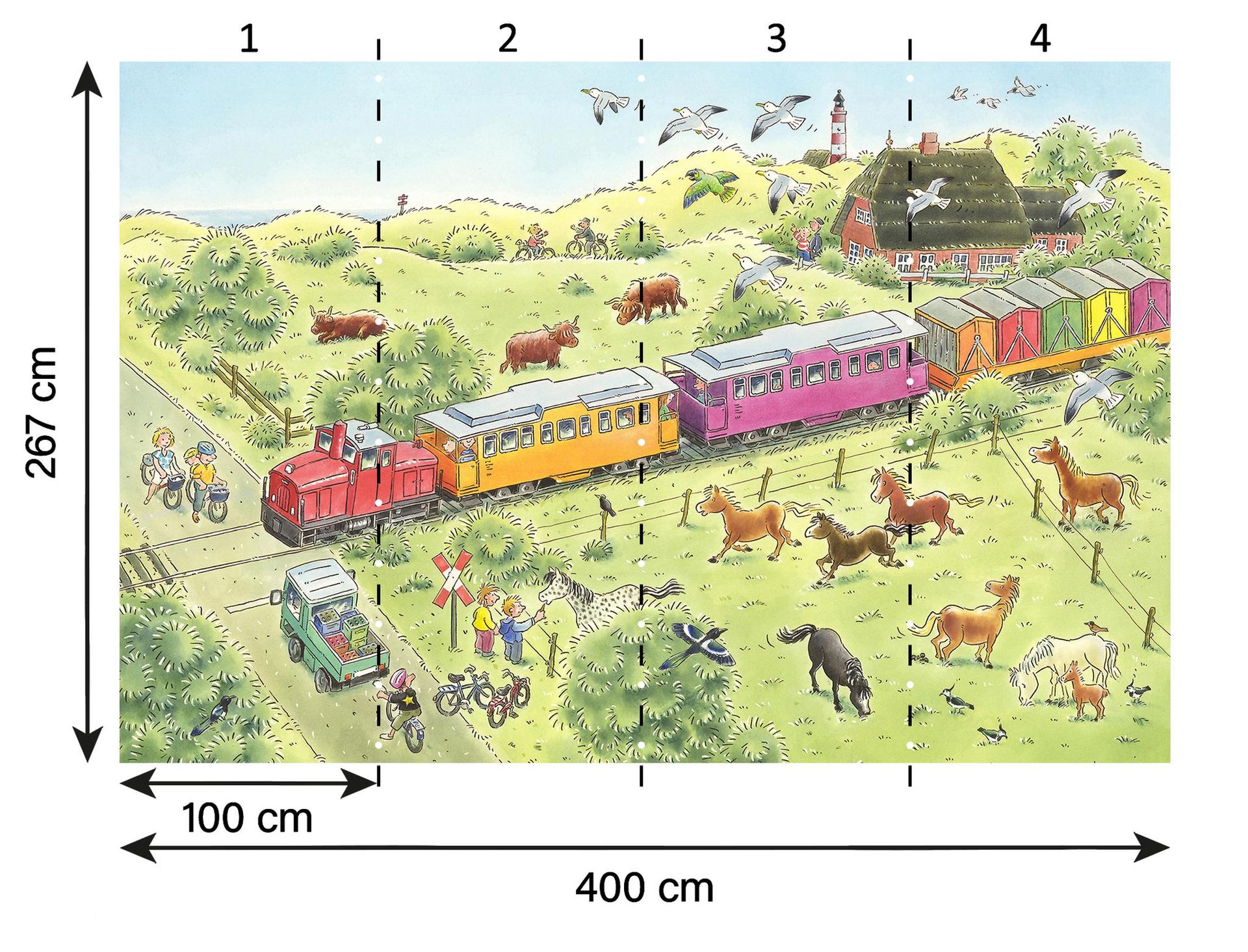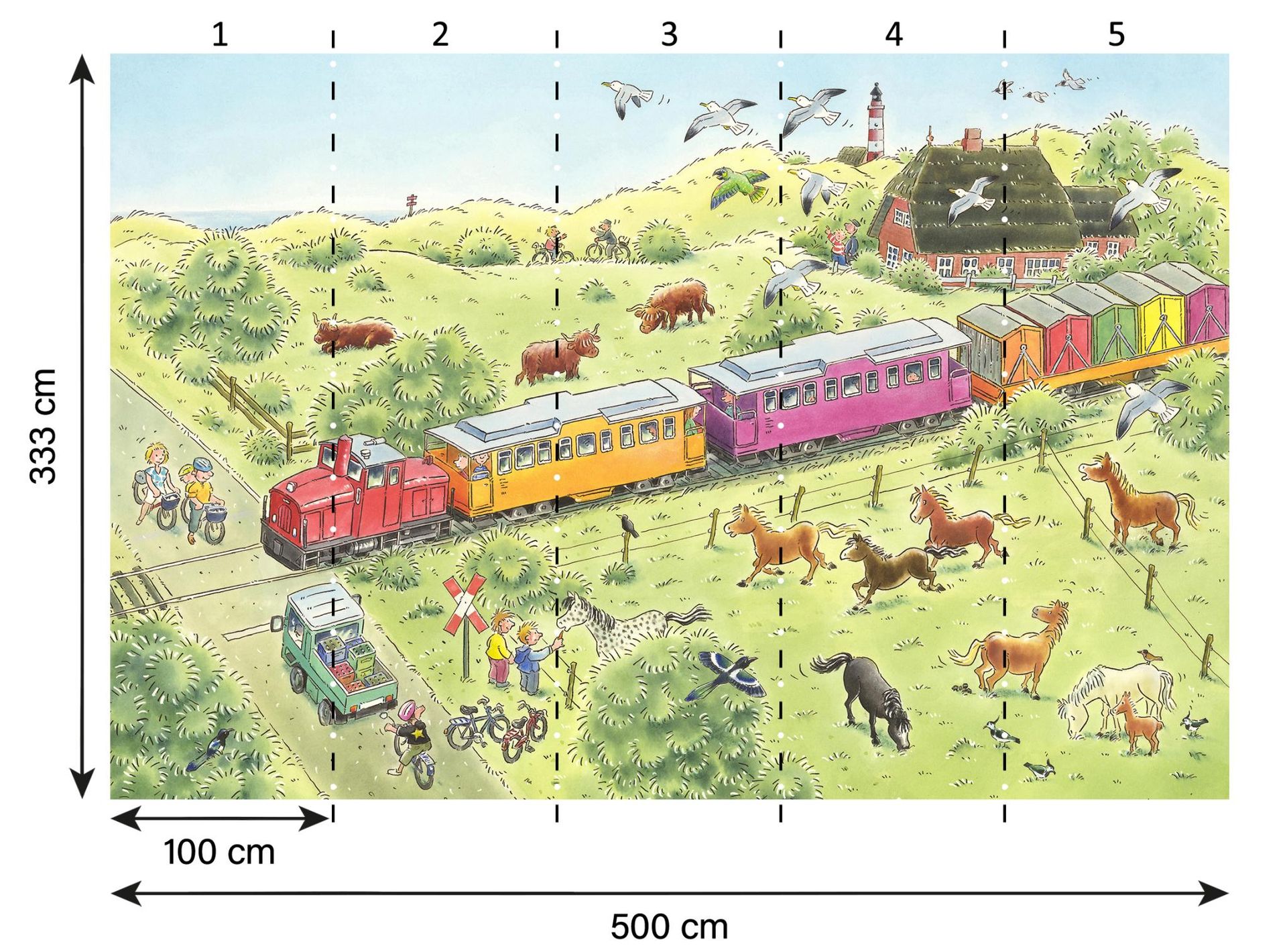 Die A.S. Création Fototapete aus der Kollektion XXL 5 verwandelt Ihre Wände in eine lebhafte und farbenfrohe Landschaftsszene. Die Primärfarbe Grün erstreckt sich über die gesamte Szenerie und bildet das frische Gras, auf dem sich Tiere und Pflanzen befinden. Ein roter Zug, der als Sekundärmotiv fungiert, durchquert die Bildmitte und bringt Bewegung in das Bild. Kleinere Details wie Häuser, Menschen und der Leuchtturm im blauen Himmel runden das freundliche Erscheinungsbild ab und laden zum Hinschauen ein.
