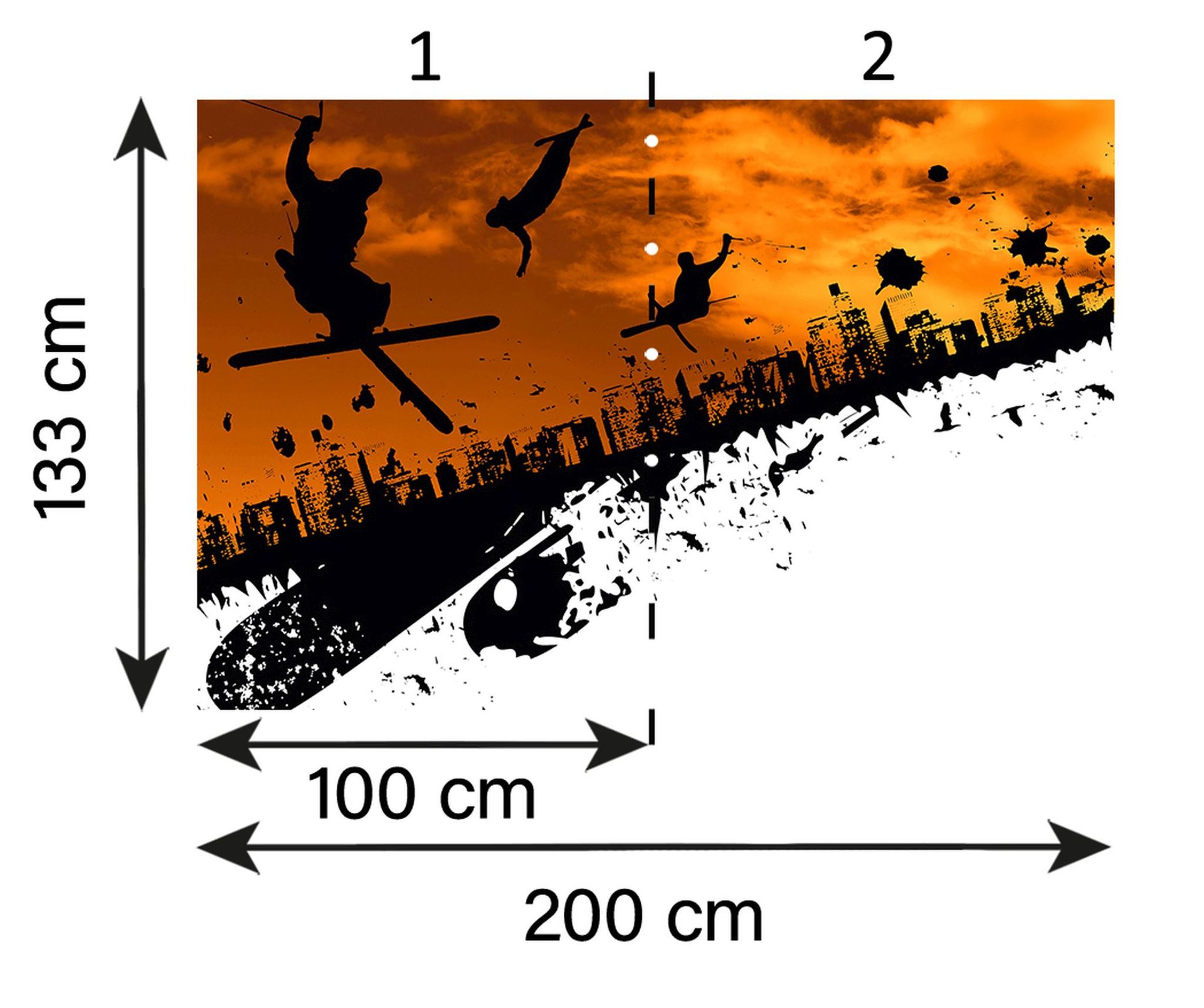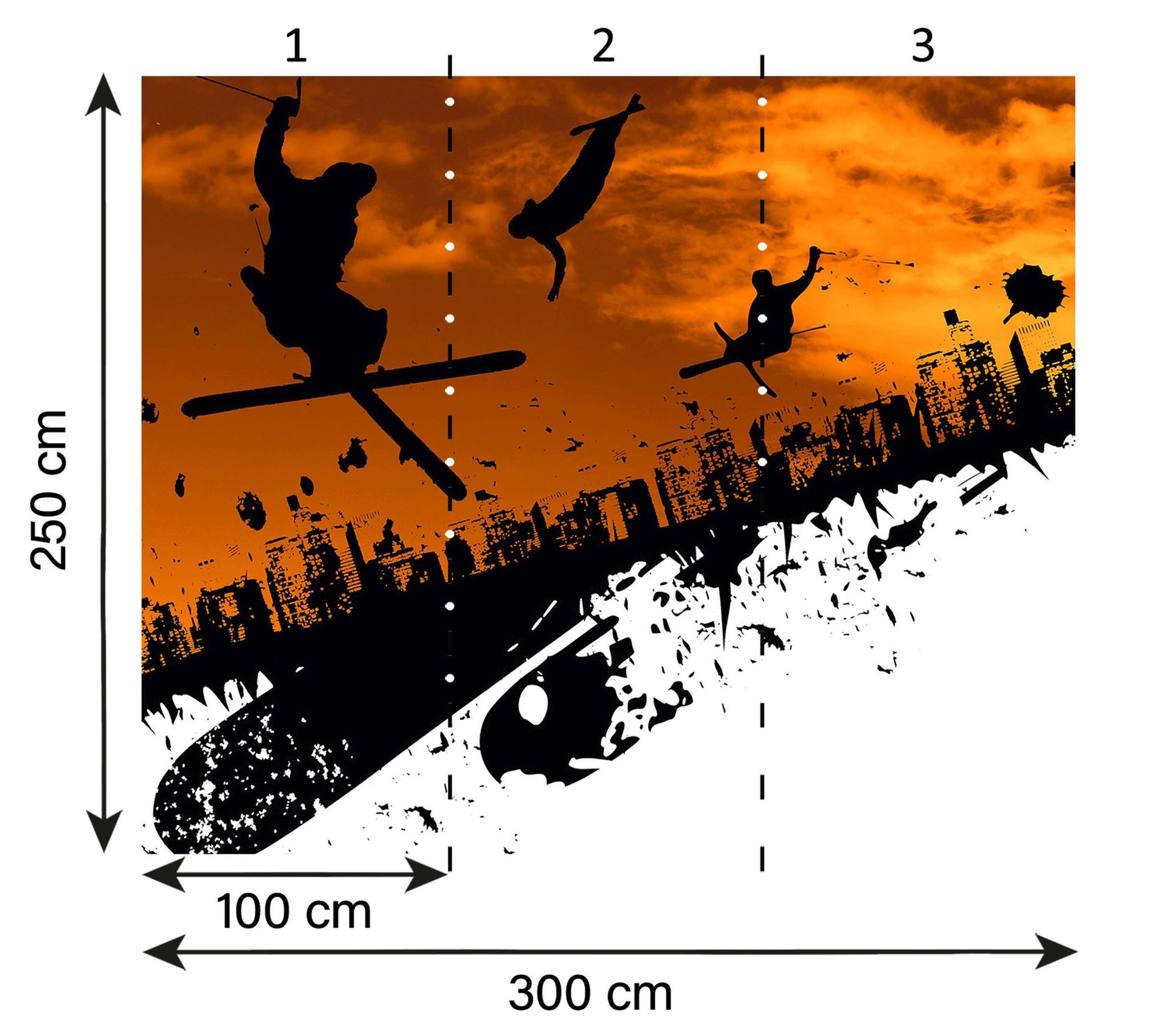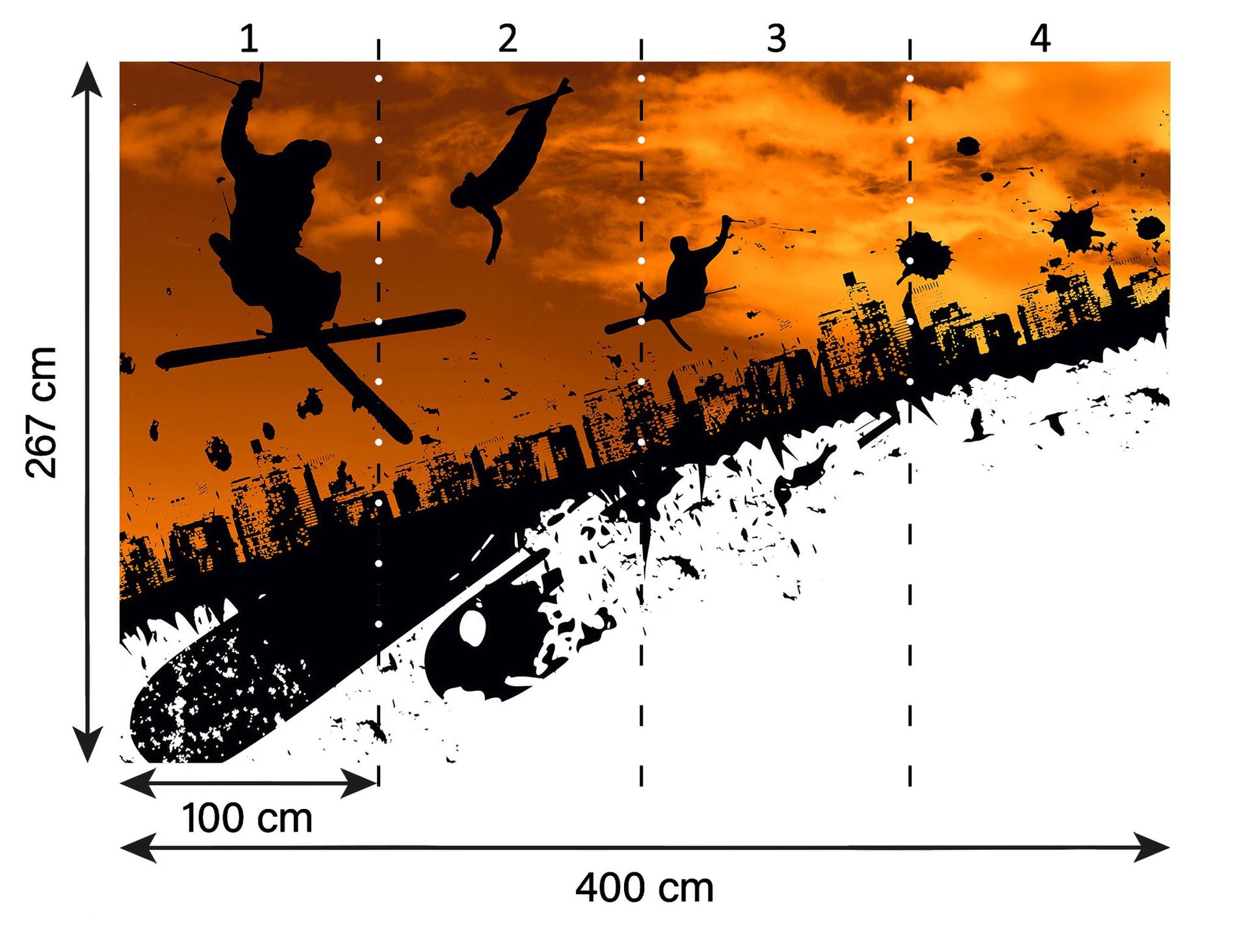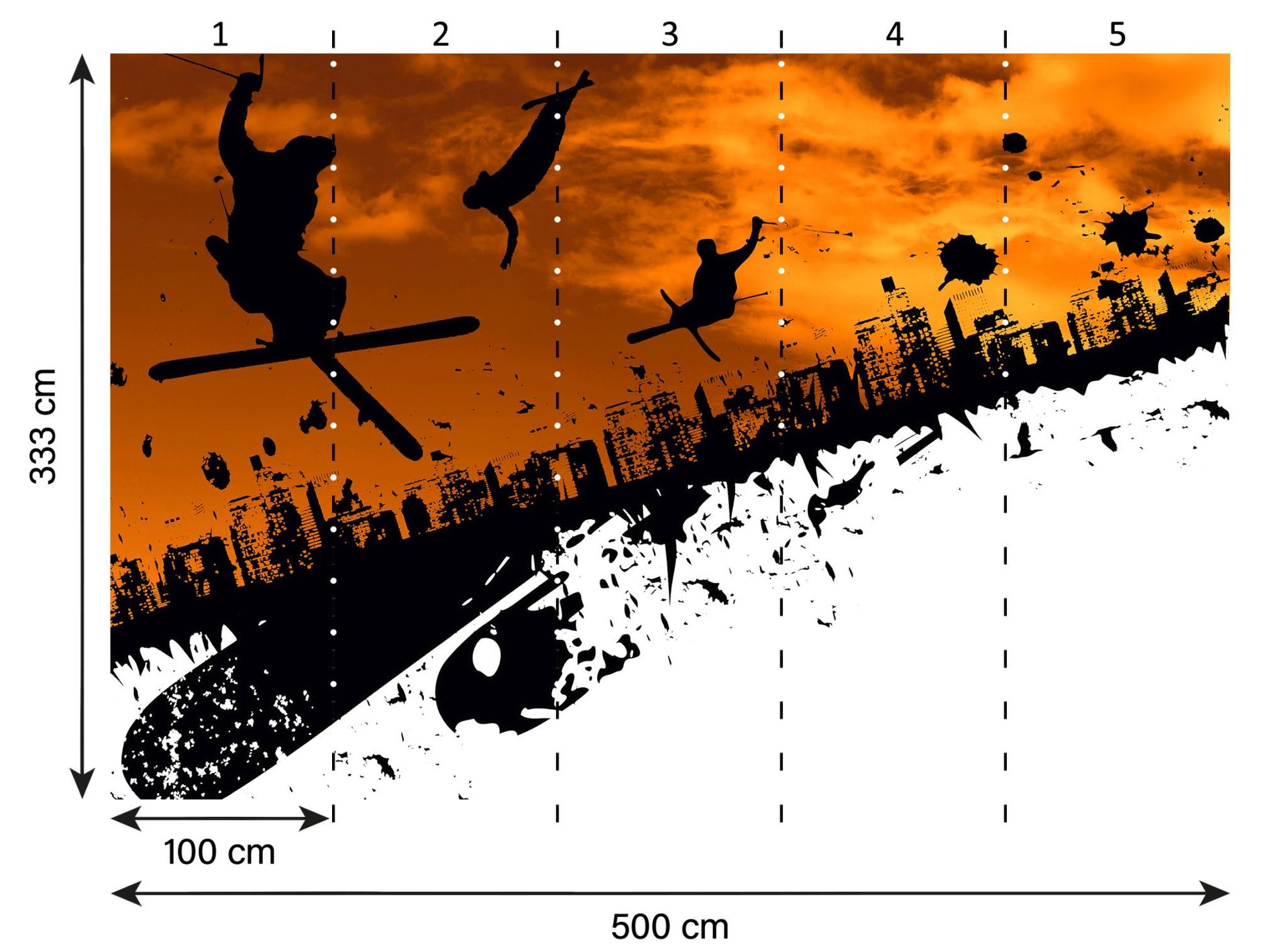 Erleben Sie actionreiche Dynamik für Ihre Wände mit der A.S. Création Fototapete aus der Kollektion XXL 5. Diese beeindruckende Wanddekoration zeigt Skateboarder in kühnen Silhouetten vor einer städtischen Skyline. Lebendige orange Himmel wurden von gezielten schwarzen Spritzern durchzogen, um eine kraftvolle und energiegeladene Atmosphäre zu schaffen. Die explosive Ästhetik dieser Fototapete wird jedem Raum einen Hauch von urbaner Coolness und jugendlicher Freiheit verleihen.