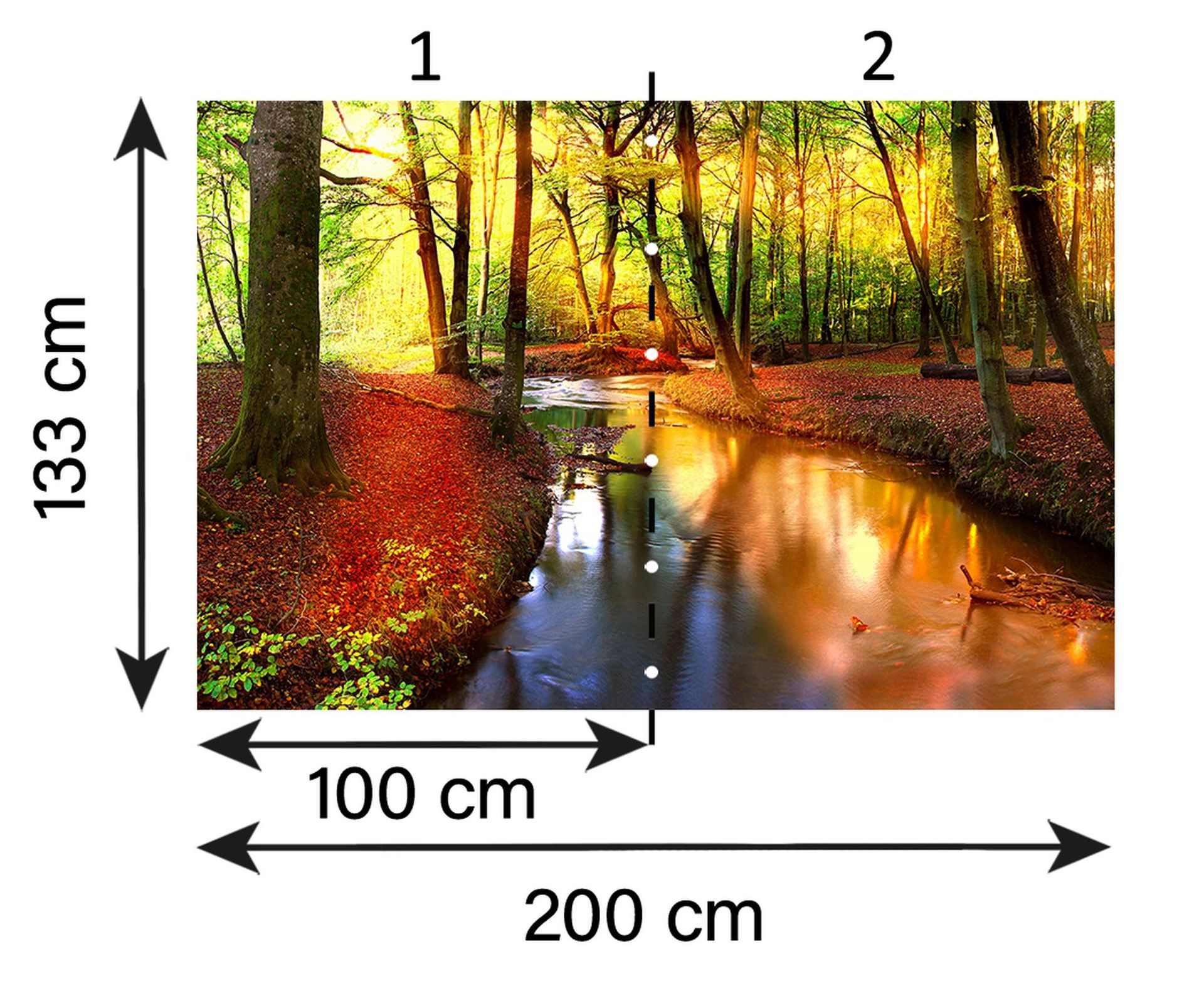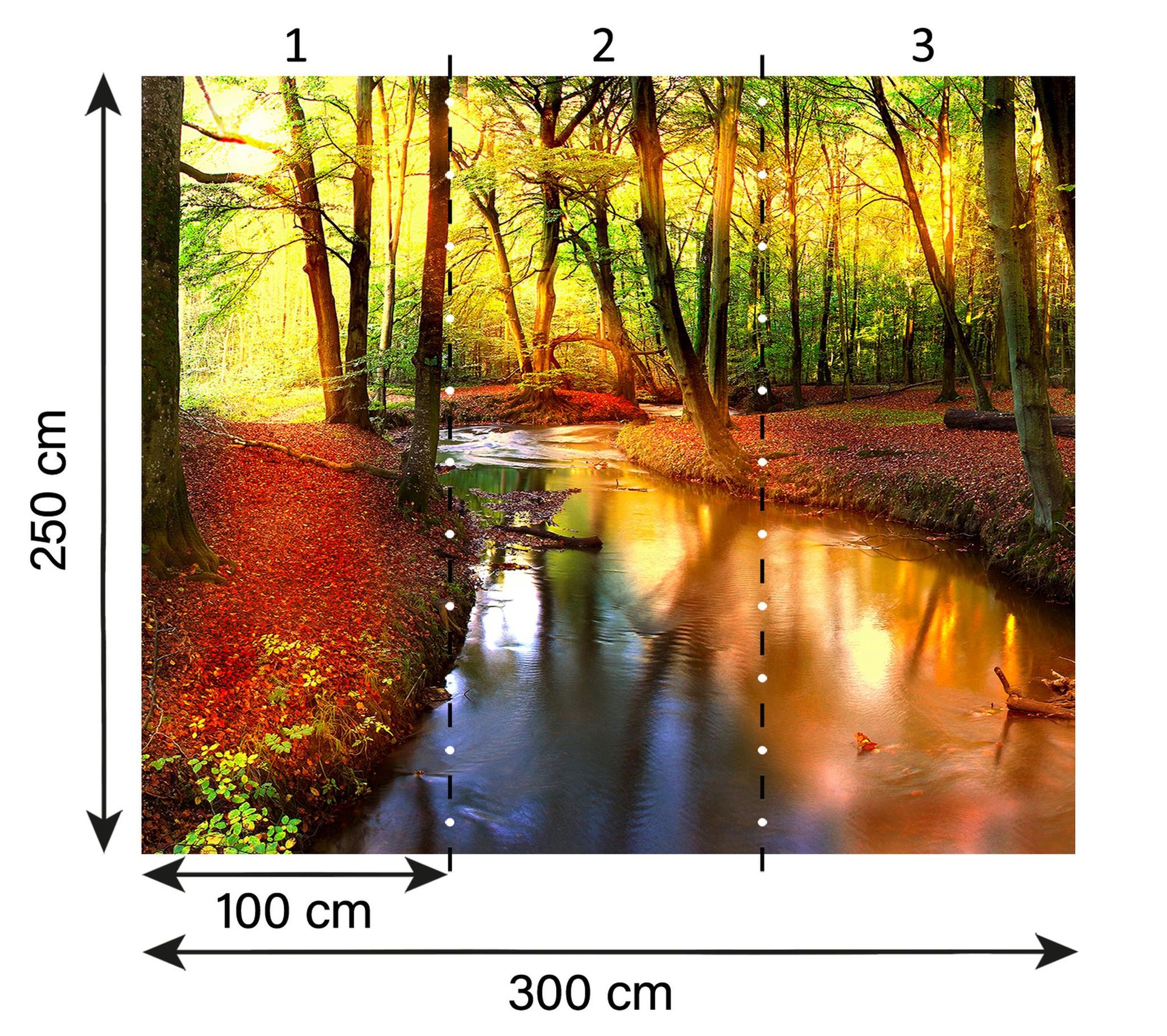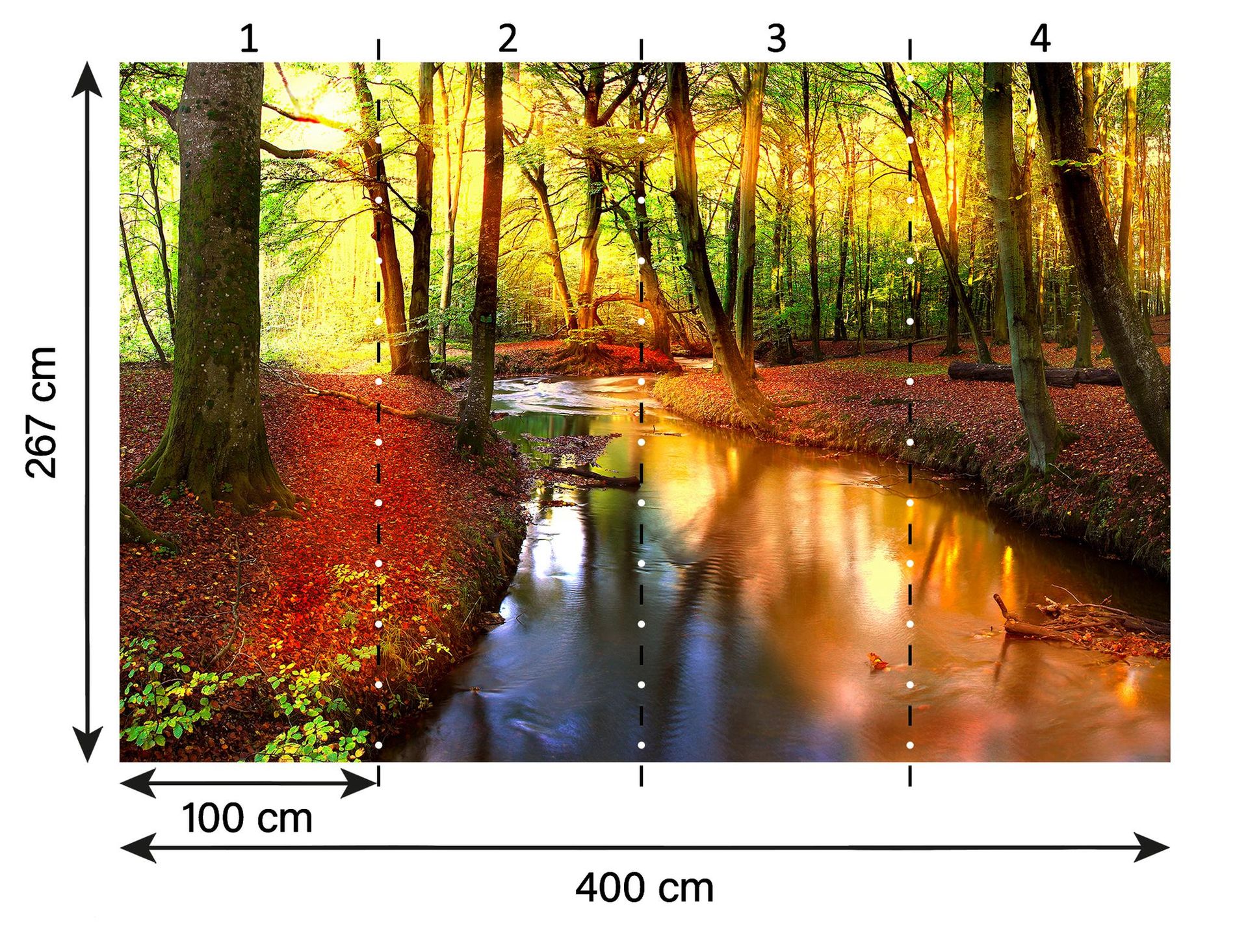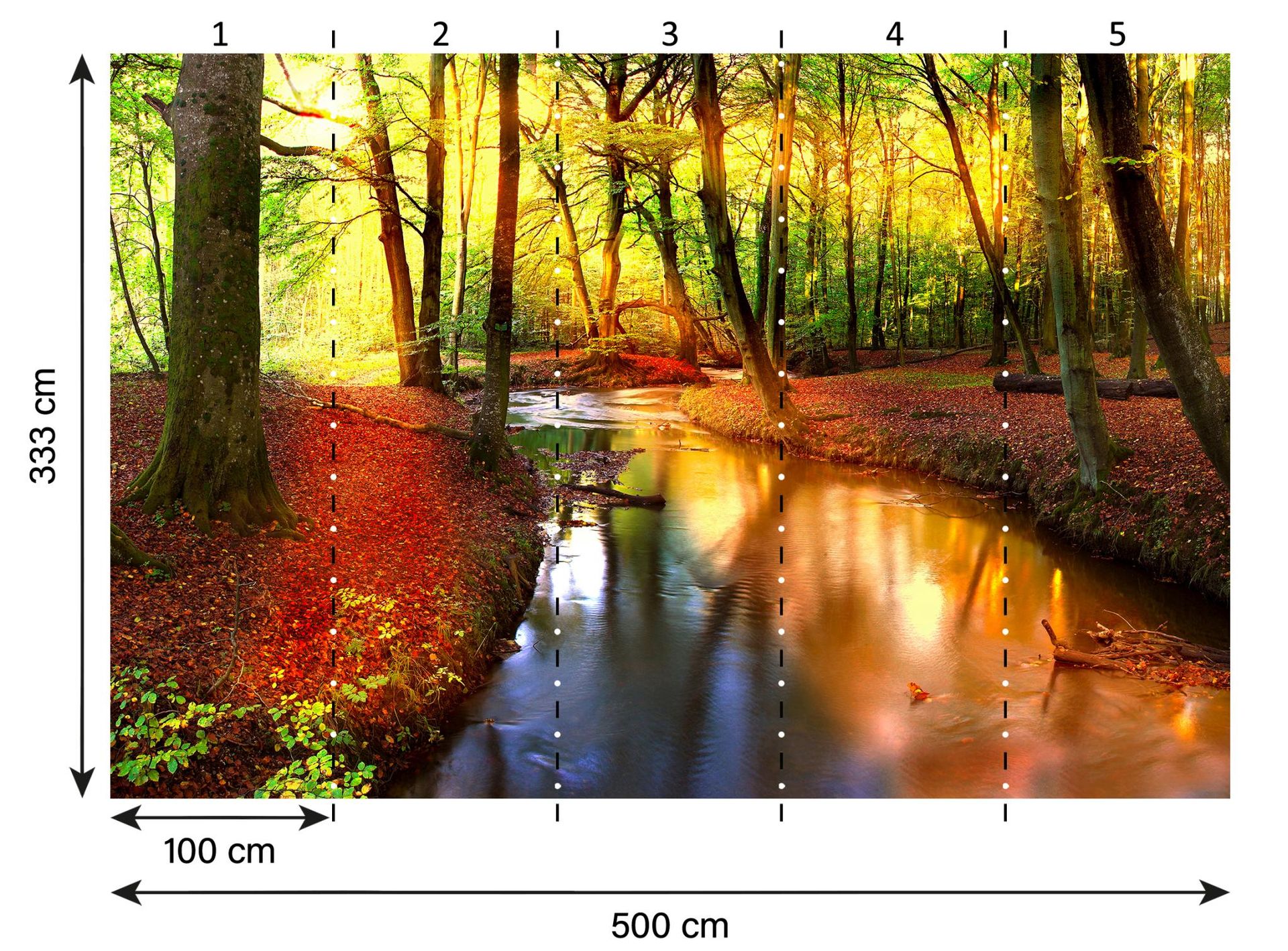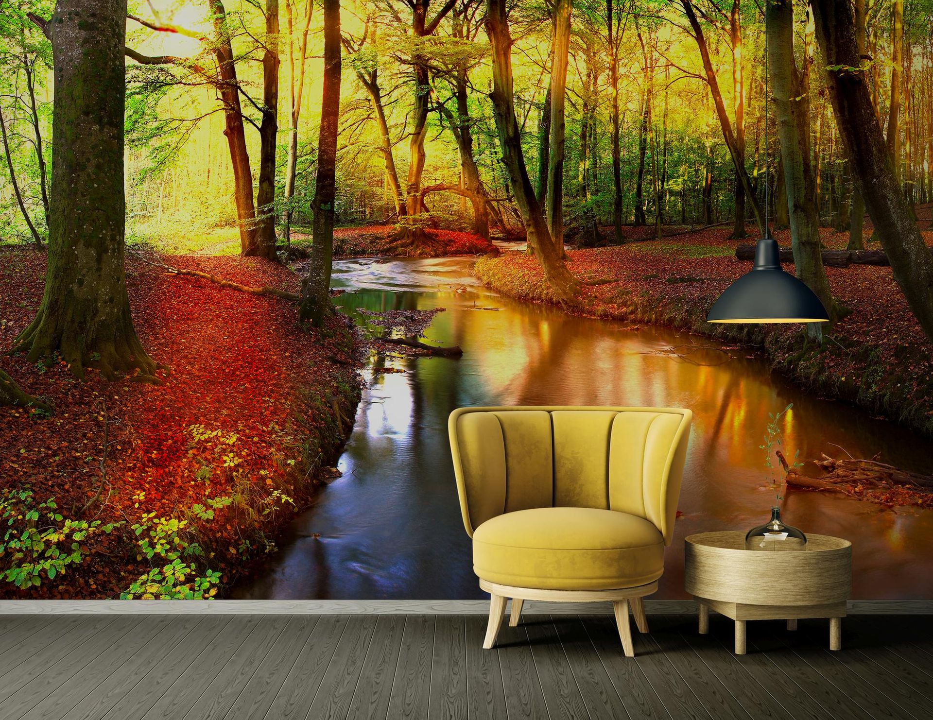Diese hochqualitative Fototapete der Marke A.S. Création aus der Kollektion XXL 5 entführt Sie in eine friedvolle Waldlandschaft im Herbst. Das leuchtende Orange des Laubs, kombiniert mit Grüntönen der Bäume und dem sanften Blau des fließenden Flusses, schafft eine warme und beruhigende Atmosphäre. Die Sonnenstrahlen, die durch das Geäst brechen, setzen gelbe Highlights, die das goldene Leuchten des Herbstes einfangen. Die Tapete vermittelt eine lebendige Szenerie, die jedem Raum eine außergewöhnliche Tiefe und einen Hauch von Naturverbundenheit verleiht.