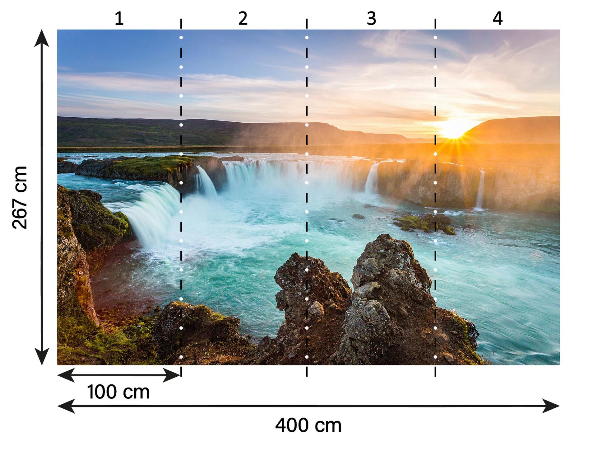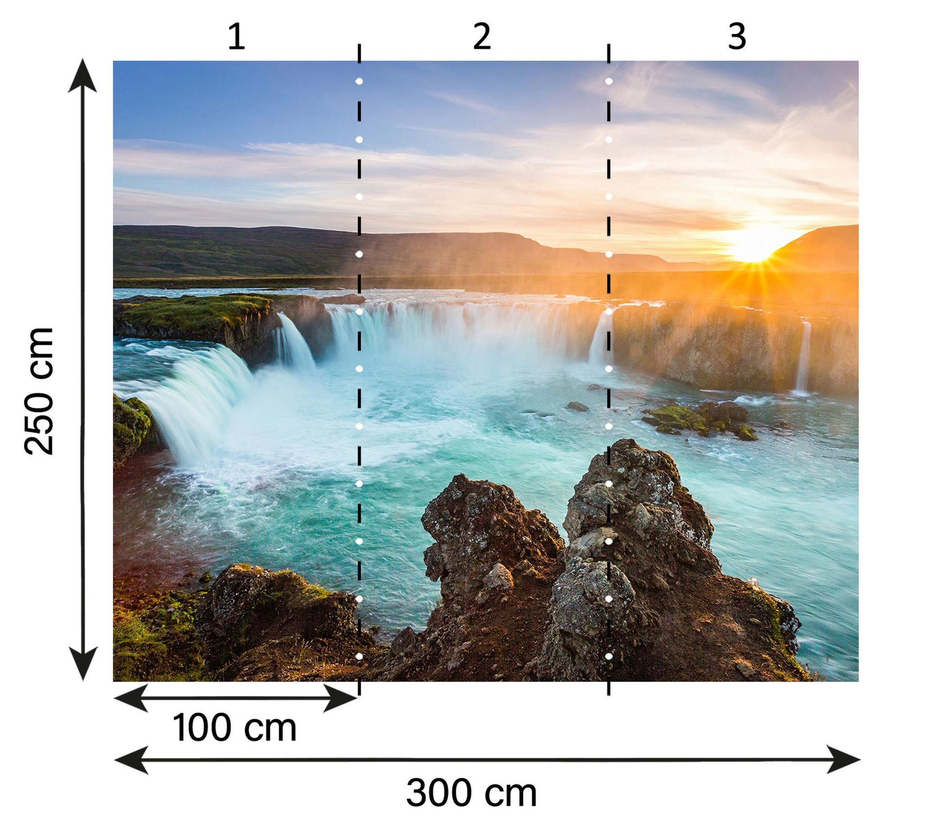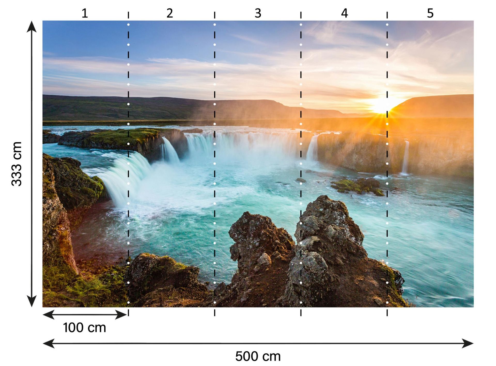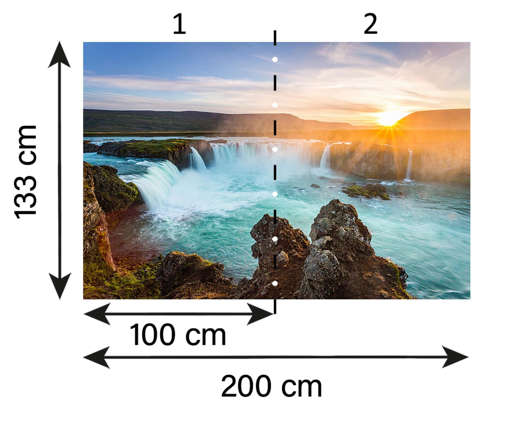 Bringen Sie die erhabene Schönheit der Natur direkt in Ihr Zuhause mit dieser atemberaubenden Fototapete aus der XXL 5 Kollektion von A.S. Création. Das Hauptmotiv, ein majestätischer Wasserfall, verströmt ein Gefühl von Ruhe und Kraft, ergänzt durch das warme Glühen der untergehenden Sonne. Die Primärfarbe Blau des fließenden Wassers kontrastiert harmonisch mit dem strahlenden Orange des Himmels, während Akzente in Grün und Braun die landschaftliche Vielfältigkeit hervorheben. Die sanfte Gischt, festgehalten in Weiß, rundet das lebendige Motiv ab.