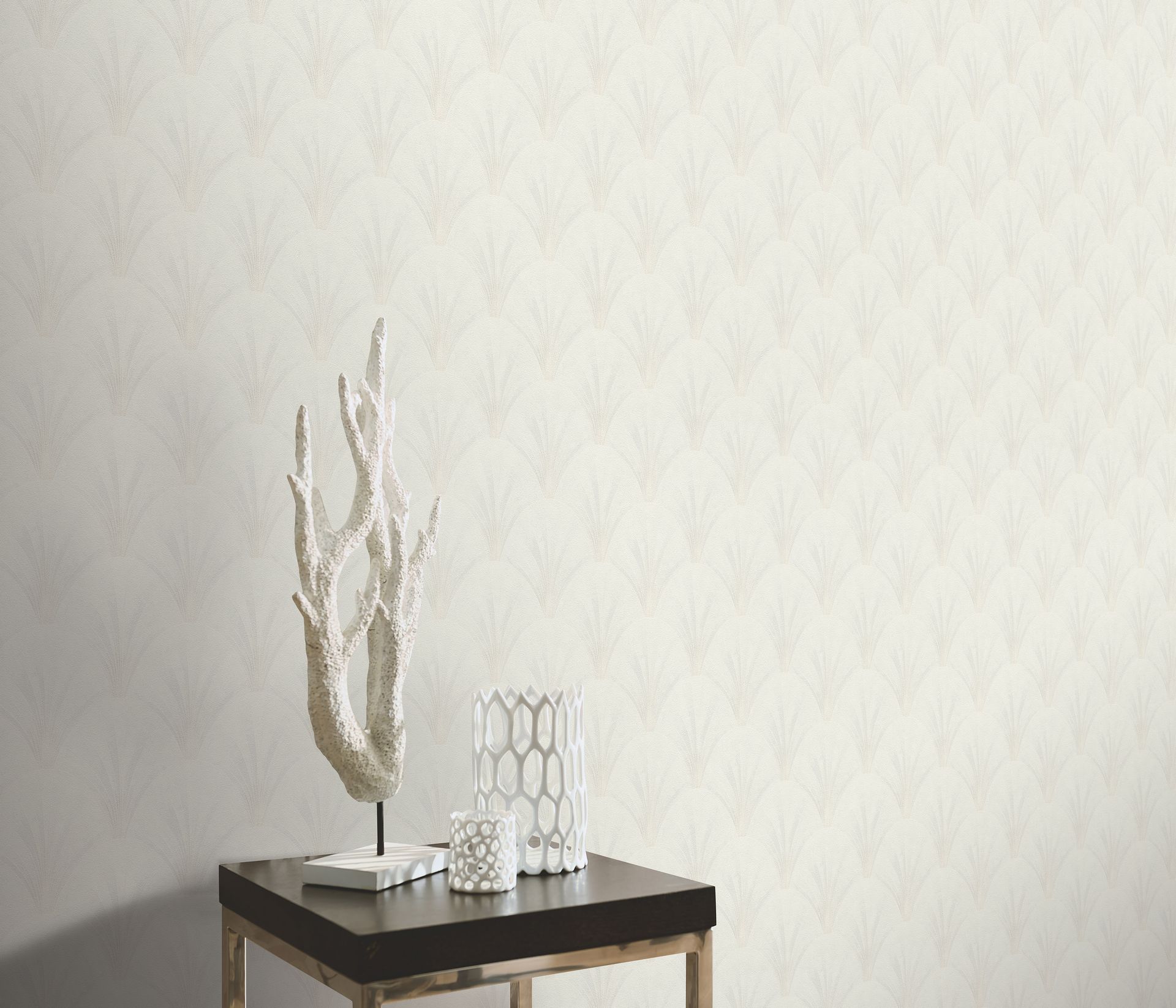 Diese elegante Tapete aus der Elle Decoration 4 Kollektion von Erismann vereint zeitloses Art-Déco-Design mit dezenter Farbgebung. Das charakteristische Fächermuster mit seinen fein gerillten Linien erinnert an stilisierte Palmwedel oder Sonnenstrahlen und bringt den Glamour der 1920er-Jahre in zeitgemäßer Zurückhaltung in den Raum. Die sanfte Creme-Beige-Farbgebung mit zarten Grauabstufungen sorgt für eine beruhigende, aber dennoch ausdruckstarke Wandgestaltung.