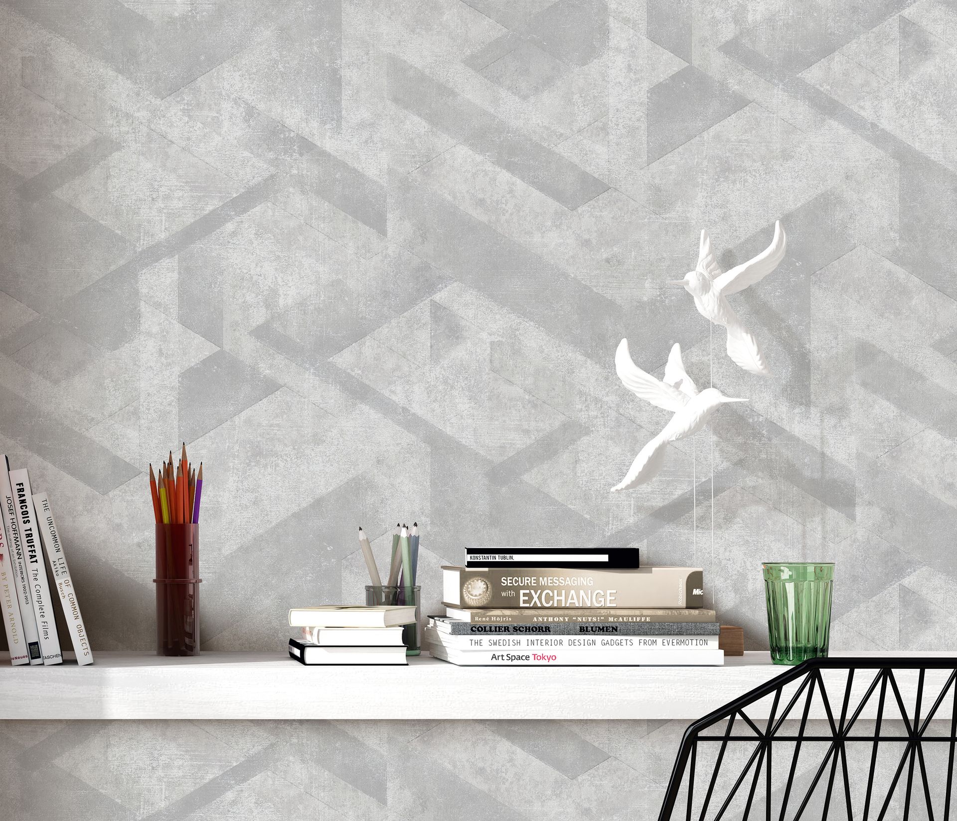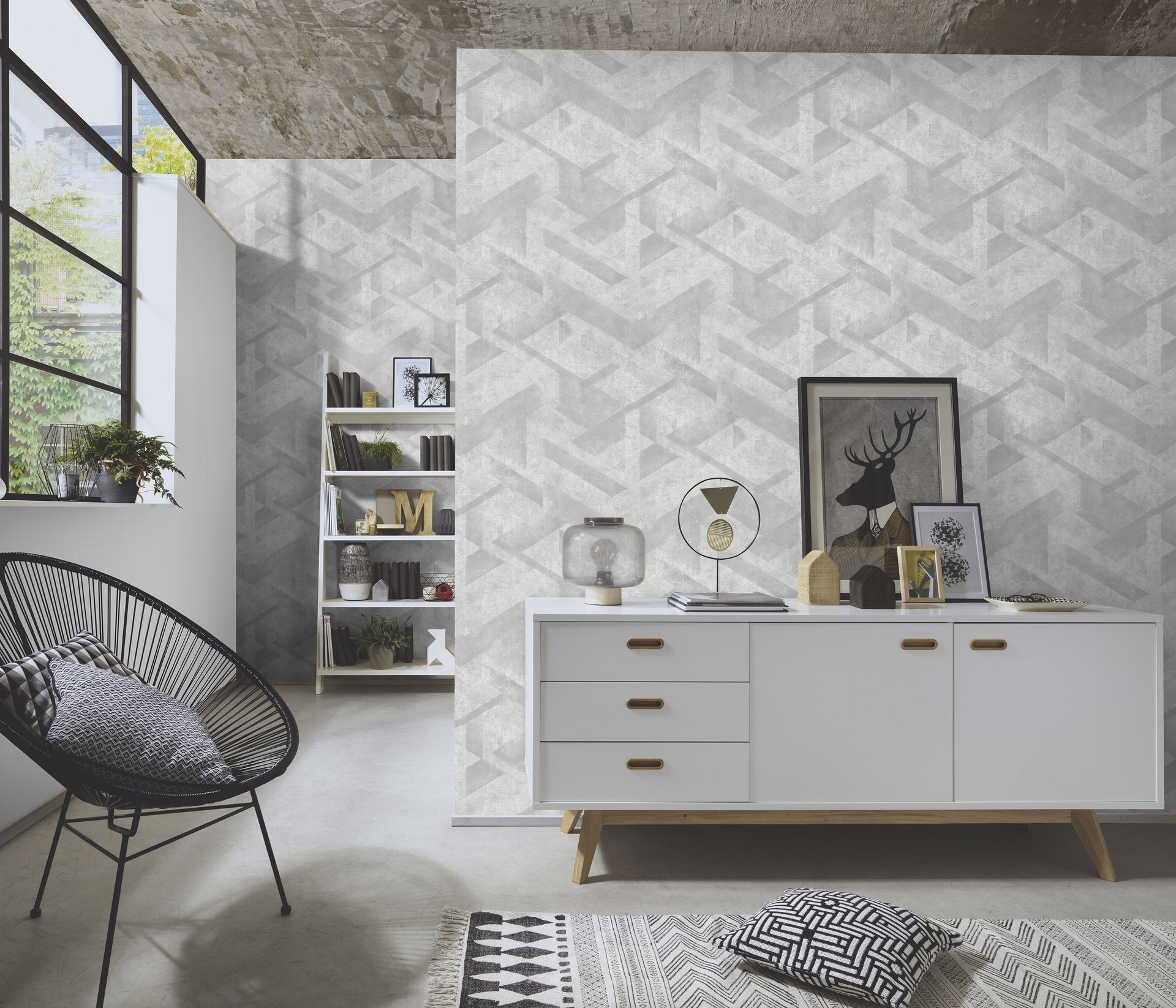 Die großflächigen geometrischen Muster verleihen Räumen eine moderne, architektonische Anmutung und passen hervorragend zu Industrial- und Loft-Einrichtungen. Durch den niedrigen Kontrast und die hellen Töne wirkt die Tapete raumvergrößernd und eignet sich sowohl für ganze Räume als auch als markante Akzentwand. Besonders in Wohnzimmer, Schlafzimmer oder Büro entfaltet das Design seine zeitlose Eleganz.