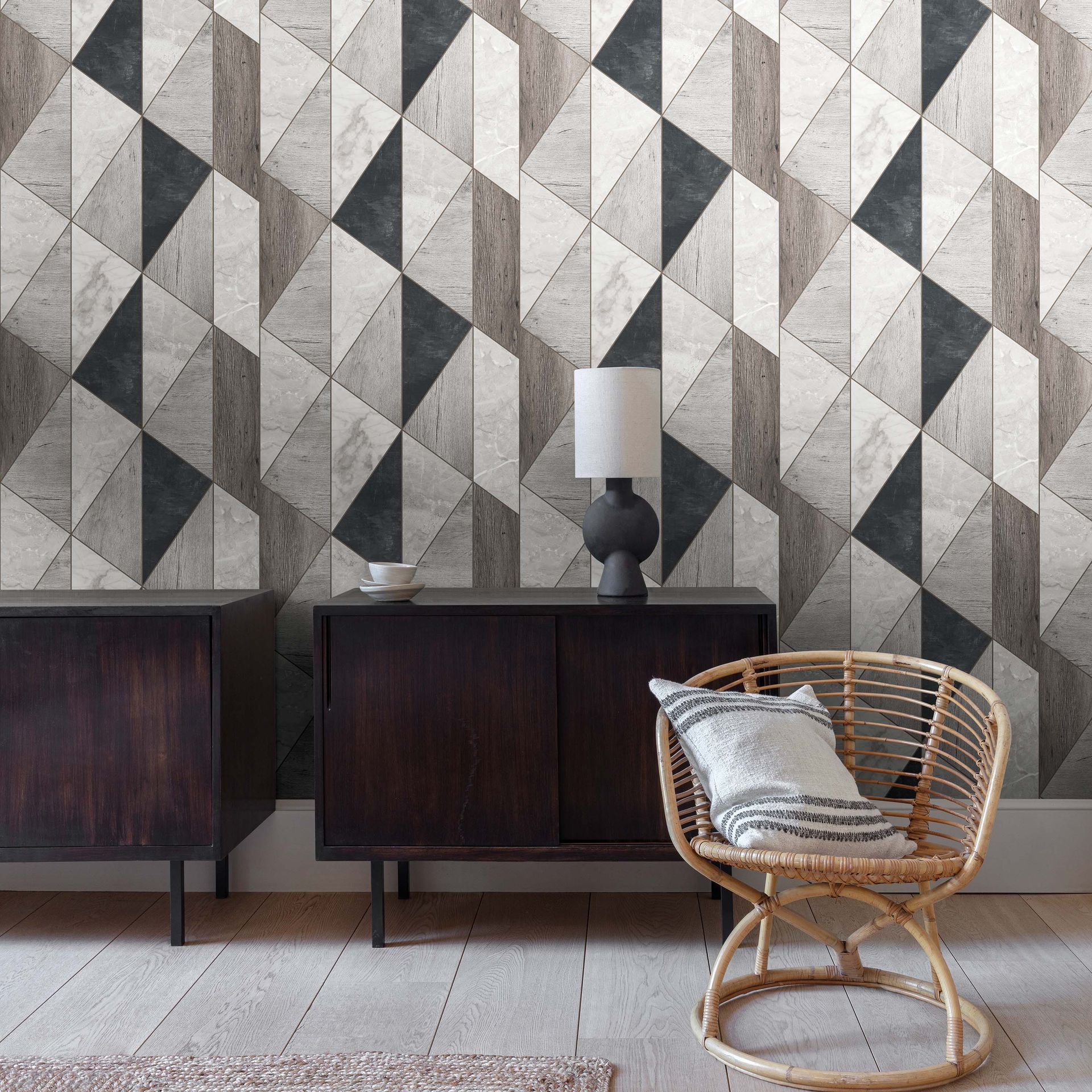 Diese zeitgenössische Tapete besticht durch ein durchdachtes geometrisches Patchwork-Design, das Materialoptiken meisterhaft kombiniert. Rechteckige Fliesenelemente in Marmor-, Holz- und Schieferoptik sind zu dynamischen Diagonalmustern arrangiert und schaffen eine faszinierende visuelle Tiefenwirkung.
