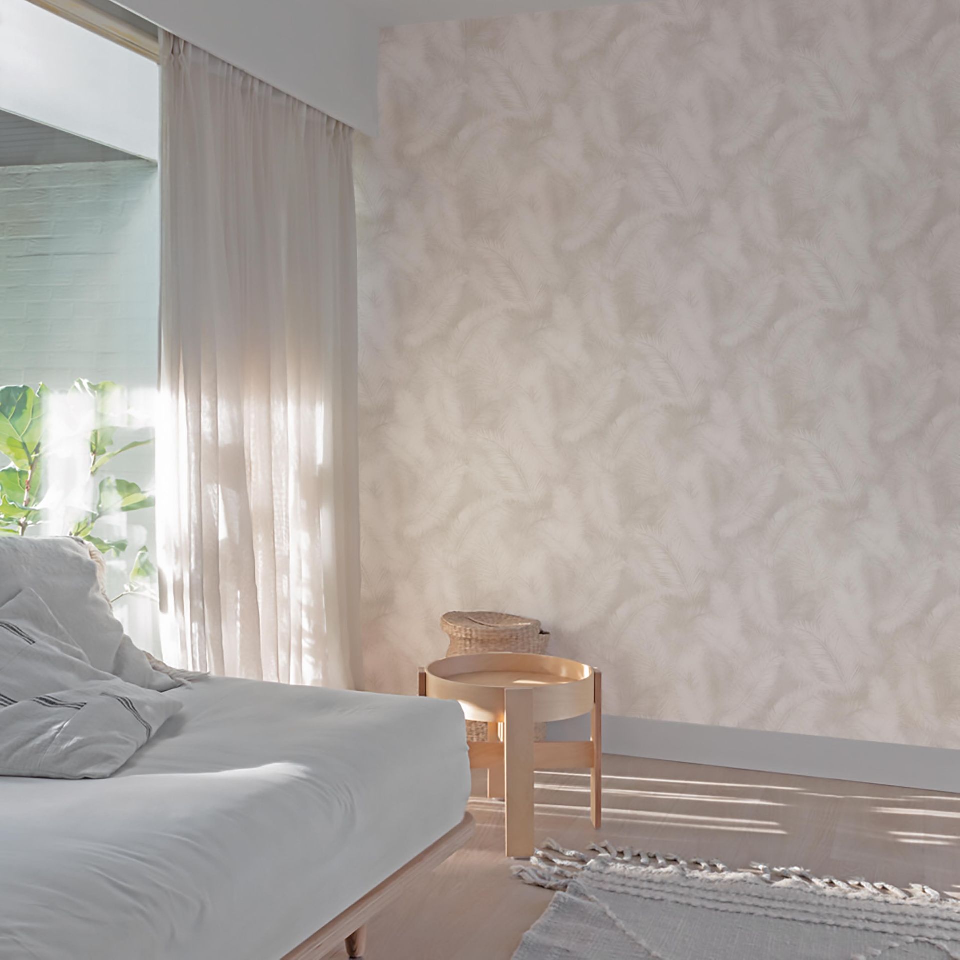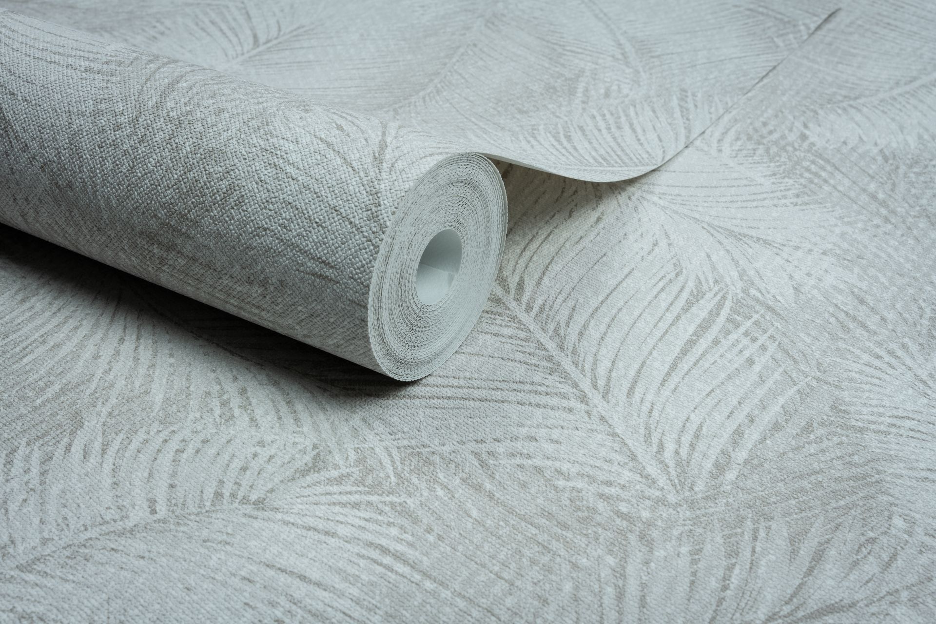 Diese elegante Tapete aus der Arcadia-Kollektion besticht durch ihr feines botanisches Muster aus gezeichneten Palmwedeln. Die fließenden, linienartigen Strukturen der Blätter erzeugen eine beruhigende Naturoptik, die zwischen klassischer Eleganz und modernem Design balanciert.