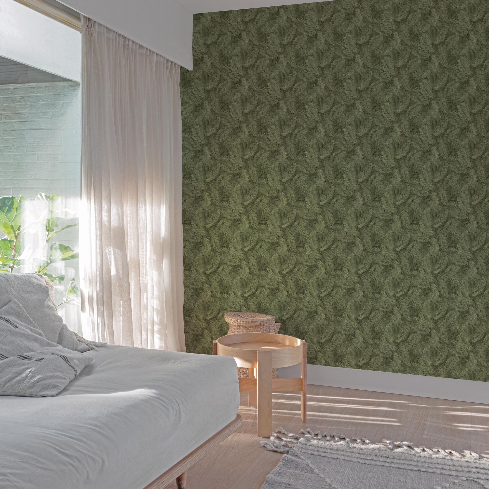Die monochrome Farbgebung in verschiedenen Grünabstufungen schafft eine harmonische, ruhige Raumatmosphäre ohne dabei langweilig zu wirken. Das Muster eignet sich hervorragend für eine ganzen Raum zu gestalten, kann aber auch gezielt als Akzentwand eingesetzt werden, um einen natürlichen Ankerpunkt zu schaffen. Die subtile Texturierung verstärkt die hochwertige Anmutung.