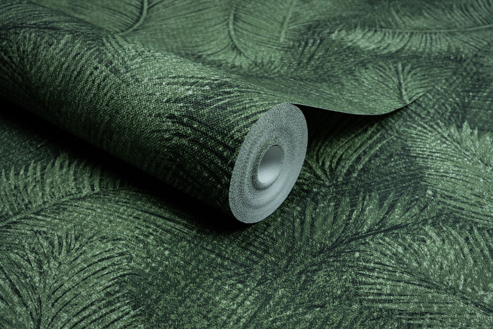 Diese elegante Tapete besticht durch ein naturbewusstes Palmblatt-Muster, das in sanften Grüntönen auf einem muted-grünen Untergrund arbeitet. Die feinen, parallel verlaufenden Linien der Blätter erzeugen eine organische, fließende Bewegung, die beruhigend und gleichzeitig visuell lebendig wirkt.