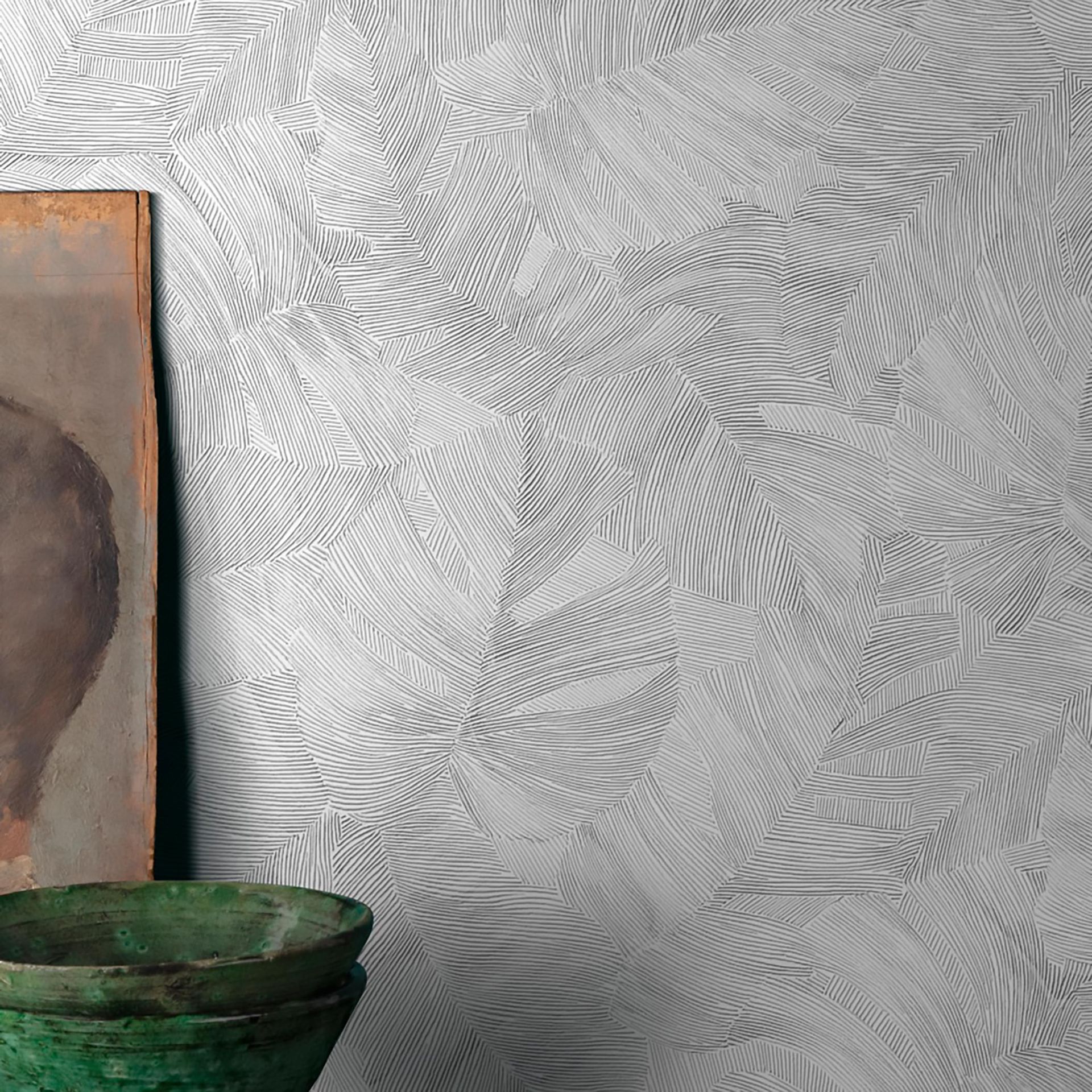 Diese elegante Tapete aus der Karuna-Kollektion überzeugt mit einem subtilen, durchgehend wiederholten Blattlinien-Muster. Feine parallel verlaufende Linien bilden stilisierte Blattformen, die sich in ruhiger, organischer Anordnung über die Fläche verteilen. Das Muster wirkt zeitgenössisch und zugleich zeitlos – geprägt von minimalistischem Design mit natürlichen Referenzen.