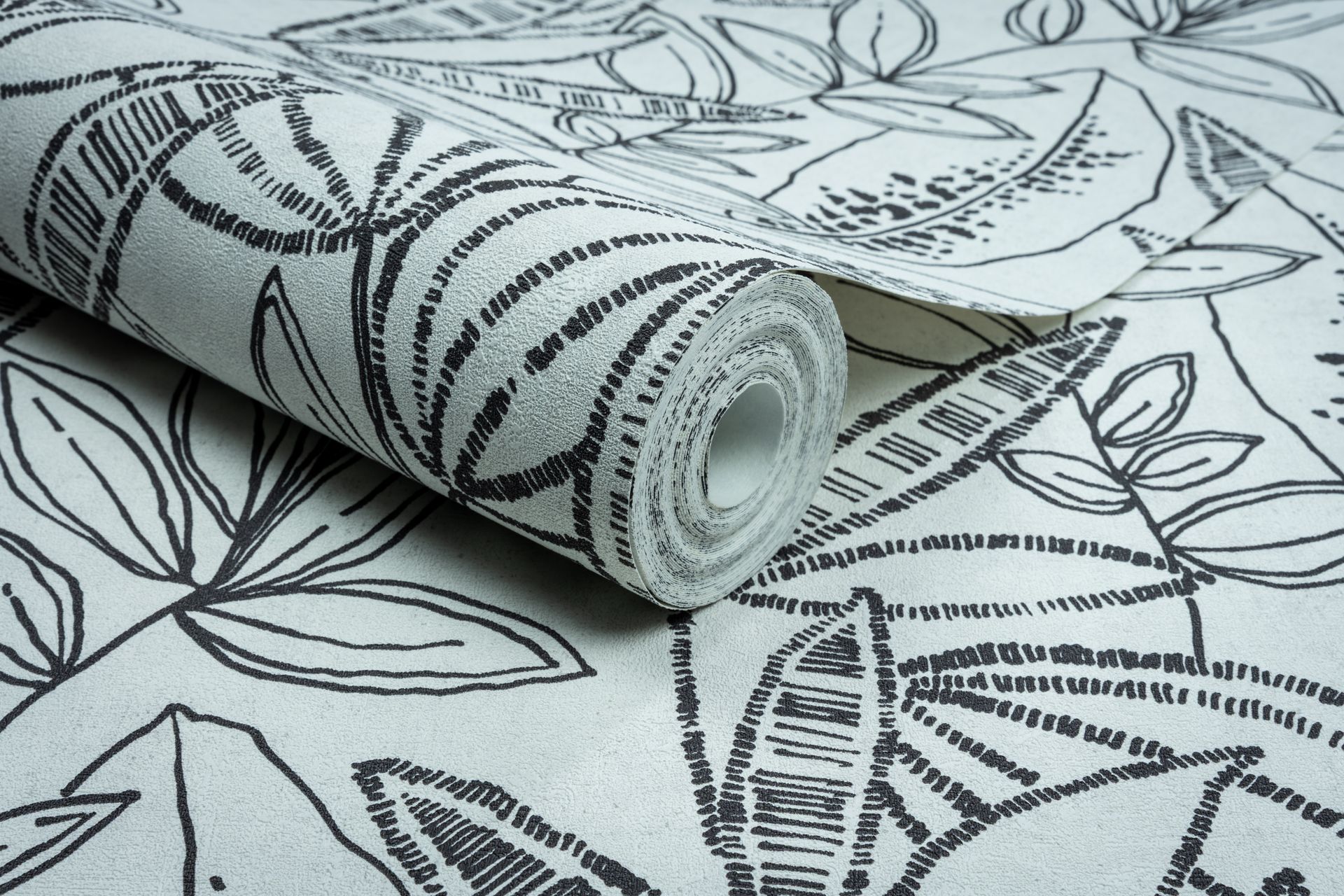 Diese elegante Tapete präsentiert ein durchdachtes botanisches Muster, das moderne Grafik mit natürlicher Ästhetik verbindet. Großflächige Blätter in feinen Linien wechseln sich mit detaillierten Strukturmustern ab, die an Blattadern und Pflanzendetails erinnern. Die Kombination von geschlossenen Blattformen und feinen Strichzeichnungen schafft eine ruhige, dennoch visuell interessante Komposition auf hellem Untergrund.