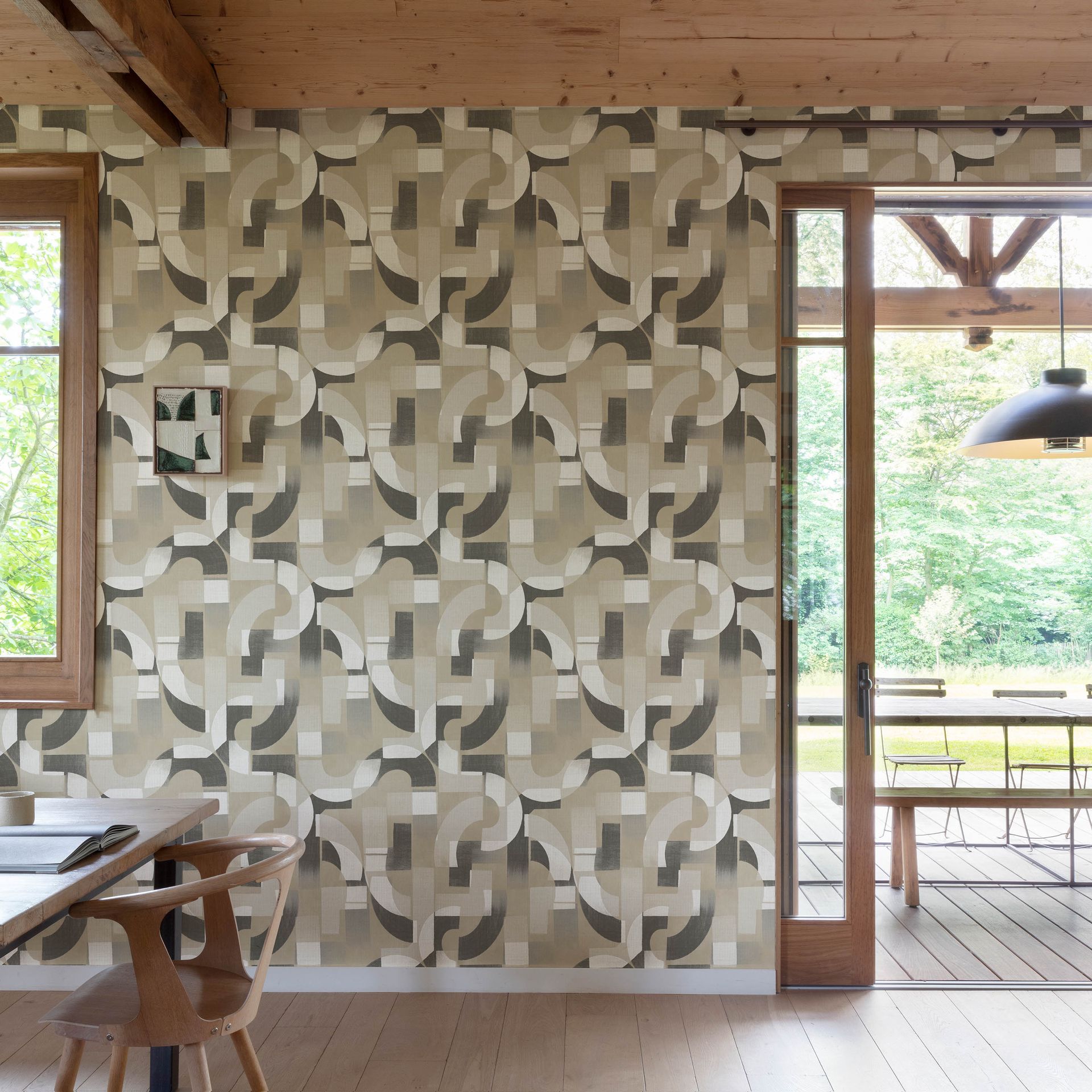 Diese moderne Tapete aus der Kollektion Karuna verbindet klare geometrische Strukturen mit organisch fließenden Formen zu einem zeitgenössischen Gesamteindruck. Die Komposition aus rechteckigen Elementen und geschwungenen Kreissegmenten schafft eine dynamische, dennoch ausgewogene Bildsprache, die zum genauen Hinschauen einlädt.
