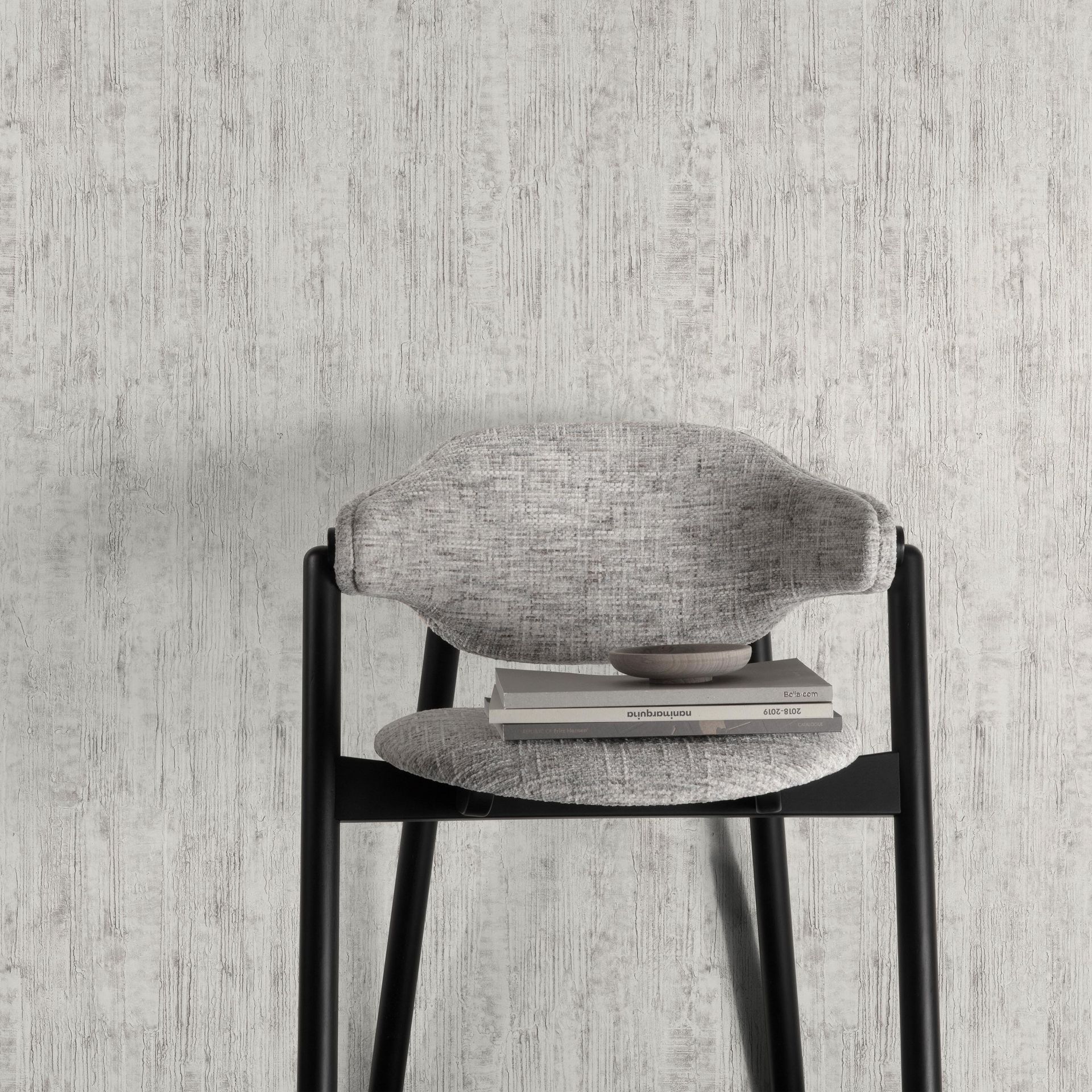 Die horizontal über die Fläche verteilten, langgestreckt wirkenden Strukturlinien erzeugen eine leichte Bewegtheit, ohne dabei aufdringlich zu wirken. Die monochrome Palette aus Creme, Hellgrau und dunklen Grautönen gibt einer Raum Eleganz, ohne ihn zu überlasten. Die Oberflächengestaltung suggeriert eine subtile Rauheit und Rustikalität mit modernem Anspruch.