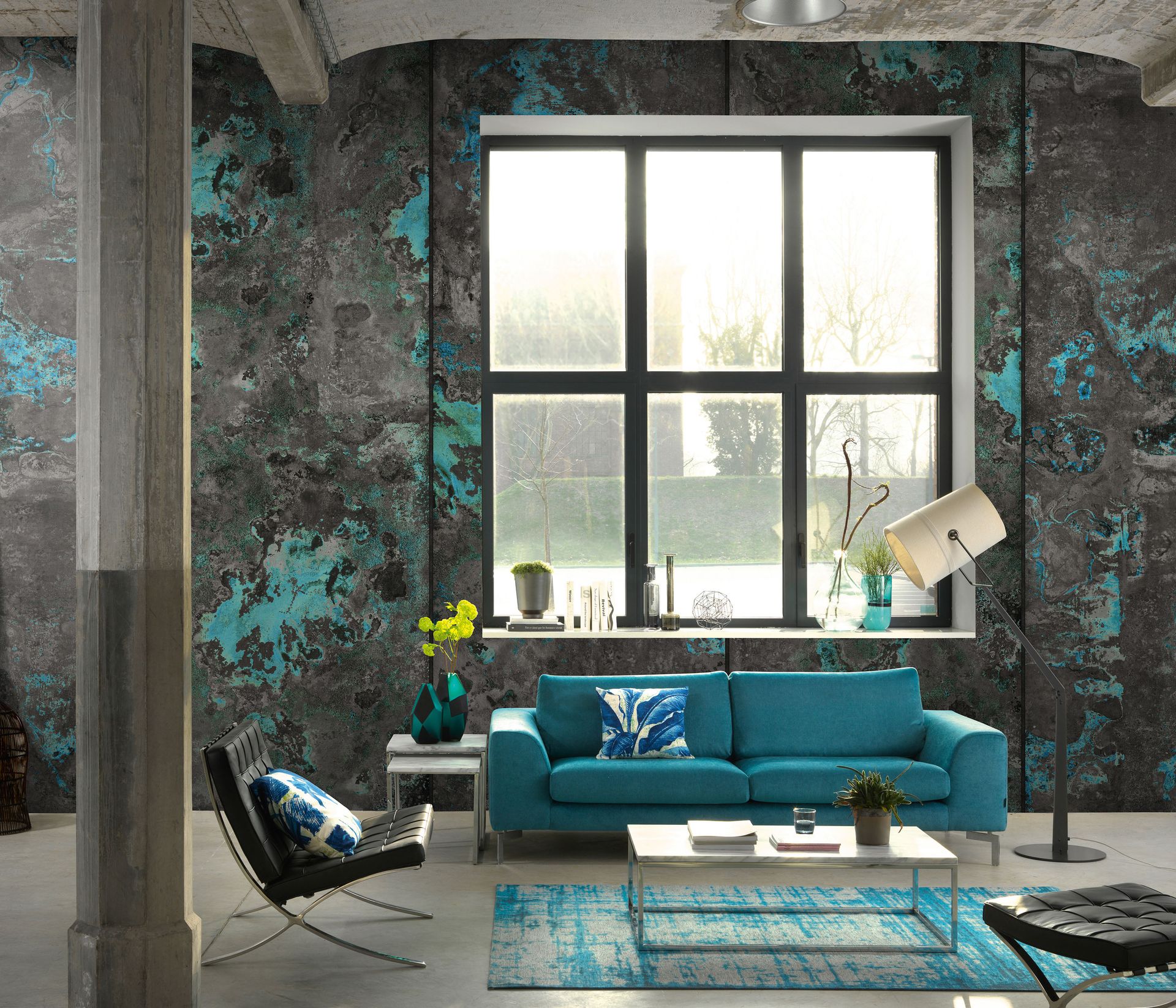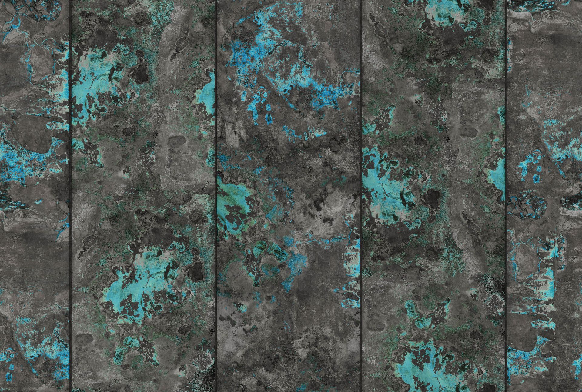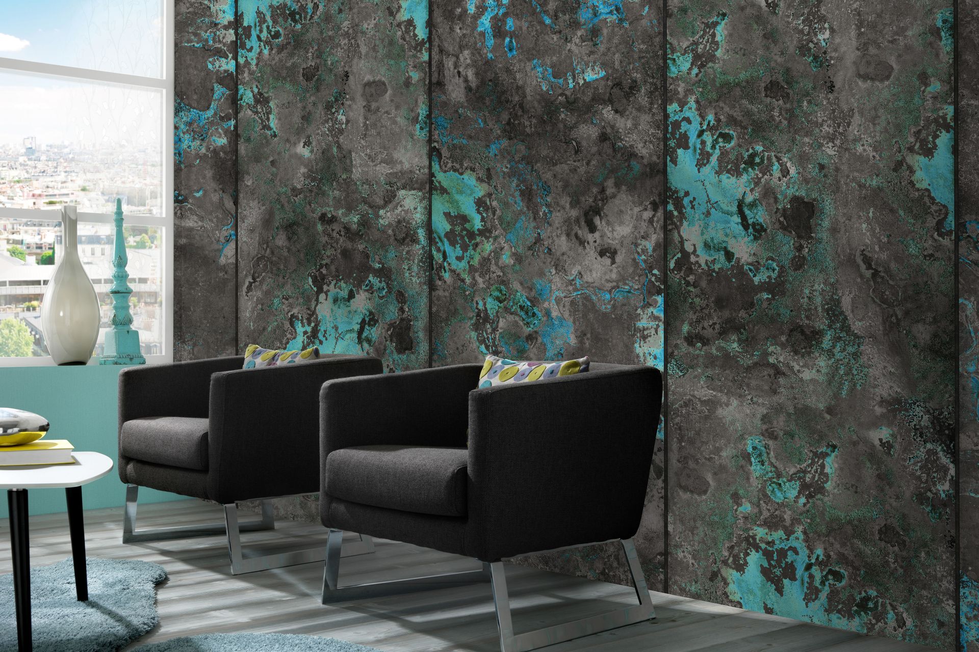 Industrial-Tapete mit oxidierter Metalloptik in Türkis-Grau