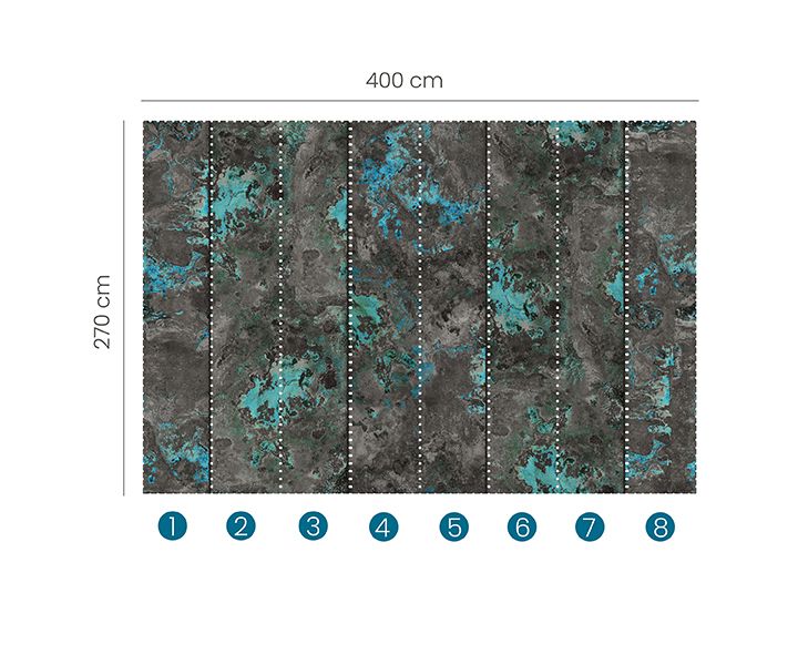 Die kühle Farbgebung mit ihren dramatischen Kontrasten zwischen dunklem Grau und leuchtenden Türkistönen schafft eine urbane, charakterstarke Atmosphäre. Der schimmernde Metallic-Effekt verleiht der Oberfläche Tiefe und lässt sie je nach Lichteinfall lebendig wirken. Diese Tapete eignet sich hervorragend als Akzentwand in Wohnräumen, die einen modernen Industrial-Stil mit urbanem Charakter verkörpern sollen.