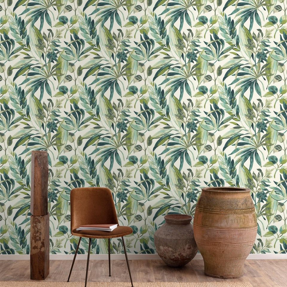 Naturnahe Tapeten mit ruhigen Blatt- und Strukturmustern in Erdtönen für ein entspanntes, organisches Wohnambiente.