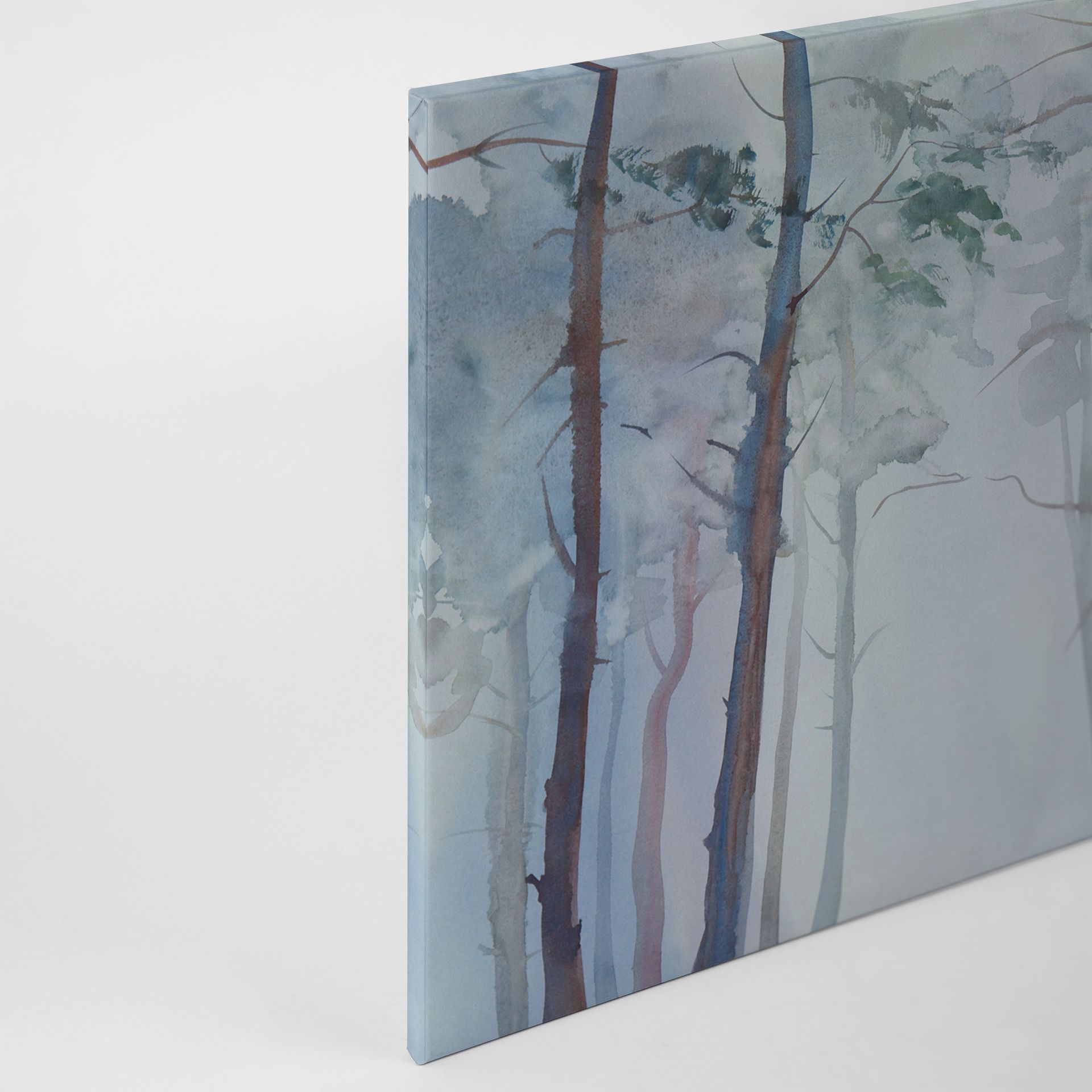 Dieses ätherische Leinwandbild, präsentiert in Aquarelltechnik, entführt den Betrachter in einen nebelverhangenen Wald. Mysteriöse, in Blautönen gehaltene Bäume stehen im Vordergrund, umgeben von sanften Grau- und Grünnuancen, die das Spiel von Licht und Schatten im Wald einfangen. Die braunen Farbtupfer der Baumstämme verleihen dem Bild eine natürliche Wärme, während weiße Freiräume die Illusion von Nebelschwaden verstärken. Dieses Kunstwerk ist ideal für Liebhaber der Natur und sorgt für eine beruhigende Atmosphäre in jedem Raum.