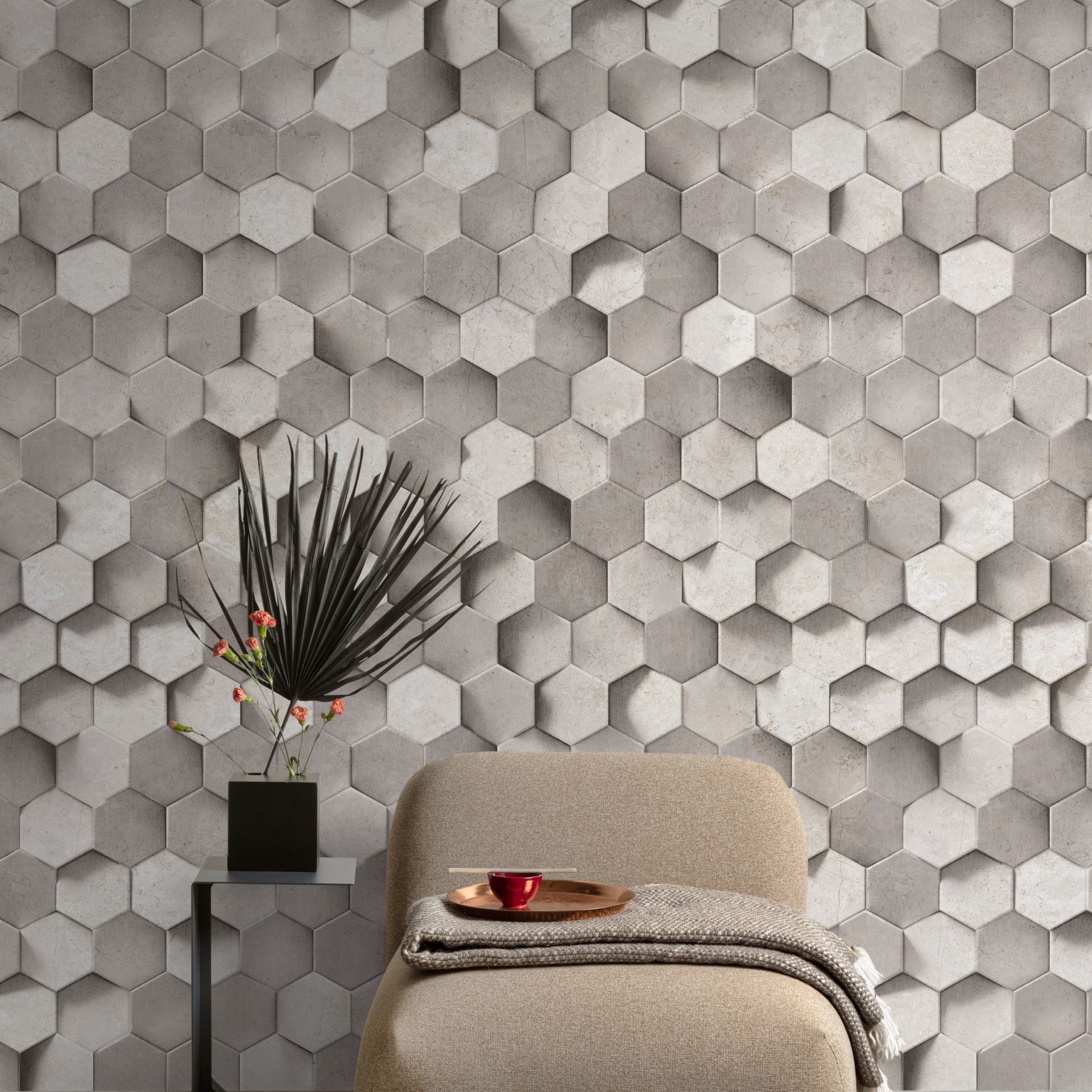 Die neutralen Farbtöne ermöglichen flexible Kombinationsmöglichkeiten mit verschiedenen Einrichtungsstilen. Die räumliche Optik macht diese Tapete ideal für Akzentwände in Wohnzimmern, Fluren oder Schlafzimmern. Der geometrische Charakter verleiht Räumen moderne Eleganz ohne dabei überladen zu wirken – perfekt für zeitgenössische und minimalistische Interieurs.