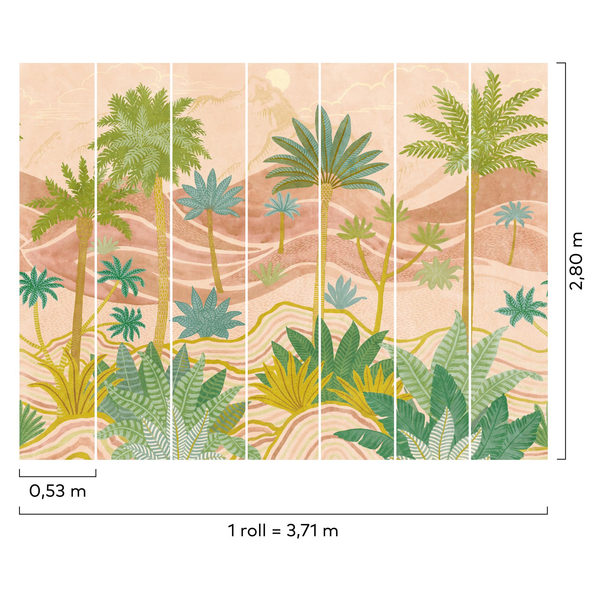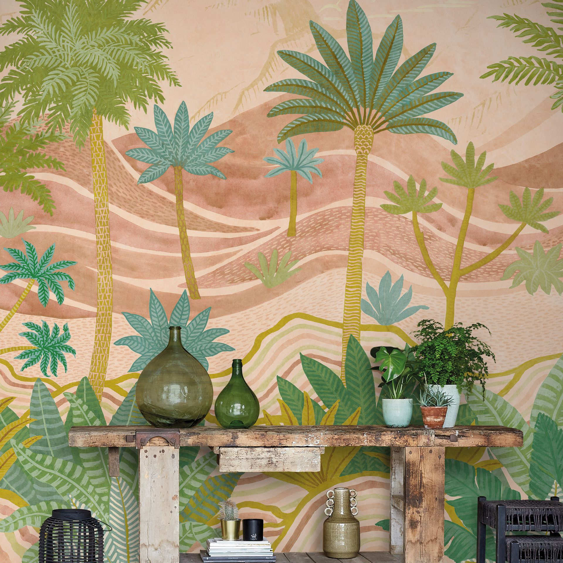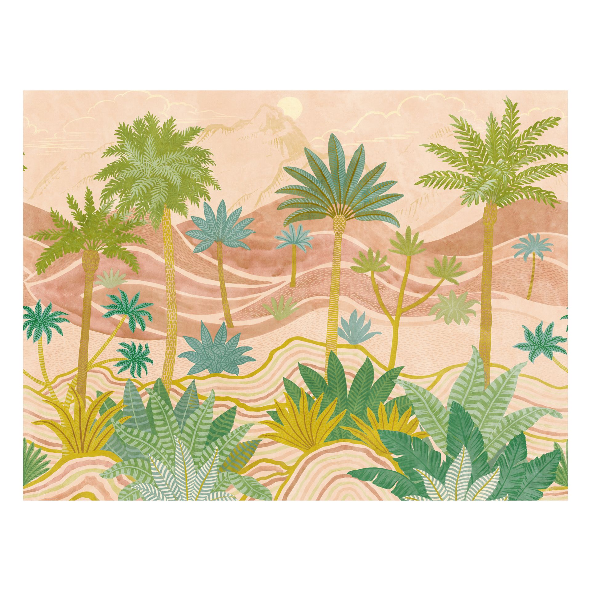 Diese illustrative Tapete entführt in eine romantisierte Wüstenlandschaft mit vielfältigen Palmen und Agaven. Das großflächige Szenario zeigt stilisierte Pflanzen in verschiedenen Grüntönen vor sanften Hügeln in Beige, Rosa und Creme. Die detaillierte Zeichnung der Blattstrukturen und die Variation der Pflanzengröße schaffen Tiefenwirkung und visuelle Bewegung.