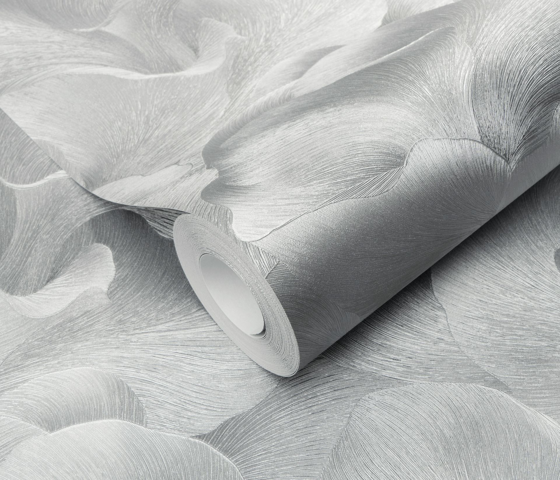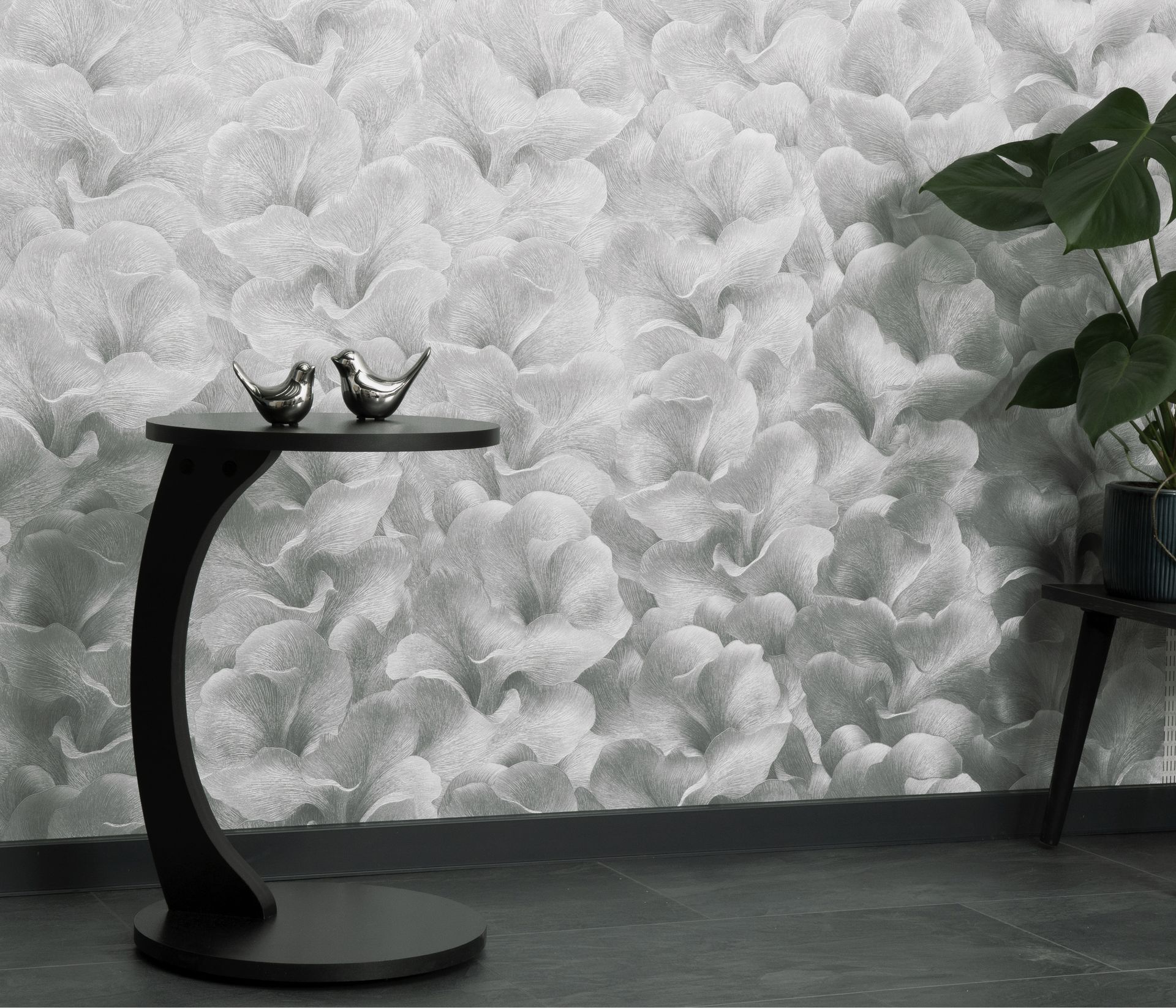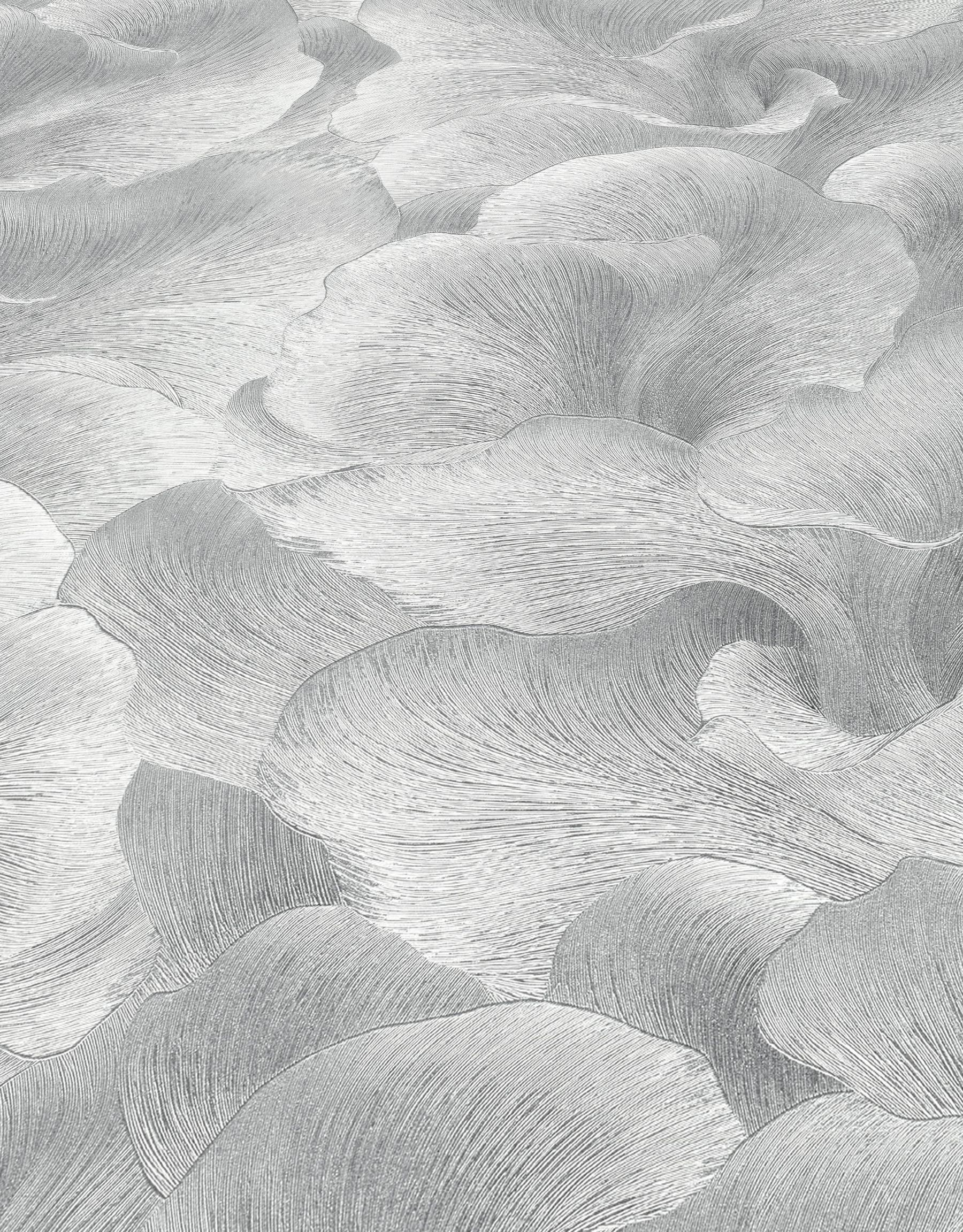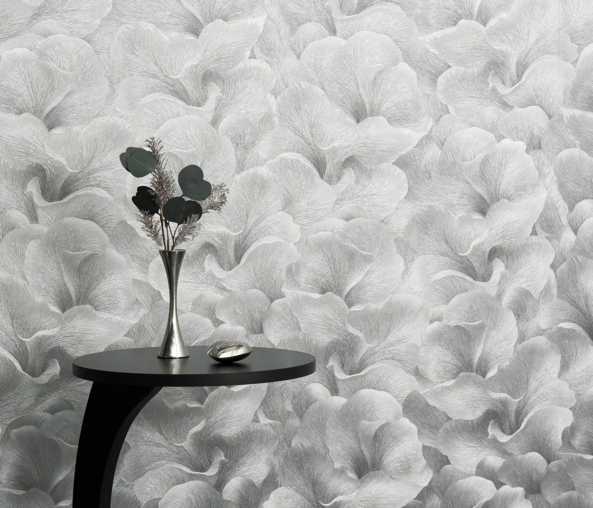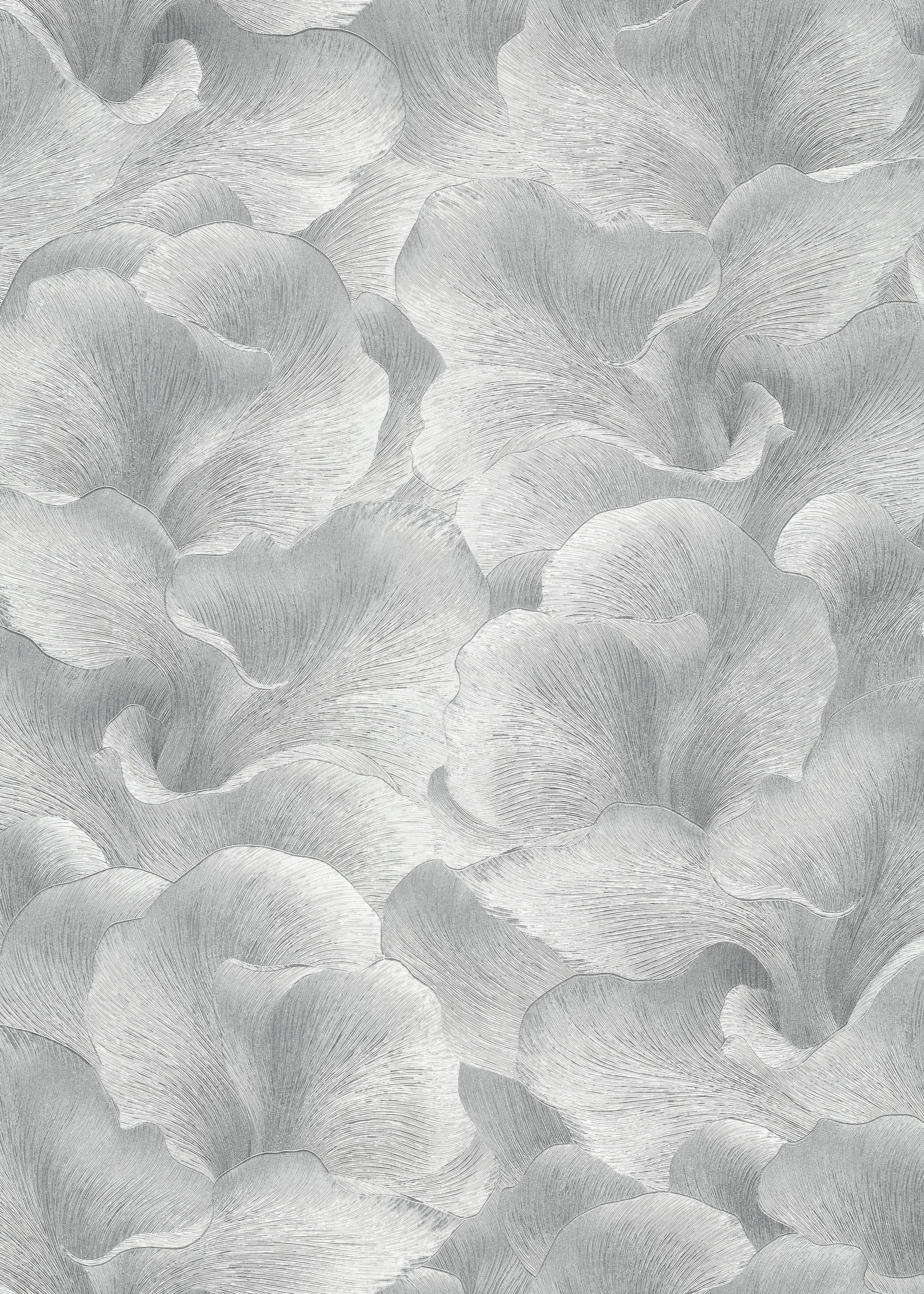 Diese botanische Tapete zeigt großflächige fließende Blütenmuster in einer eleganten Grau-Weiß-Kombination. Die fächerförmigen Blätter mit ihrer feinen Linienstruktur überlappen sich organisch und bilden ein natürliches, fließendes Muster. Die dezente Farbgebung mit sanften Grauabstufungen und schimmernder Oberflächenwirkung verleiht dem Design eine zeitlos-elegante Anmutung.