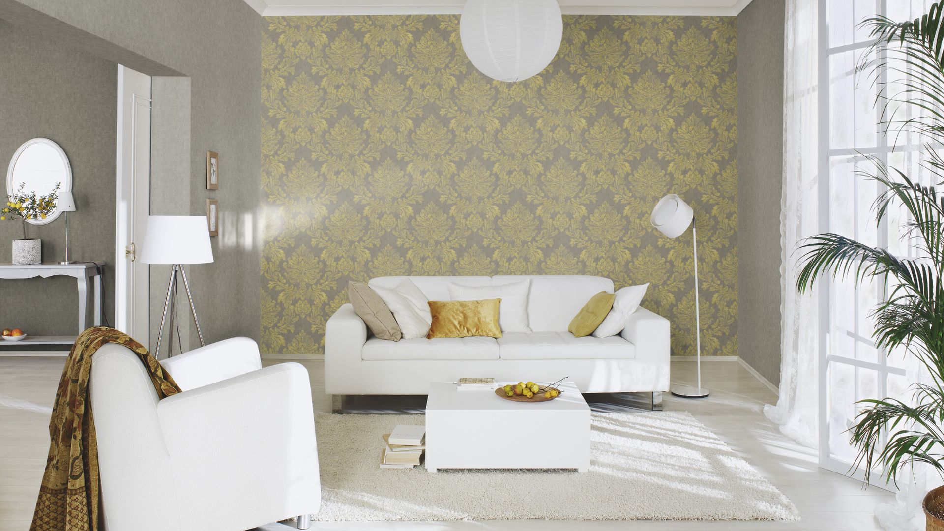 Stuckelemente dürfen jetzt nicht nur Decken zieren, sondern auch Wände schmücken. Gut, dass die barocken Ornamente so üppig und großformatig ausfallen, so zeichnet sich das sanfte Senfgelb toll von dem dunklen Grauton ab. Faszinierend ist auch die hinterlegte Textilstruktur, die den geliebt-gelebten Charme der Tapete schön unterstreicht.