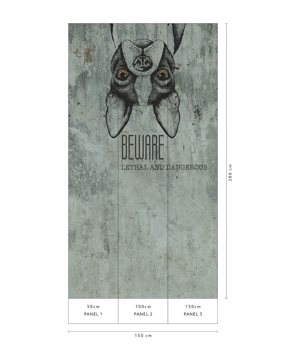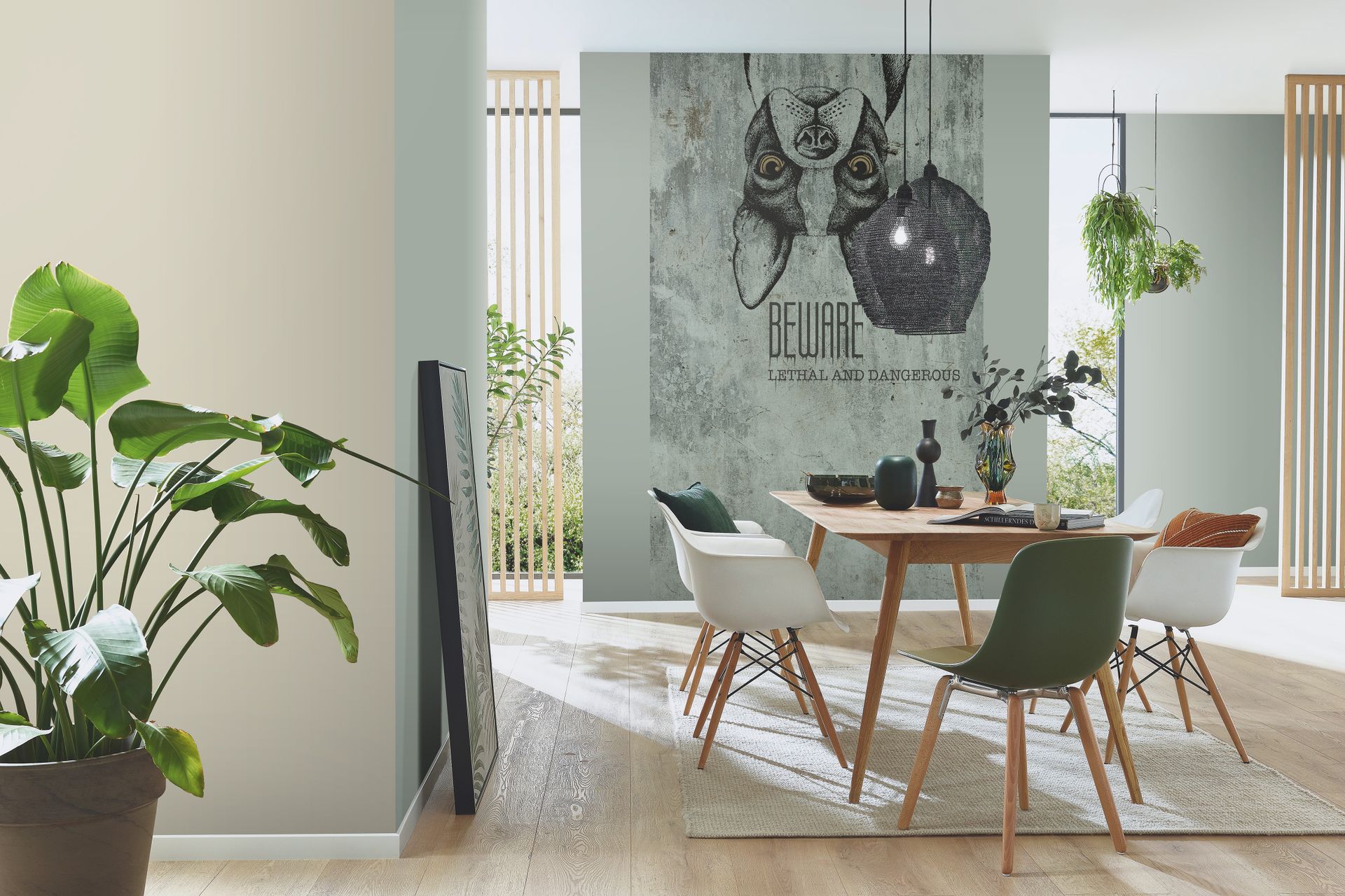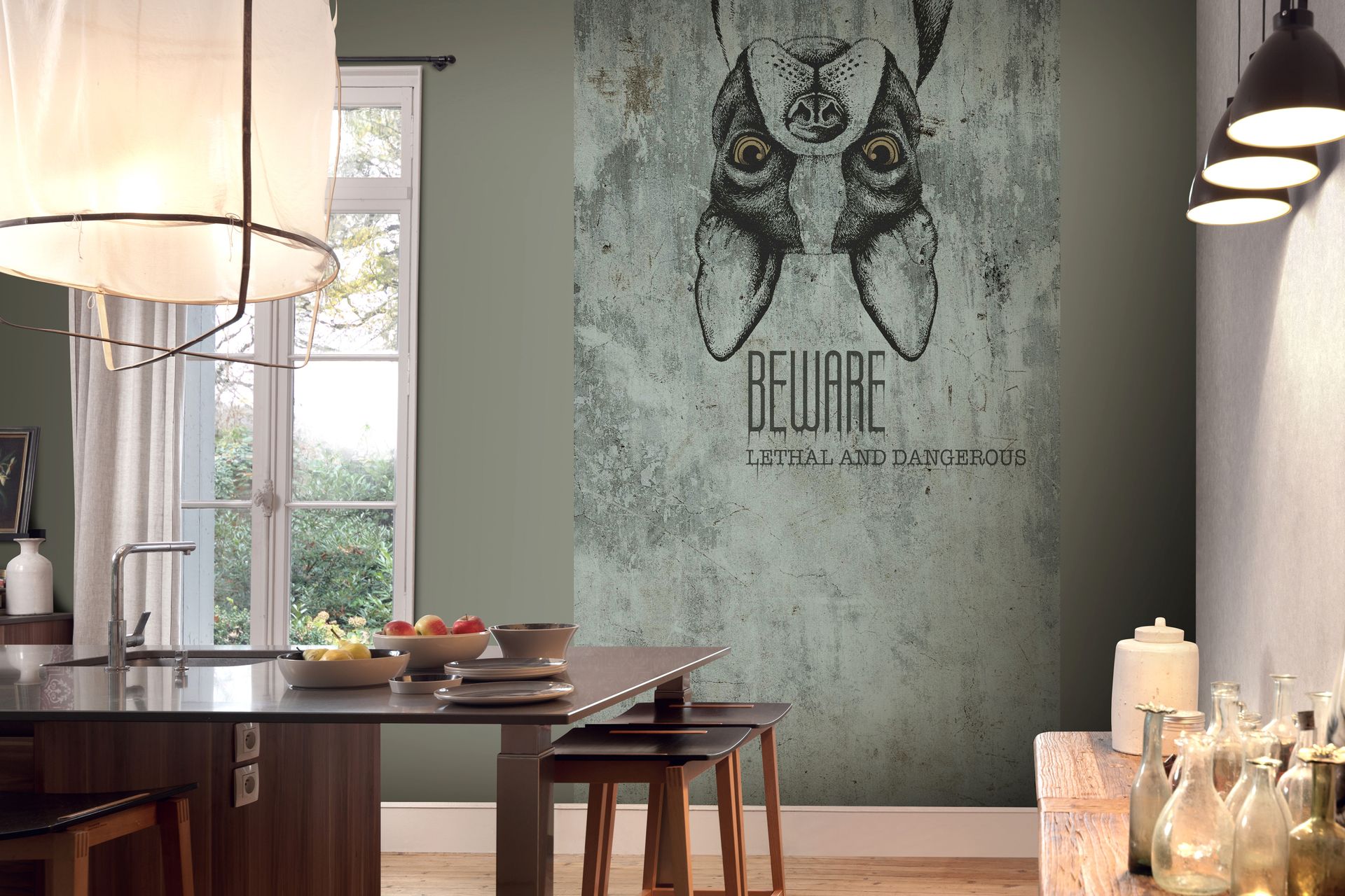 Diese außergewöhnliche Tapete aus der Elle Decoration 3 Kollektion bringt urbane Street-Art-Ästhetik in den Raum. Auf einer mint-grünen Betonoptik mit authentischen Abriebspuren zeigt sich ein auf den Kopf gestellter Hundekopf in detaillierter Schraffurtechnik. Die goldenen Augenakzente und der provokante Schriftzug 'BEWARE LETHAL AND DANGEROUS' verleihen dem Design eine rebellische Note.
