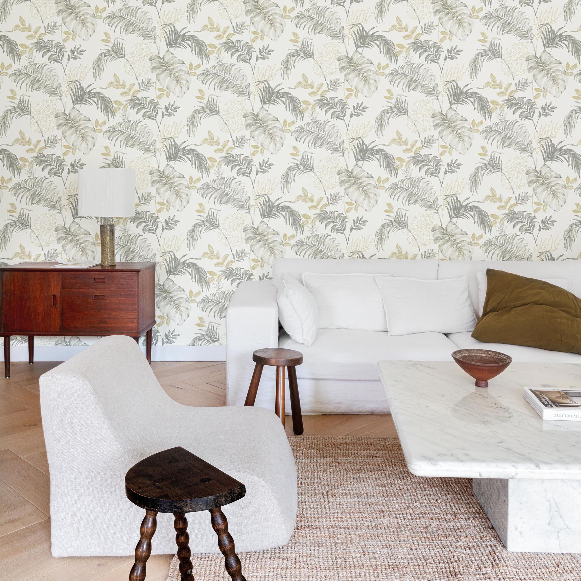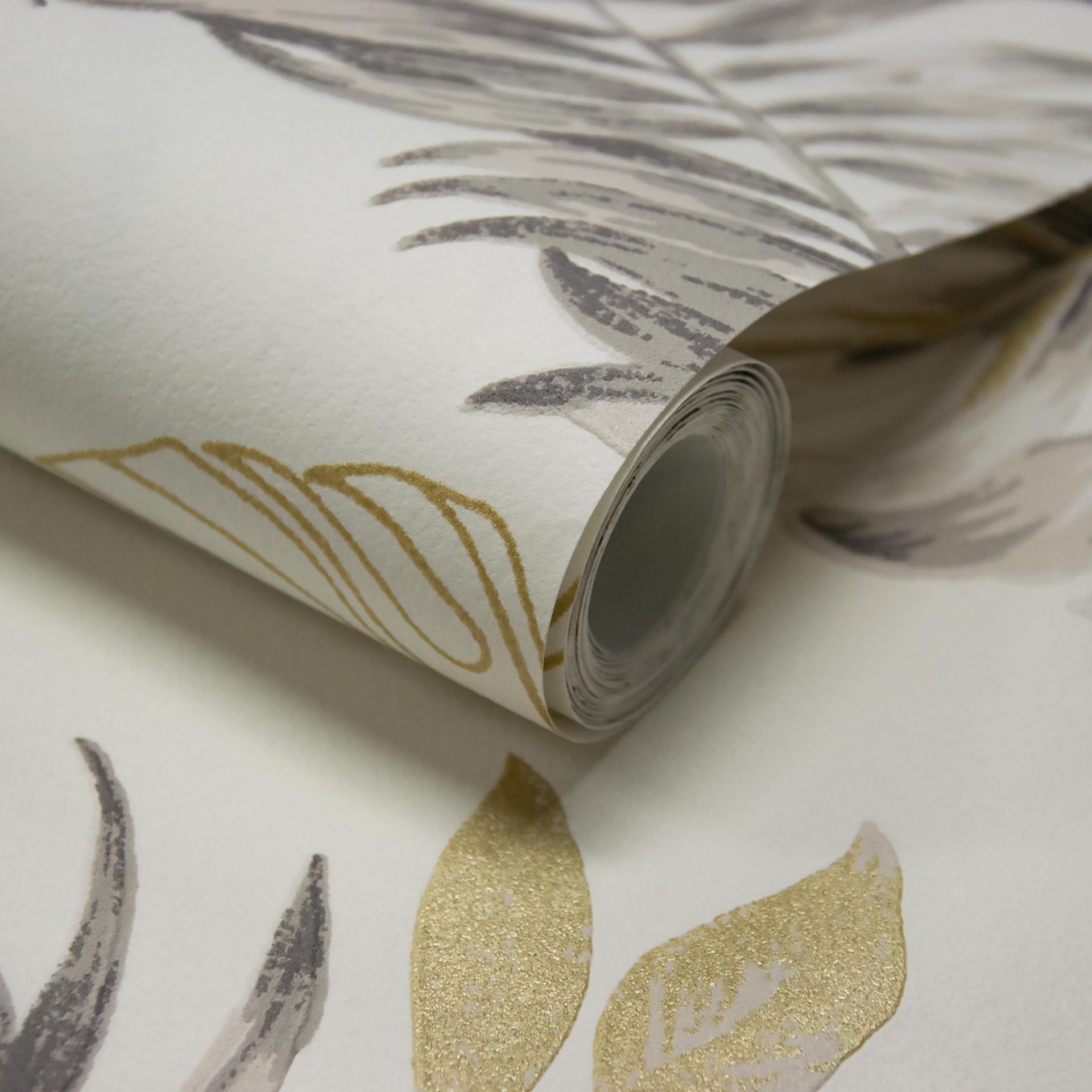 Diese elegante Tapete besticht durch ein subtiles botanisches Musterdesign mit großflächigen Blatt- und Palmenmotiven. Die Kombination aus feinen Grautönen, dezenten Goldakzenten und cremefarbenem Untergrund schafft eine ruhige, natürliche Atmosphäre, die gleichzeitig modern und zeitlos wirkt.