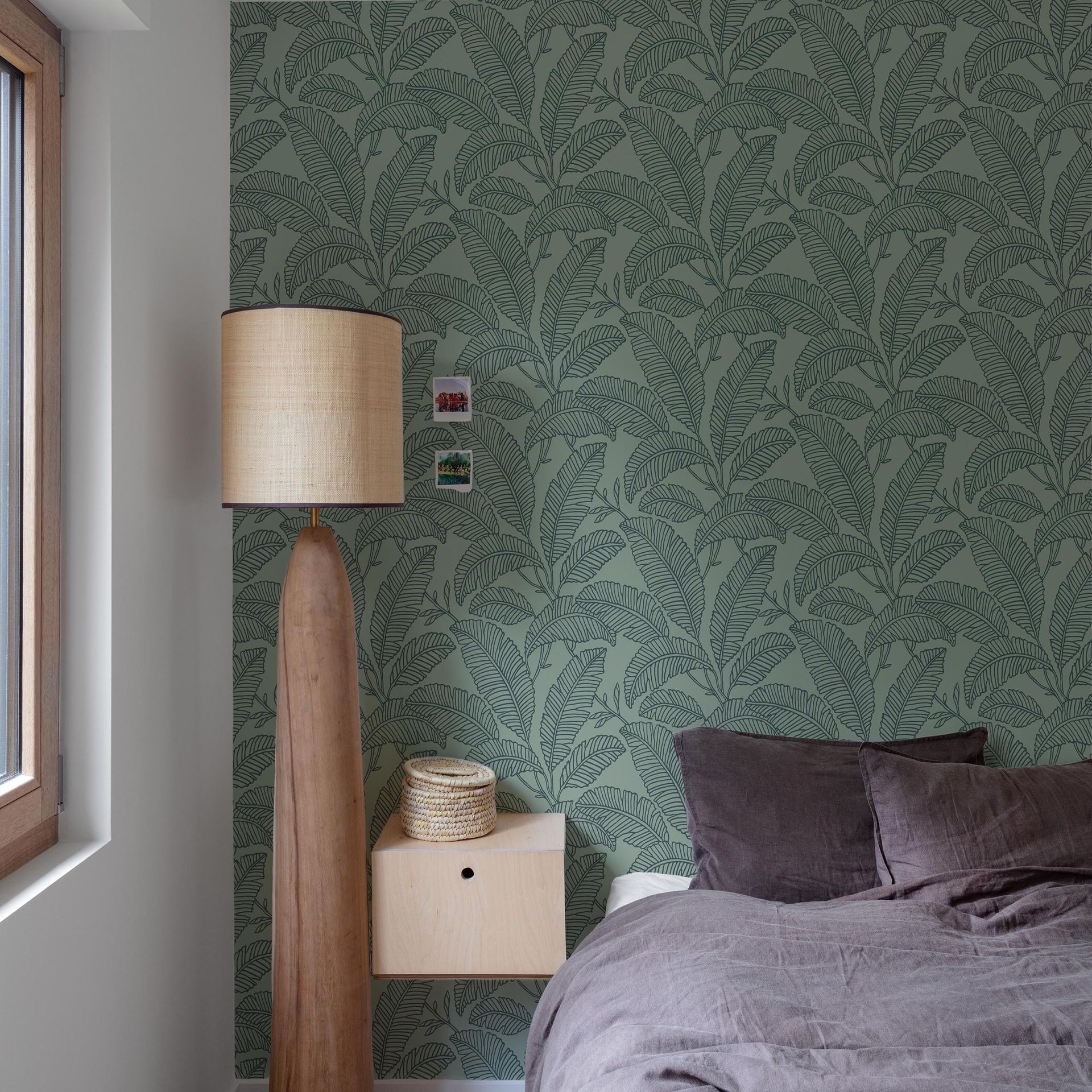 Die matte Oberflächenstruktur und das zarte Grün vermitteln einen ruhigen, natürlichen Charakter. Die Tapete eignet sich hervorragend für die Gestaltung ganzer Räume, da das Muster trotz seiner Präsenz nicht aufdringlich wirkt. In Schlafzimmern schafft sie eine entspannende Umgebung, in Wohnzimmern wirkt sie elegant und geerdet.