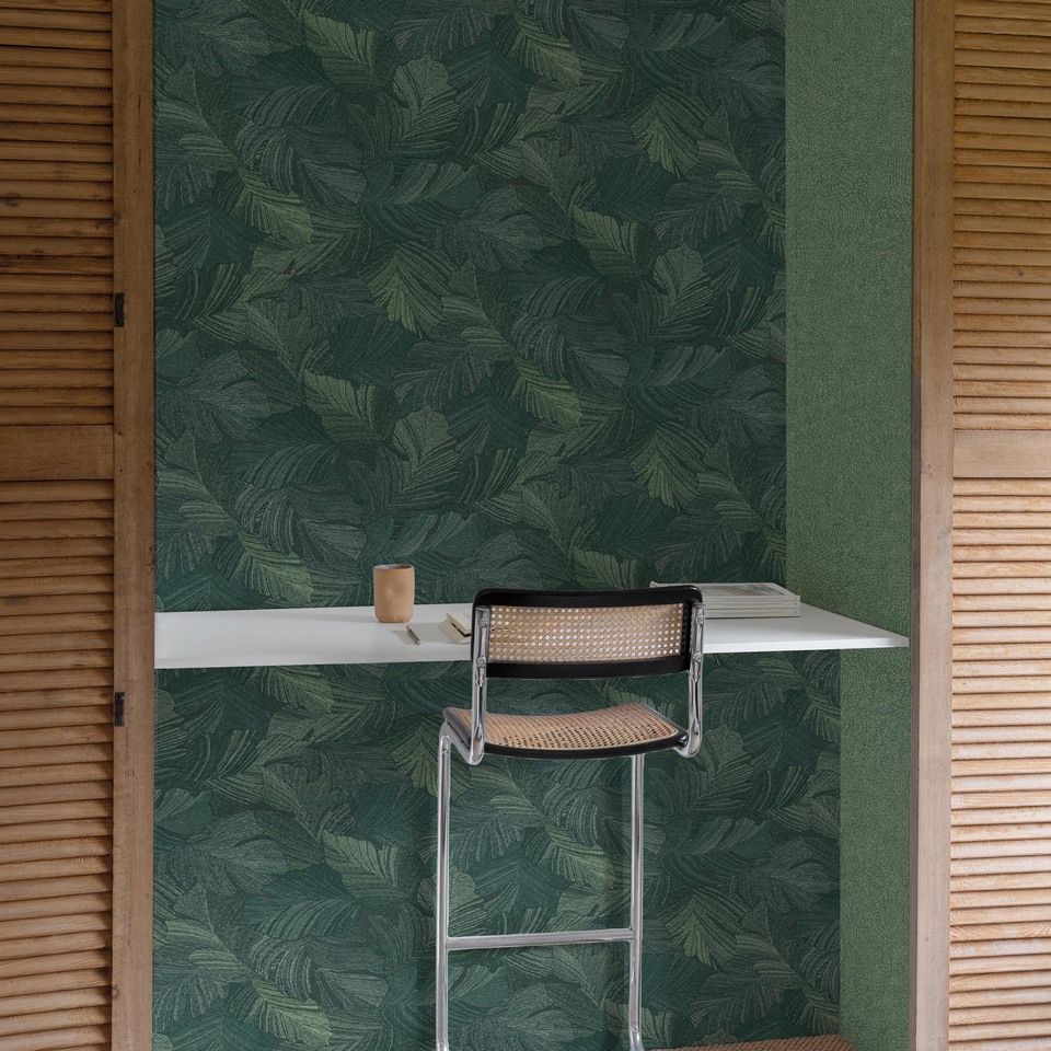 Diese elegante Tapete besticht durch ihr subtiles, großflächiges Blättermuster aus feinen Linienzeichnungen. Die überlagernden Blattformen schaffen eine lebendige, natürliche Komposition, die Bewegung und Tiefe ausstrahlt. Das Zusammenspiel von unterschiedlichen Grünnuancen erzeugt eine harmonische, beruhigende Wirkung ohne aufdringlich zu wirken.