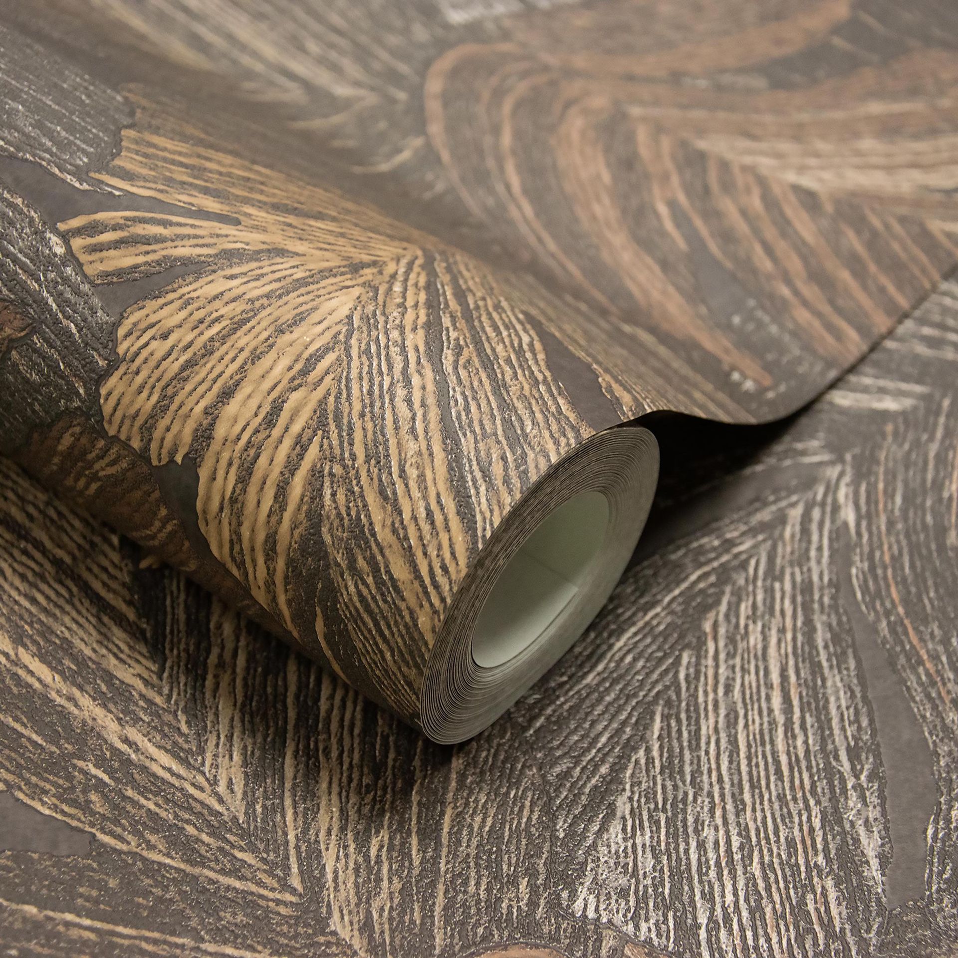 Die Farbgebung vereint warme Brauntöne und subtile Goldakzente auf einem dunkeleren Untergrund. Diese erdige Palette erzeugt eine gemütliche, gleichzeitig raffinierte Raumatmosphäre. Die Kombination aus natürlichen Farbtönen und feiner Strukturzeichnung eignet sich hervorragend zur Schaffung von stilvollen Akzentwänden in Wohnräumen. Die warmen Untertöne fördern eine einladende Atmosphäre.