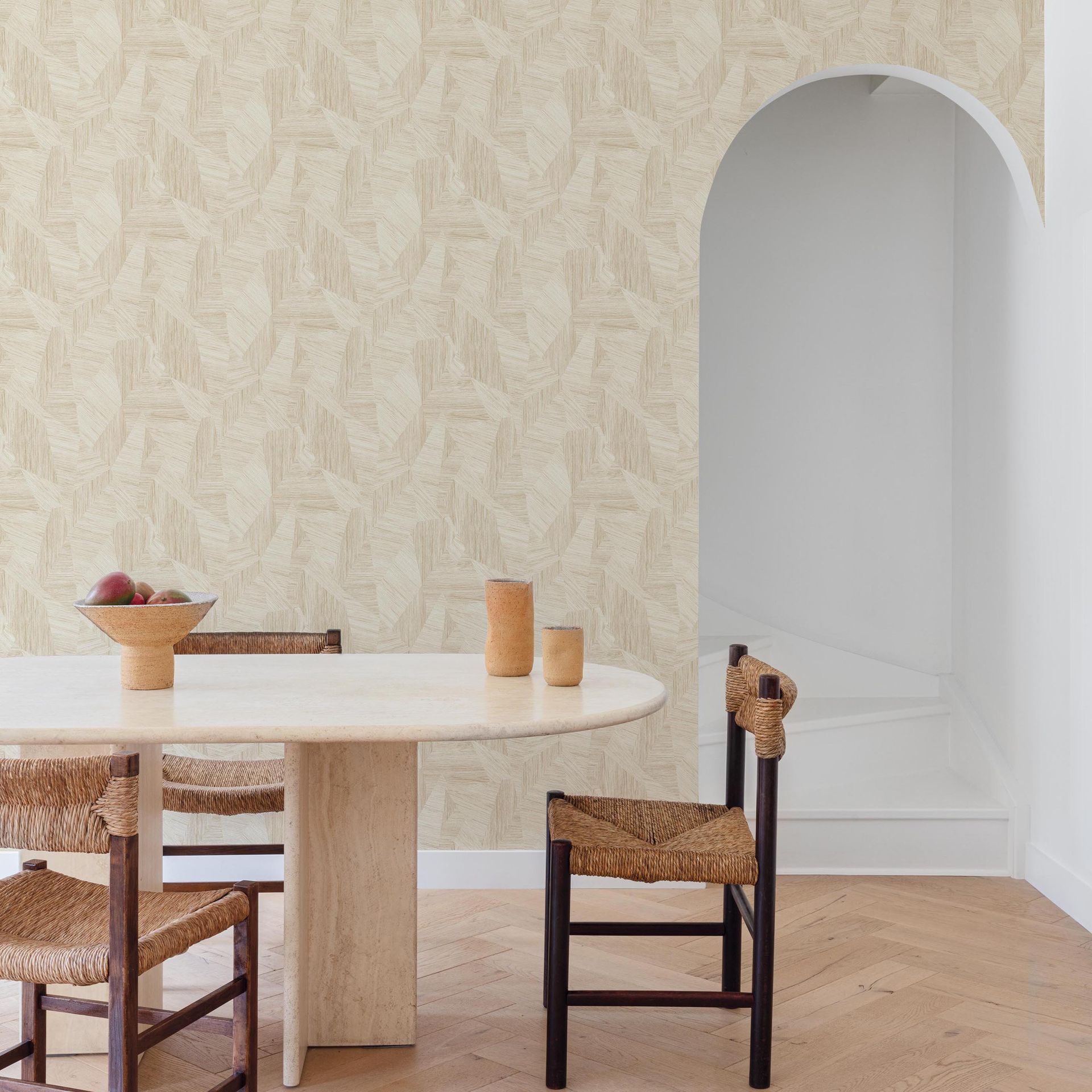 Die neutrale Farbpalette mit feinen Abstufungen zwischen hellem Creme und warmem Beige eignet sich für vielseitige Raumkonzepte. Das geometrische Muster wirkt zeitgemäß und elegant, ohne aufdringlich zu wirken. Als Akzentwand setzt die Tapete subtile architektonische Akzente; im gesamten Raum angebracht schafft sie eine kohärente, beruhigte Wandgestaltung mit visueller Textur.