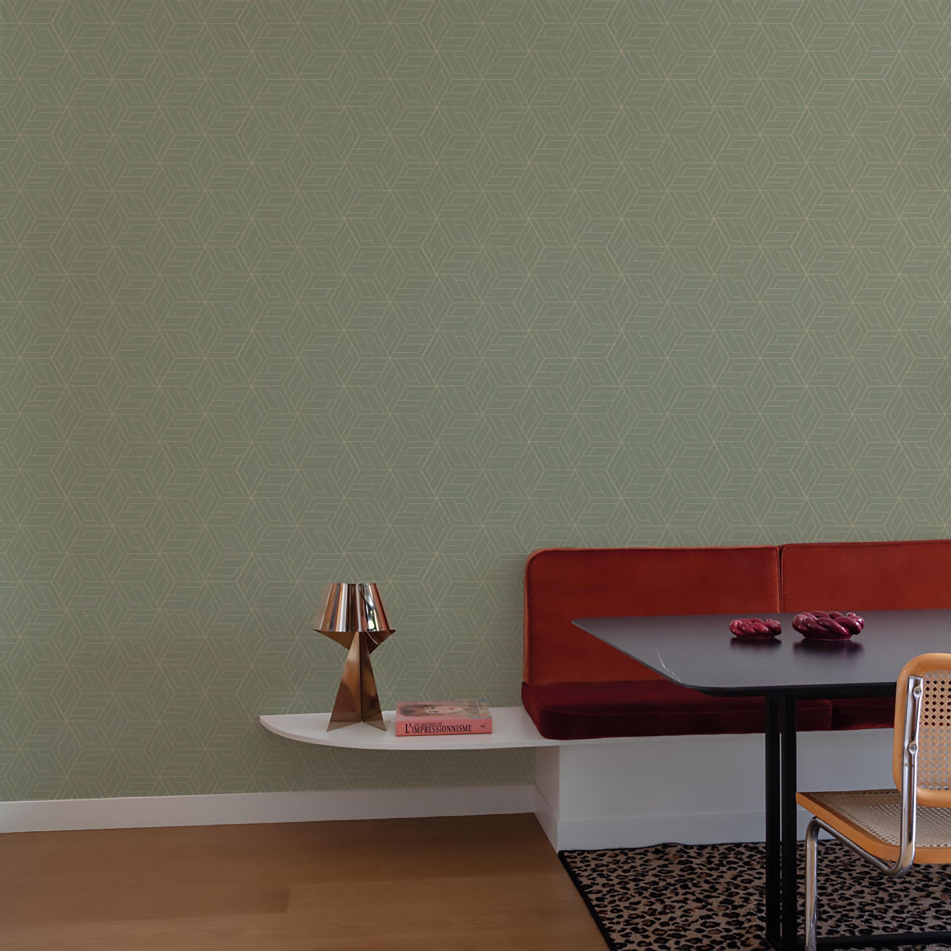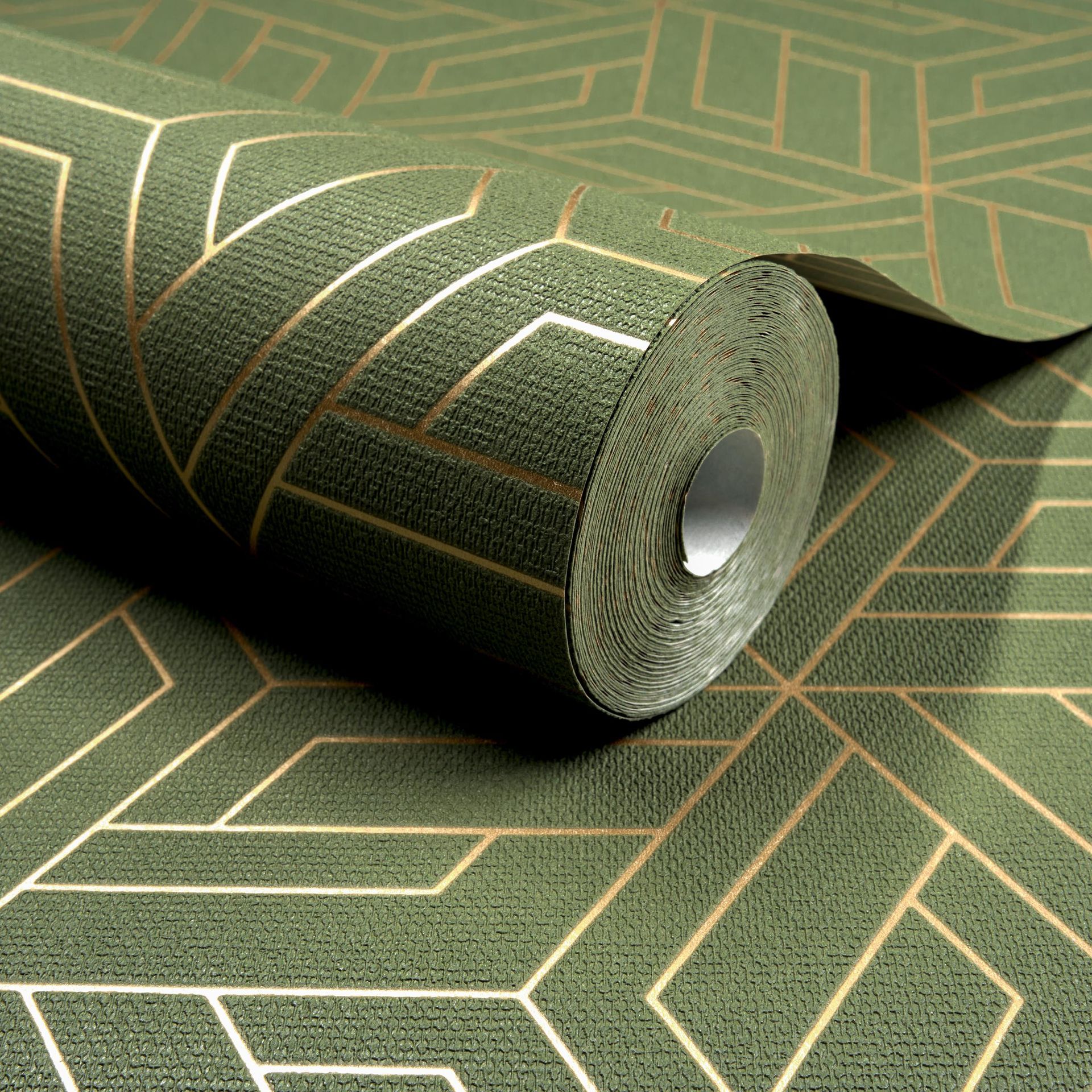 Die graugrüne Grundfarbe vermittelt Ruhe und Stabilität, während die feinen goldenen Akzente Wärme und Raffinesse hinzufügen. Diese Kombination schafft eine edle Atmosphäre, die sich in modernen und klassischen Interieurs gleichermaßen integriert. Das geometrische Muster ist mittelgroß und gleichmäßig verteilt, wodurch es sich hervorragend als Akzentwand eignet, aber auch großflächig verwendbar ist.