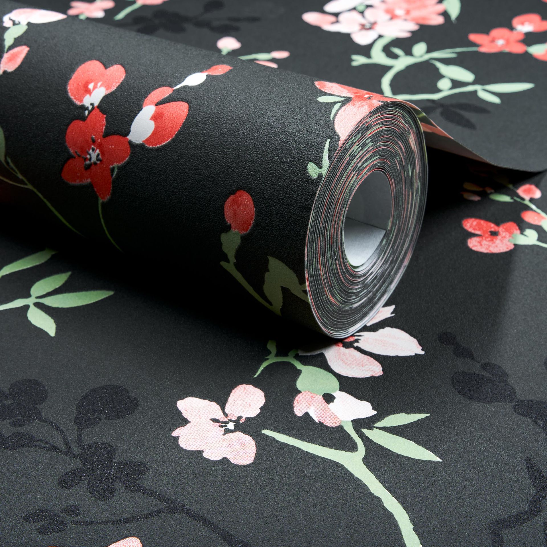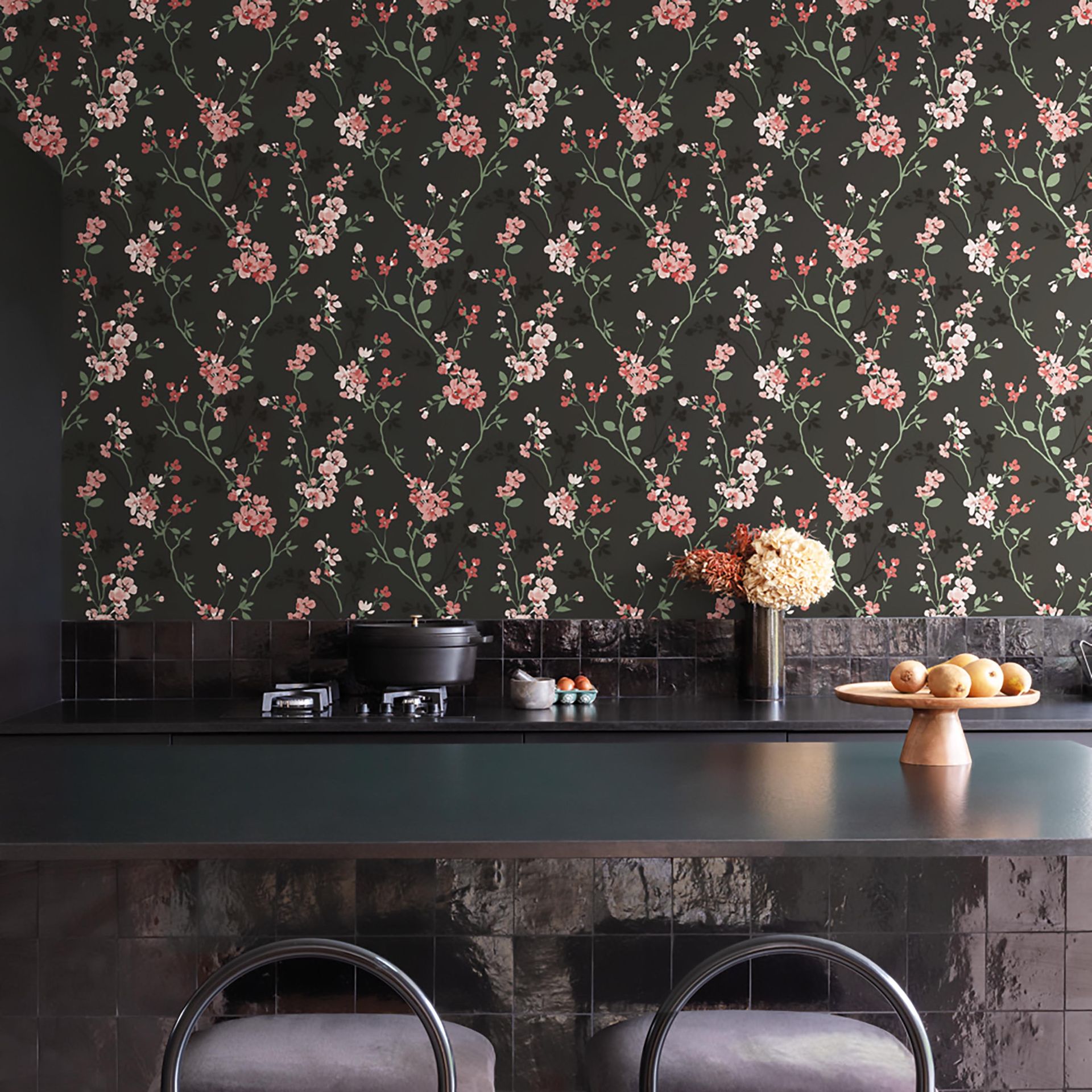 Diese hochwertige Blumentapete verbindet botanische Eleganz mit modernem Design. Zarte Blüten in Koralle und zartem Rosa setzen sich stimmungsvoll vor einem dunkelgrauen Hintergrund in Szene. Fein ausgearbeitete grüne Ranken und Blätter schaffen eine organische Struktur, die den Raum mit natürlicher Leichtigkeit belebt.