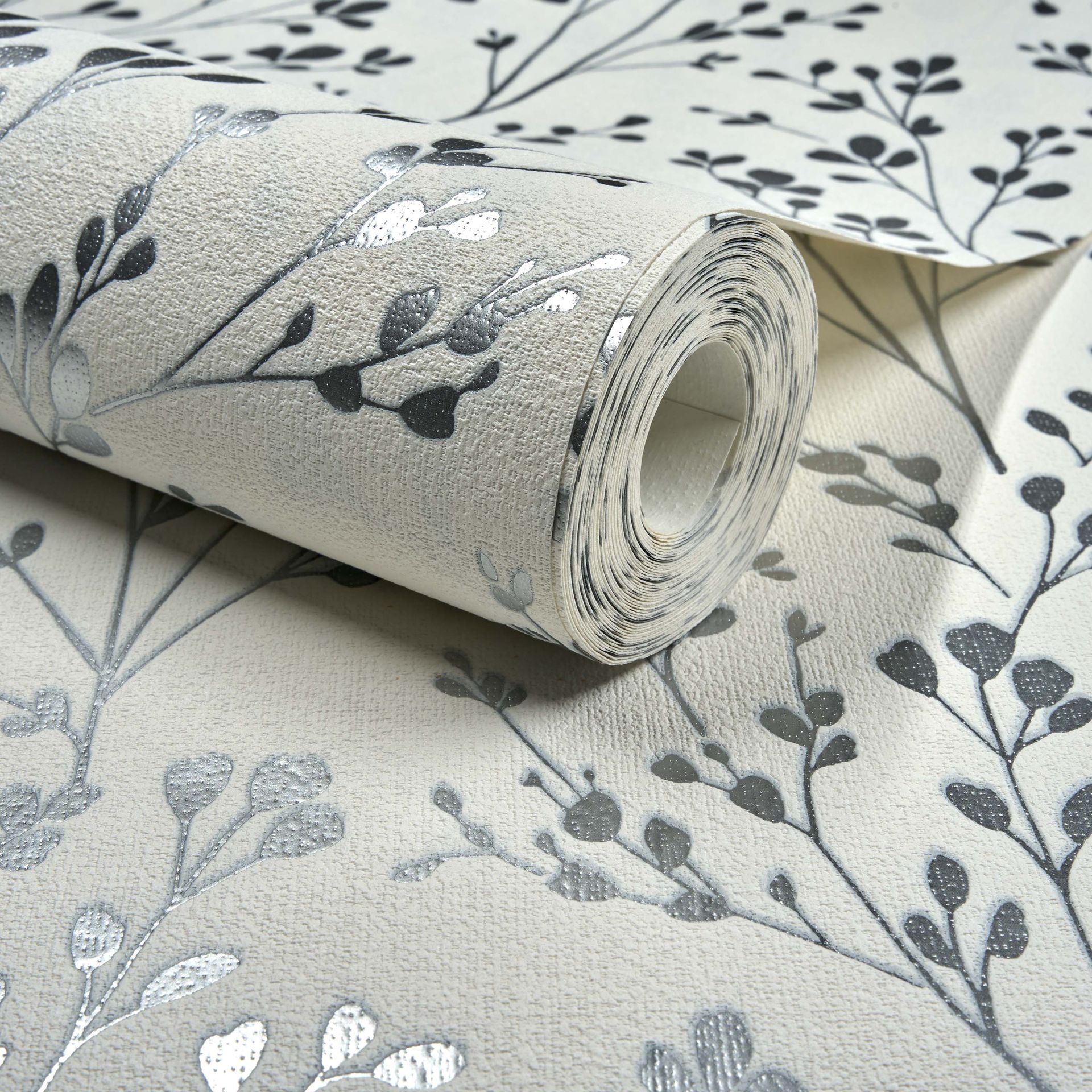 Diese elegante botanische Tapete besticht durch ein feines, natürliches Blättermuster, das sich organisch über die hellbeige-weiße Fläche verteilt. Die grauen, stilisierten Blätter bilden feine Zweigstrukturen, die eine sanfte Bewegung in den Raum bringen, ohne dabei aufdringlich zu wirken.