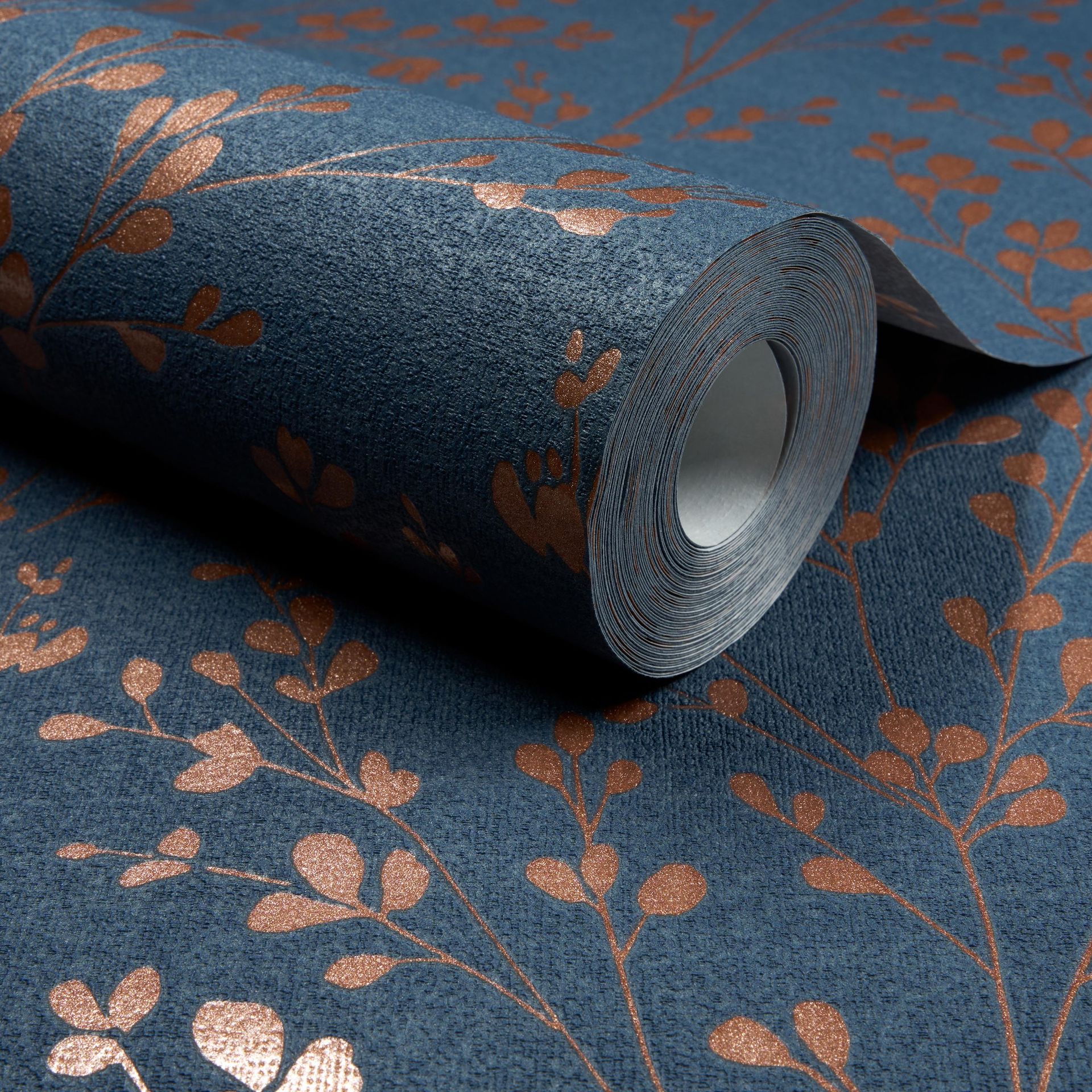 Diese elegante Tapete präsentiert ein feines botanisches Muster aus zarten Blütenzweigen in warmen Goldtönen auf ruhigem Blaugrau-Untergrund. Die naturalistische Darstellung der Zweige mit kleinen, organisch verteilten Blättern erzeugt eine zeitgenössisch-elegante Wirkung, die klassische Pflanzenornamentik mit modernem Minimalismus verbindet.