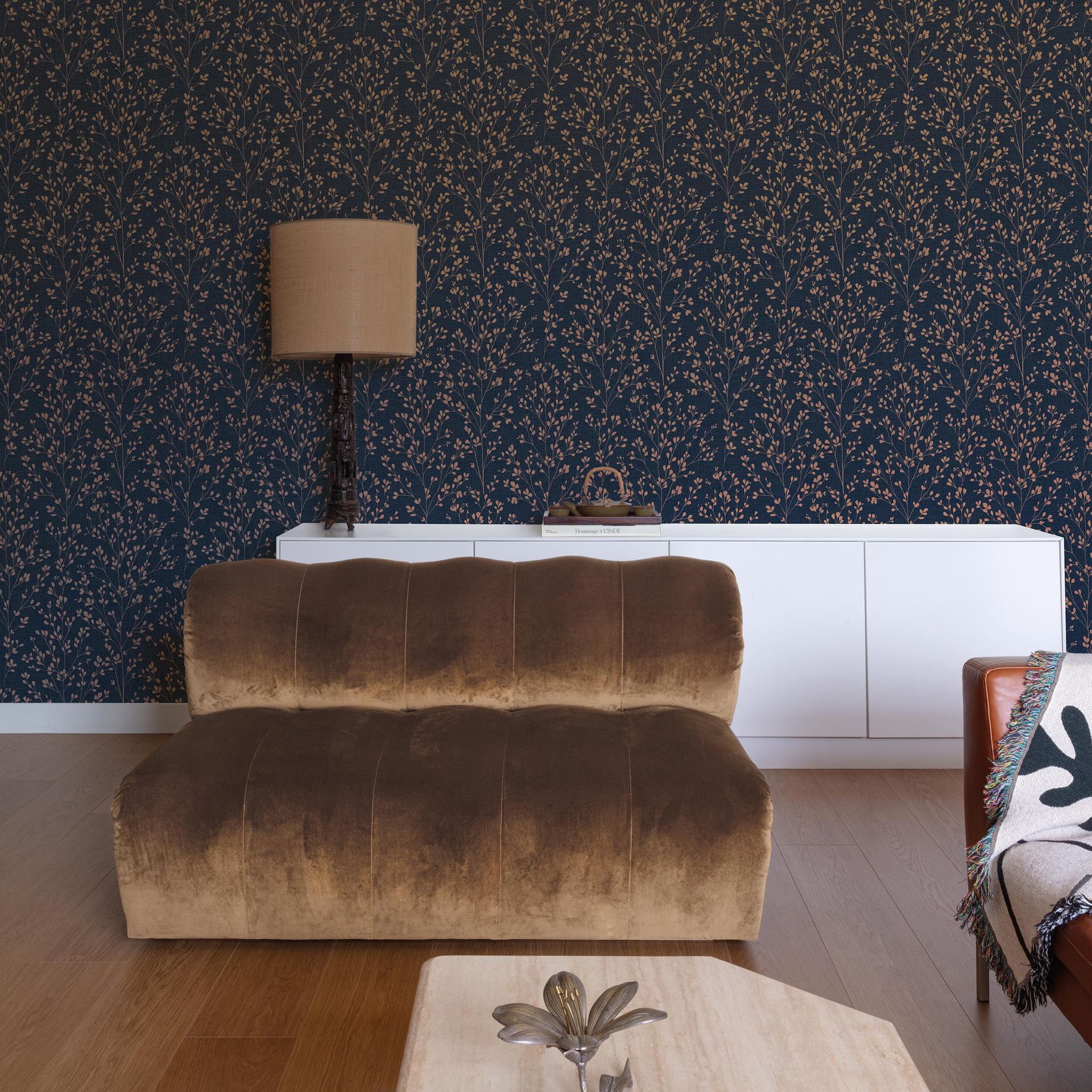 Die dezente Farbgestaltung schafft eine beruhigende, harmonische Raumatmosphäre. Das gleichmäßig verteilte, nicht aufdringliche Muster eignet sich hervorragend für eine durchgehende Wandgestaltung im gesamten Raum. Die sanfte Linienführung der Zweige und die feinteilige Blattstruktur verleihen Tiefe, ohne zu wirken. Die goldenen Akzente bringen Wärme ins Blaugrau ein und erzeugen subtile Eleganz.