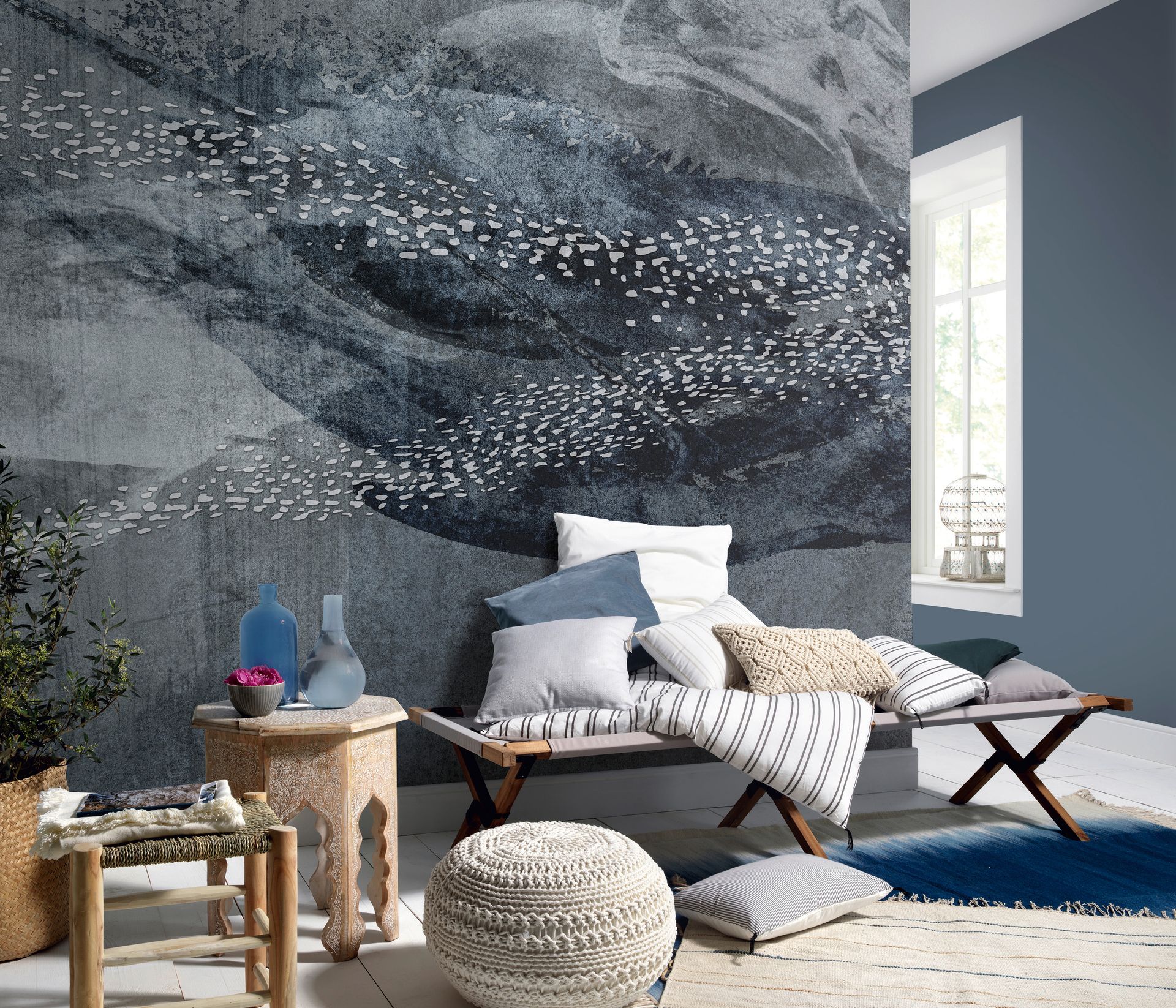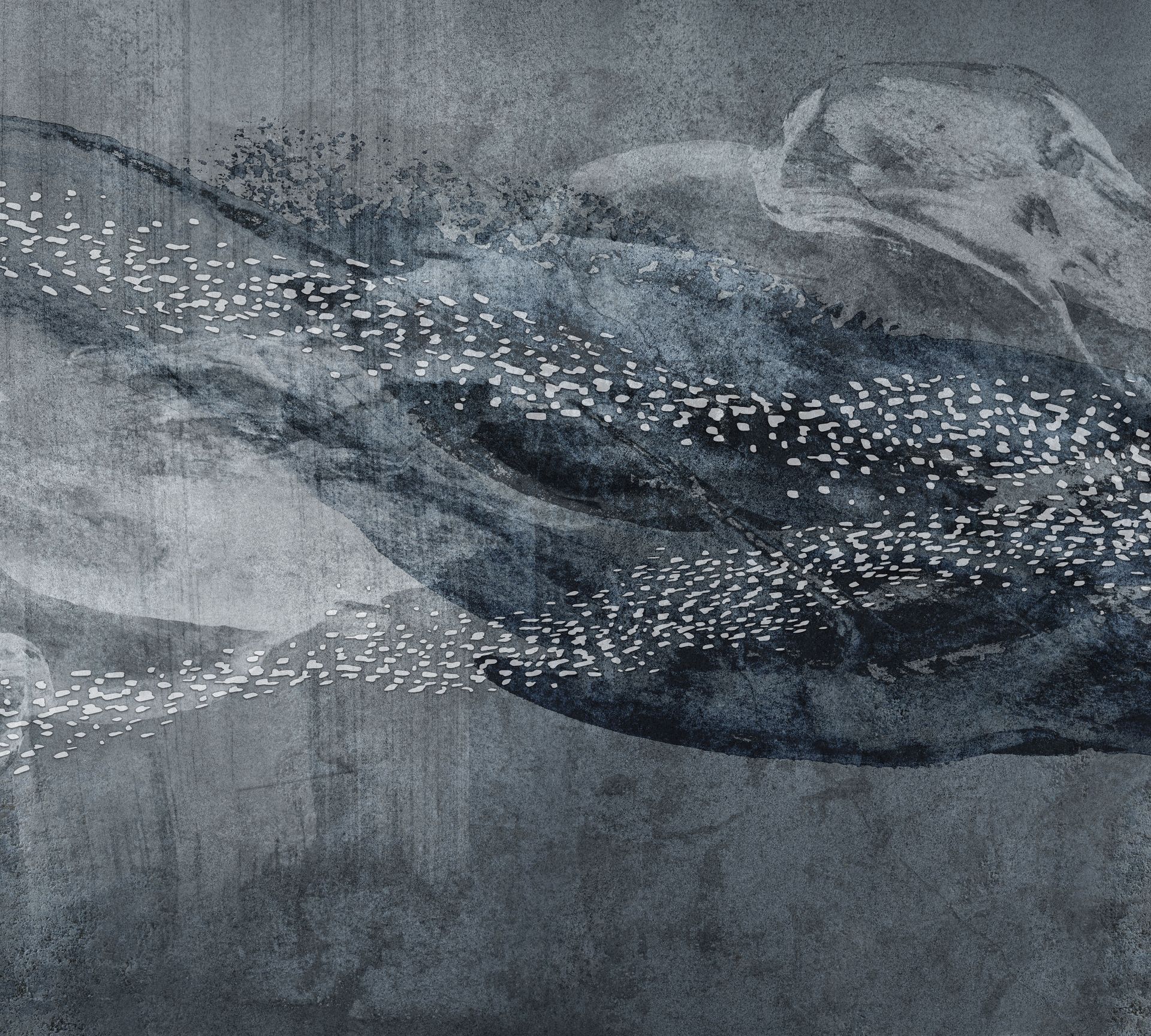 Diese künstlerische Wandgestaltung zeigt einen stilisierten Fischschwarm in eleganten Blau- und Grautönen, der durch fließende Aquarellstrukturen und eine organische Formsprache besticht. Die Fische sind mit feinen weißen Punktmustern akzentuiert und fügen sich harmonisch in die abstrakten, malerischen Hintergründe ein. Die kühle Farbpalette aus Dunkelblau, Taubenblau und Silbergrau vermittelt eine beruhigende, naturverbundene Atmosphäre.