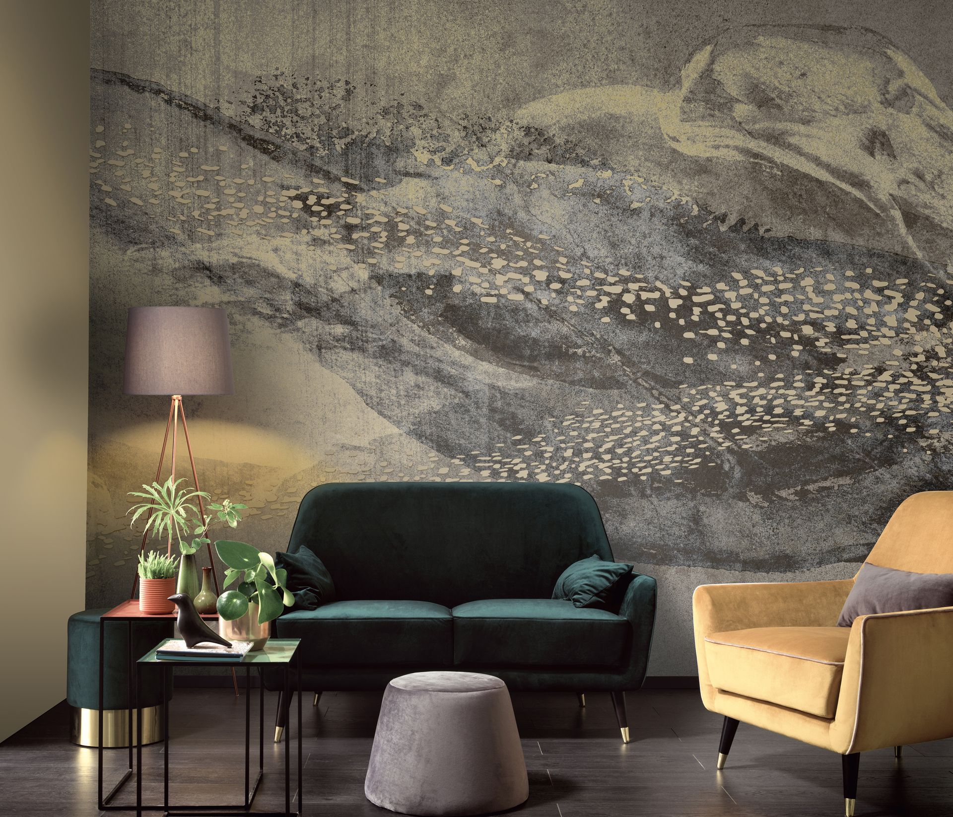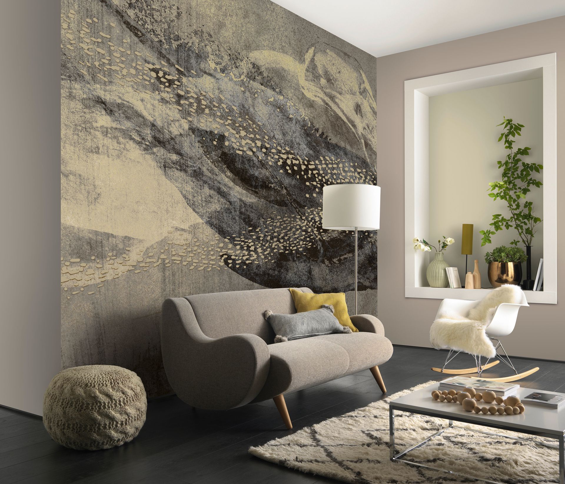 Die großflächige Gestaltung mit organischen Formen schafft eine naturverbundene, zugleich sophisticated wirkende Raumatmosphäre. Die schimmernde Oberflächenwirkung verstärkt den künstlerischen Charakter und lässt die Tapete je nach Lichteinfall lebendig erscheinen. Besonders als Akzentwand in Wohnzimmer oder Schlafzimmer entfaltet das Design seine volle Wirkung.