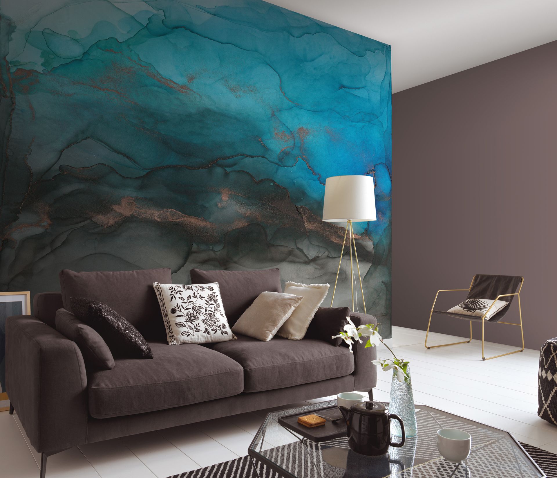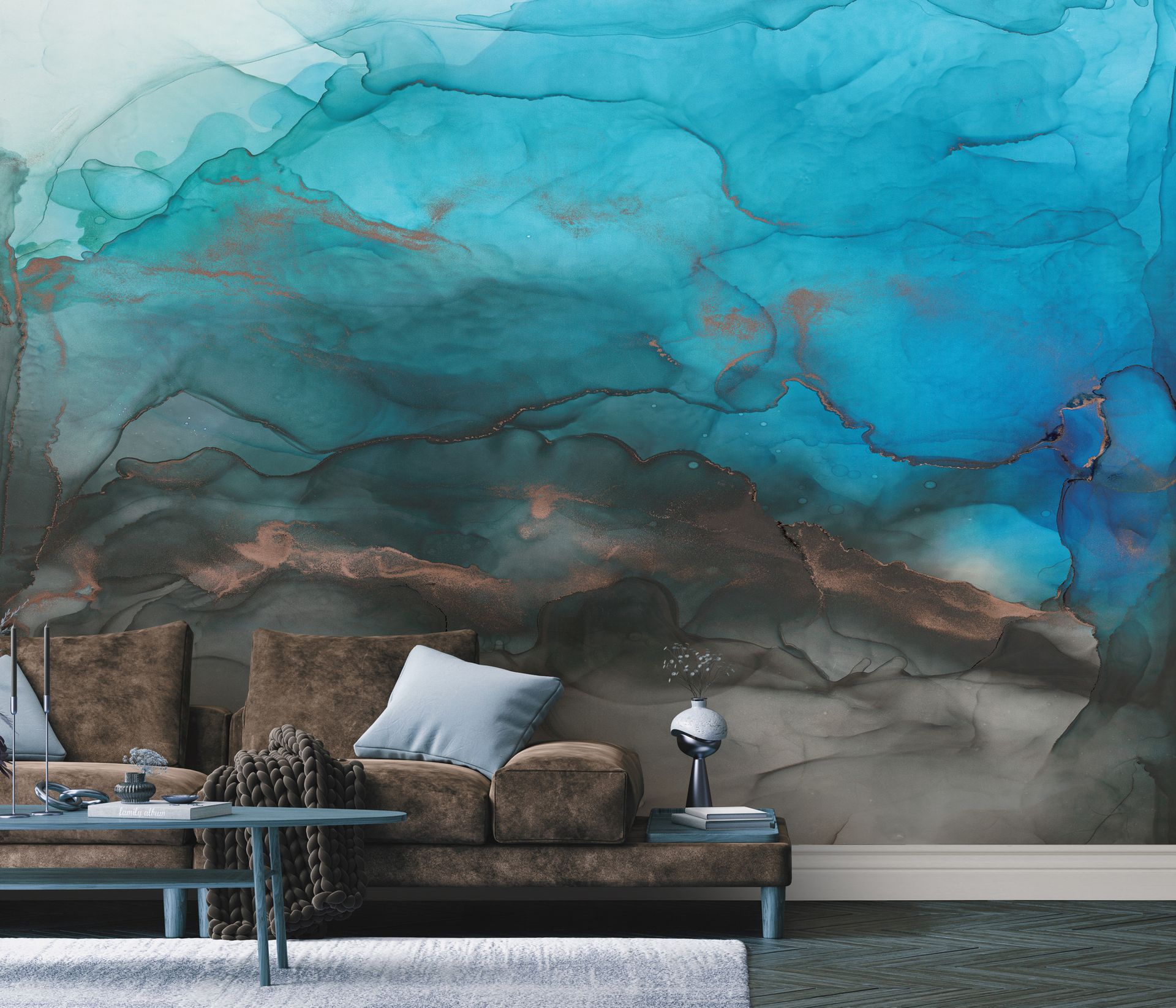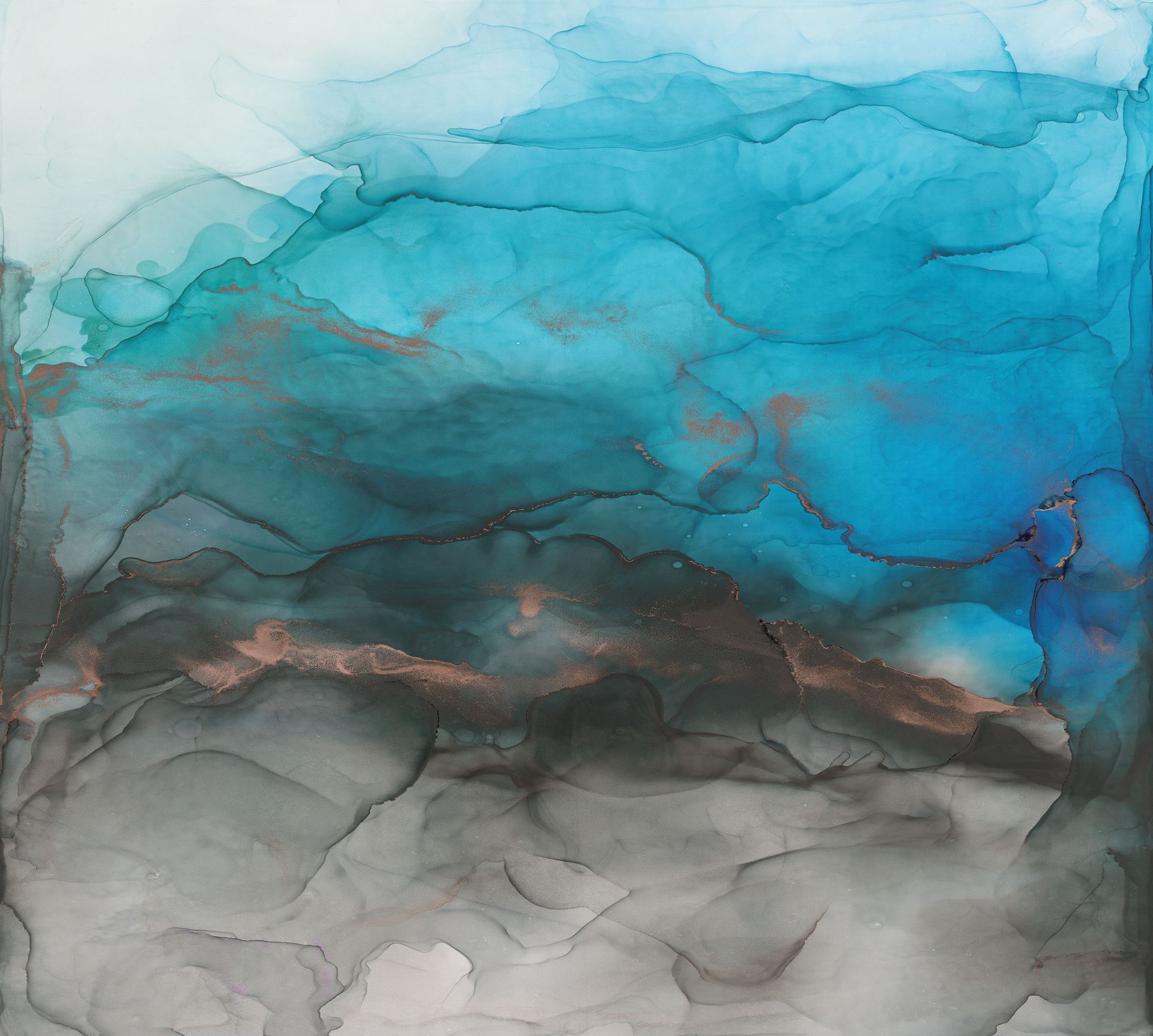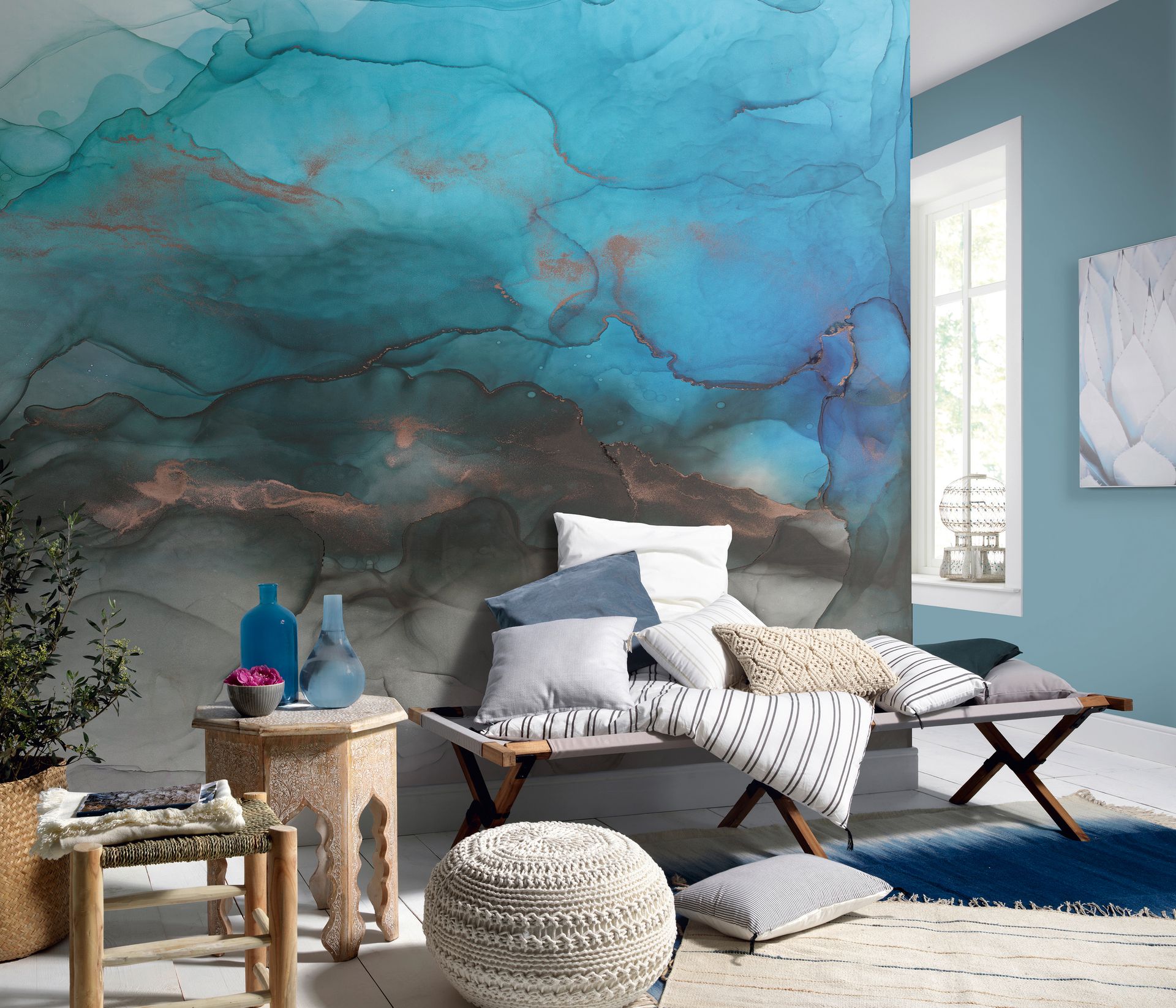 Diese künstlerische Designtapete aus der Art Edition von Erismann interpretiert moderne Fluid Art in beeindruckender Weise. Fließende Farbübergänge von hellem Türkis über Petrol bis hin zu sanften Grau- und Beigetönen verschmelzen organisch ineinander und erinnern an die Bewegungen von Wasser oder Aquarellfarben auf Papier. Kupferfarbene Akzente setzen edle Glanzpunkte und verleihen dem Design eine luxuriöse Note.