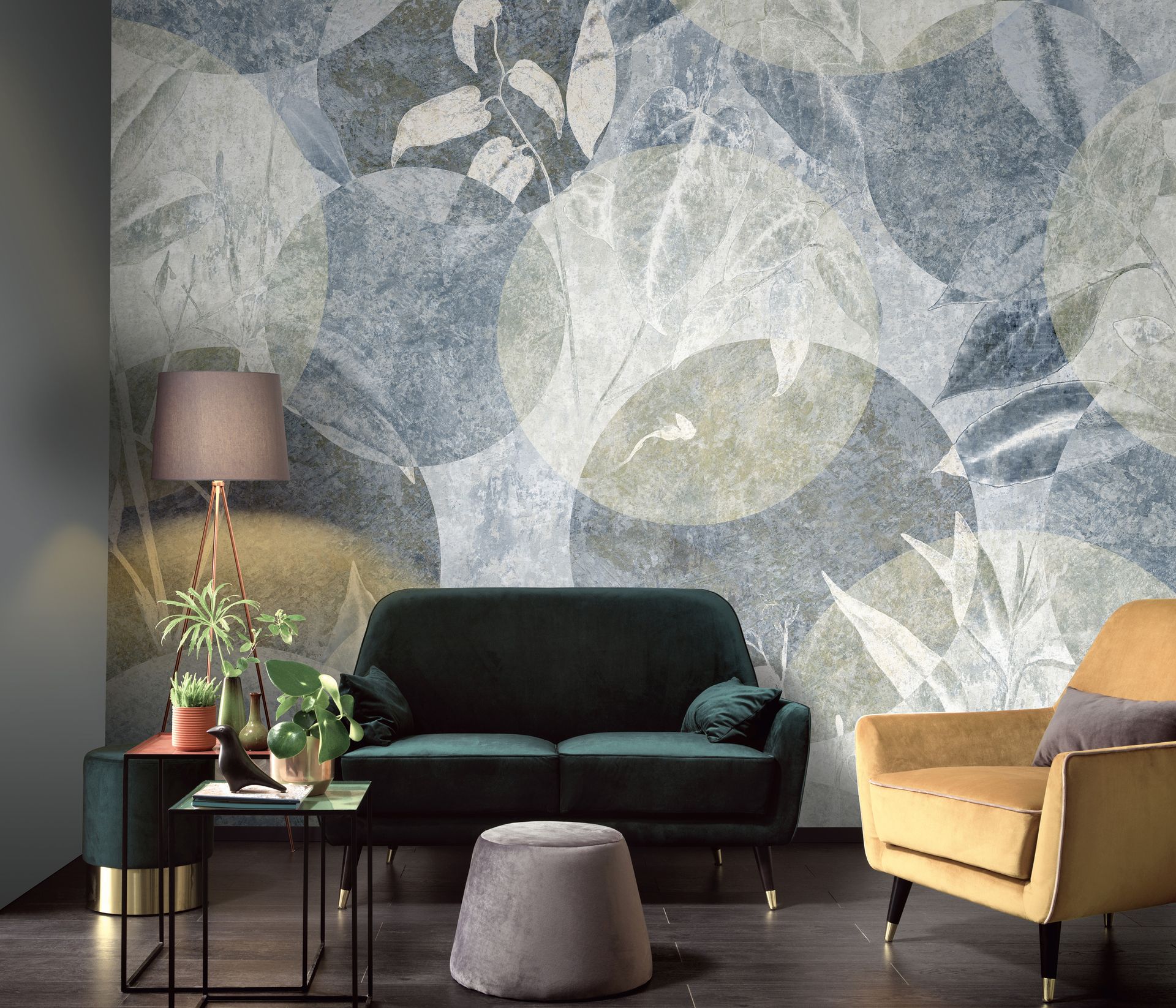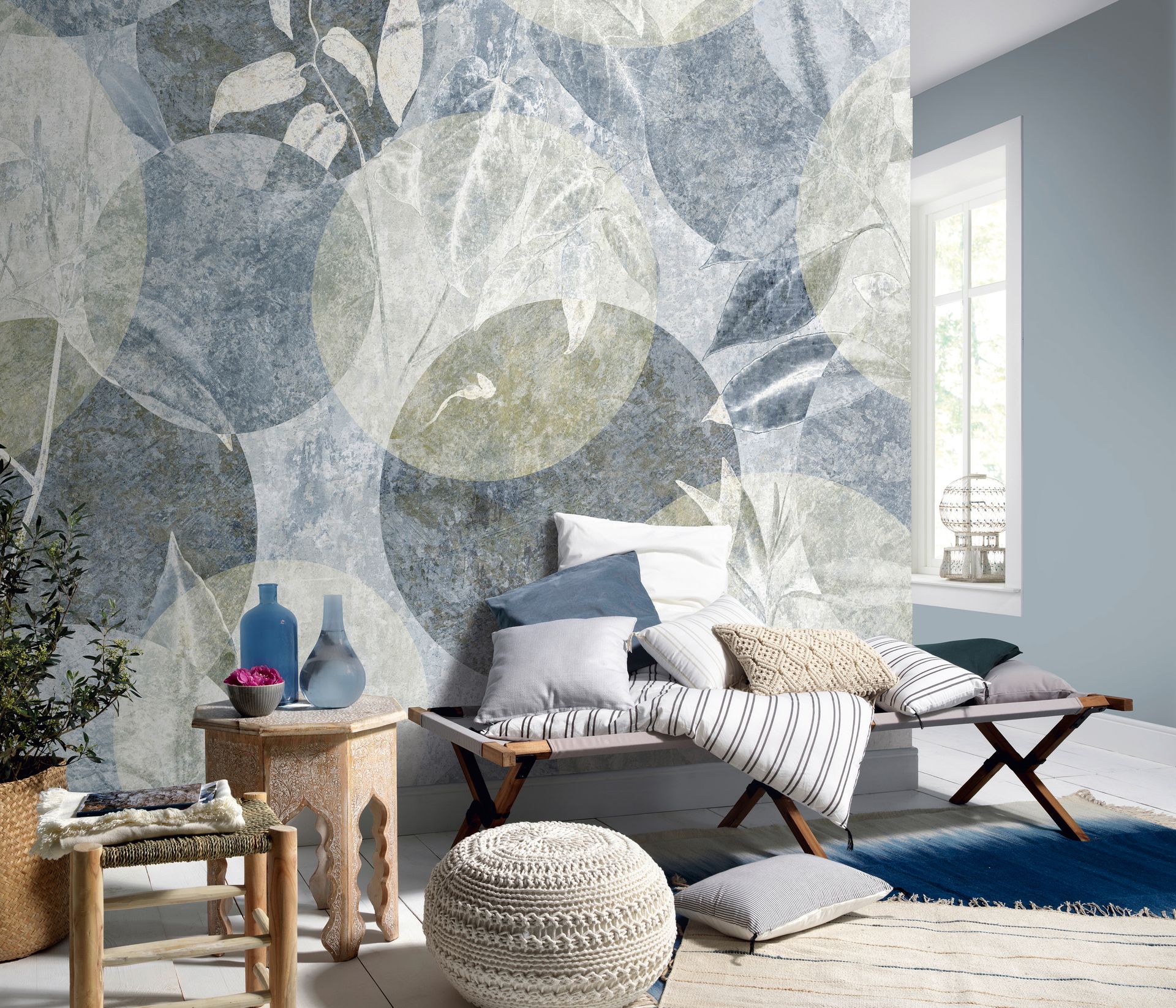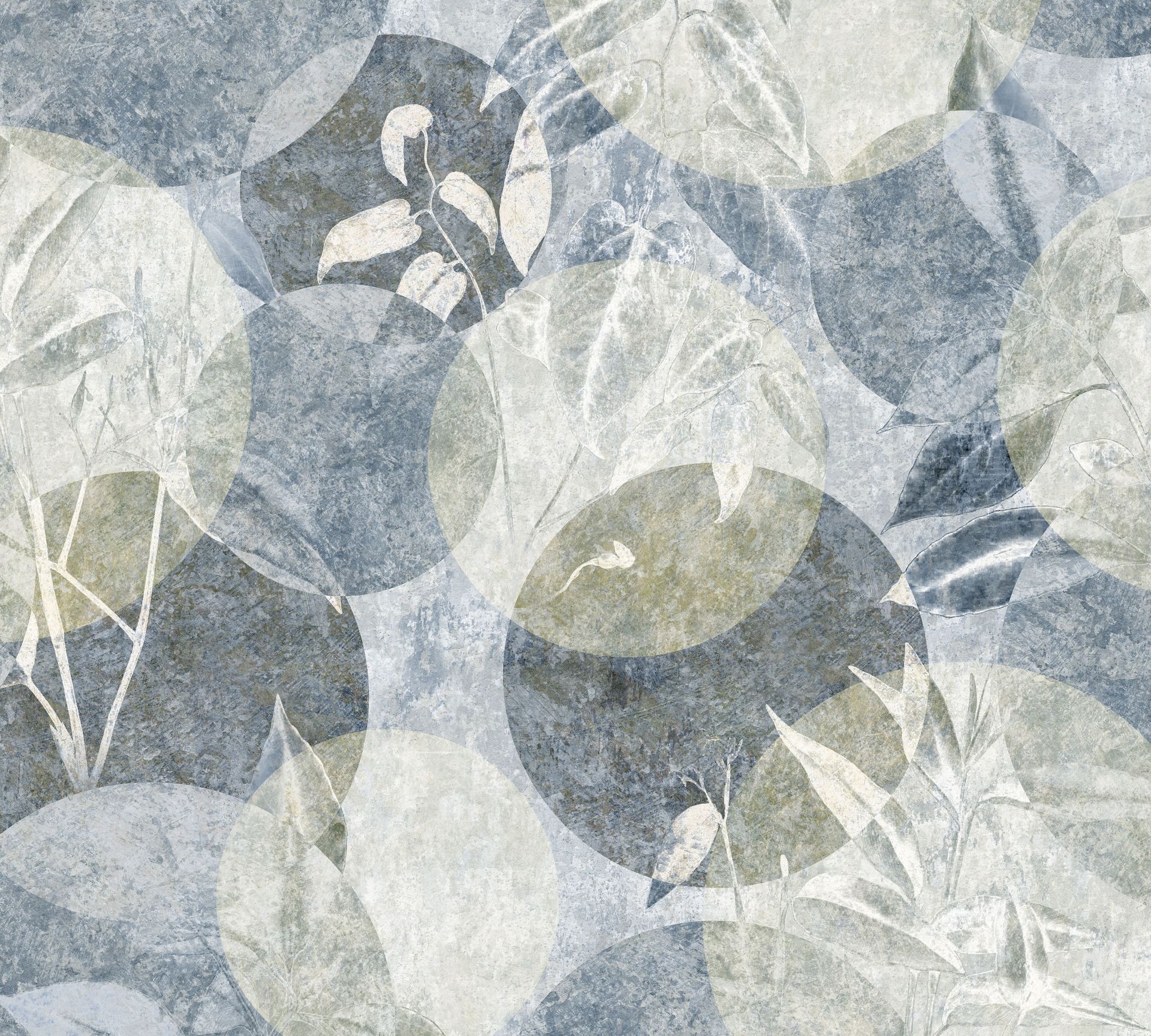 Die kühle, gedämpfte Farbpalette mit niedrigem Kontrast schafft eine beruhigende Atmosphäre, die sich besonders gut für Rückzugsorte wie Schlafzimmer oder Wohnbereiche eignet. Die ungerichtete Komposition wirkt lebendig, ohne unruhig zu sein, und lässt sich sowohl als stimmungsvolle Akzentwand als auch raumfüllend einsetzen.