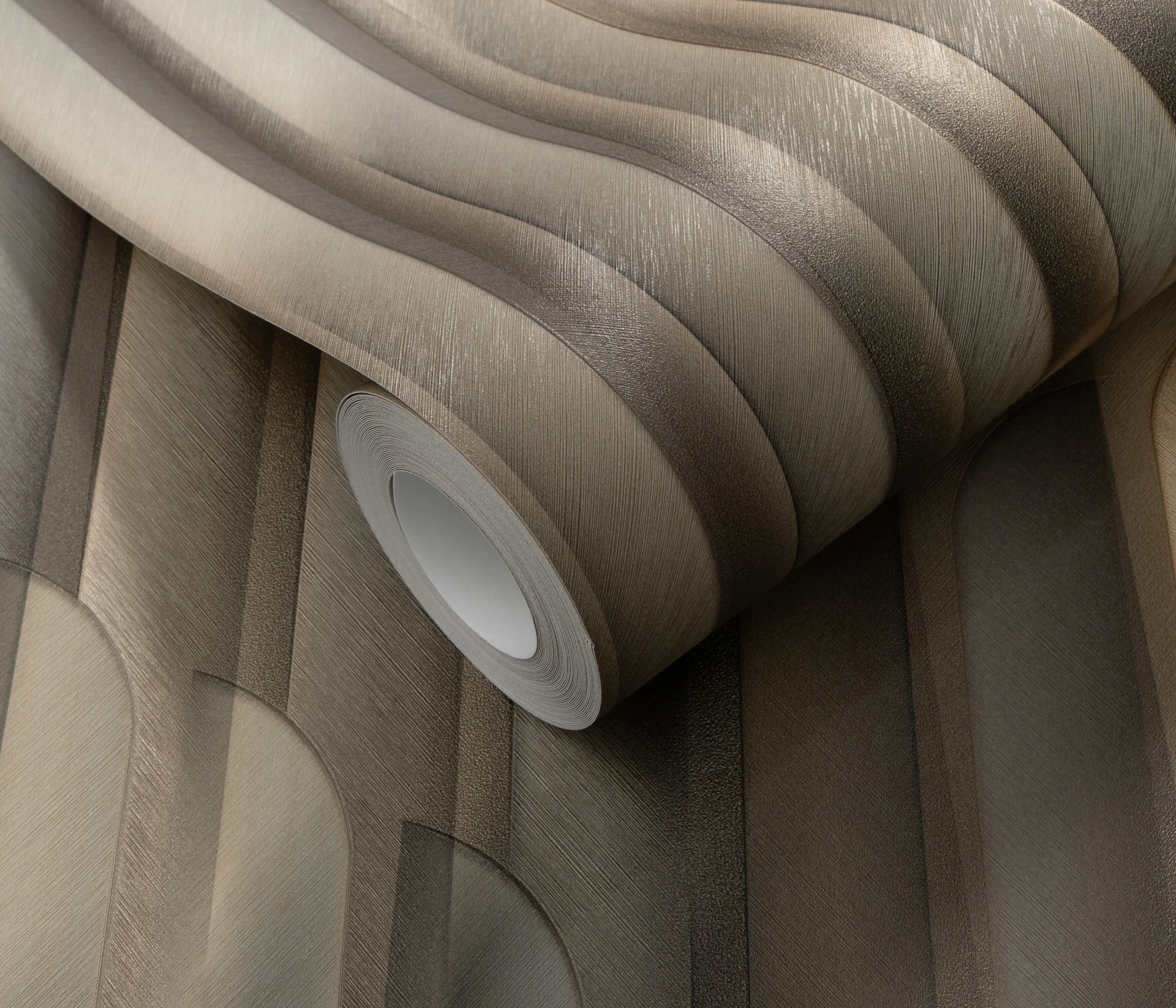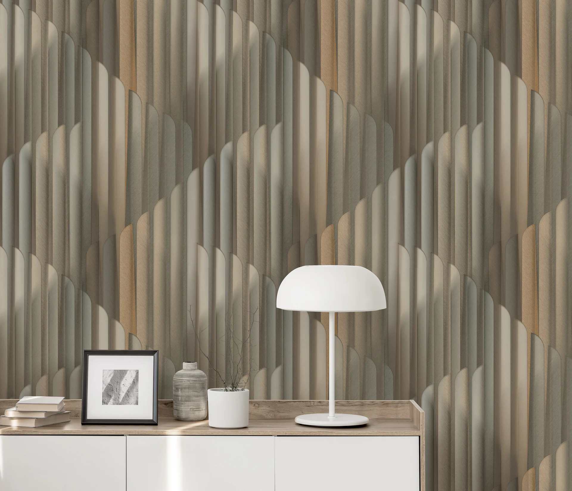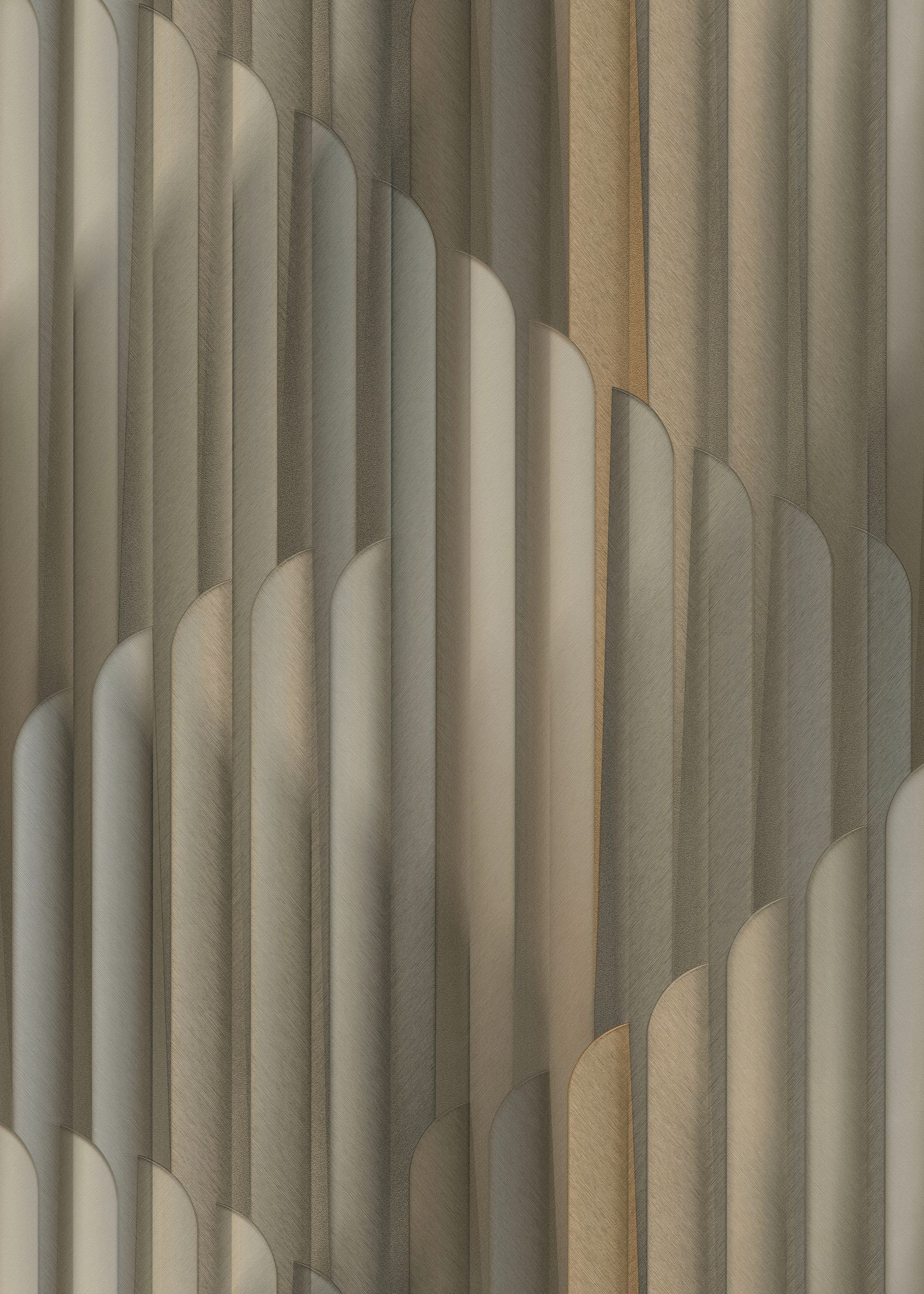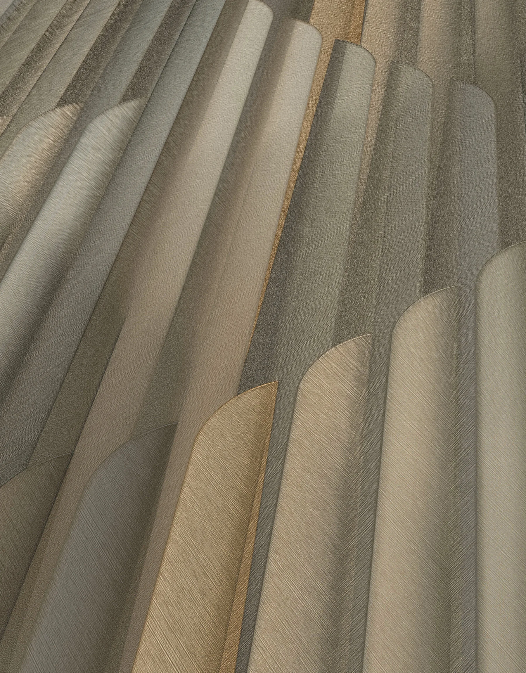 Diese elegante Tapete aus der Elysium-Kollektion interpretiert den Art-Déco-Stil mit einer raffinierten Komposition aus vertikalen Streifen und rhythmisch angeordneten Bogenformen. Die sanften Farbabstufungen in Beige, Grau und Taupe mit dezenten Ocker-Akzenten schaffen eine harmonische, zurückhaltende Optik. Die feinen Linien und die organische Bogenarchitektur erinnern an die klassischen Fassaden der 1920er Jahre und verleihen Räumen eine zeitlose Eleganz.