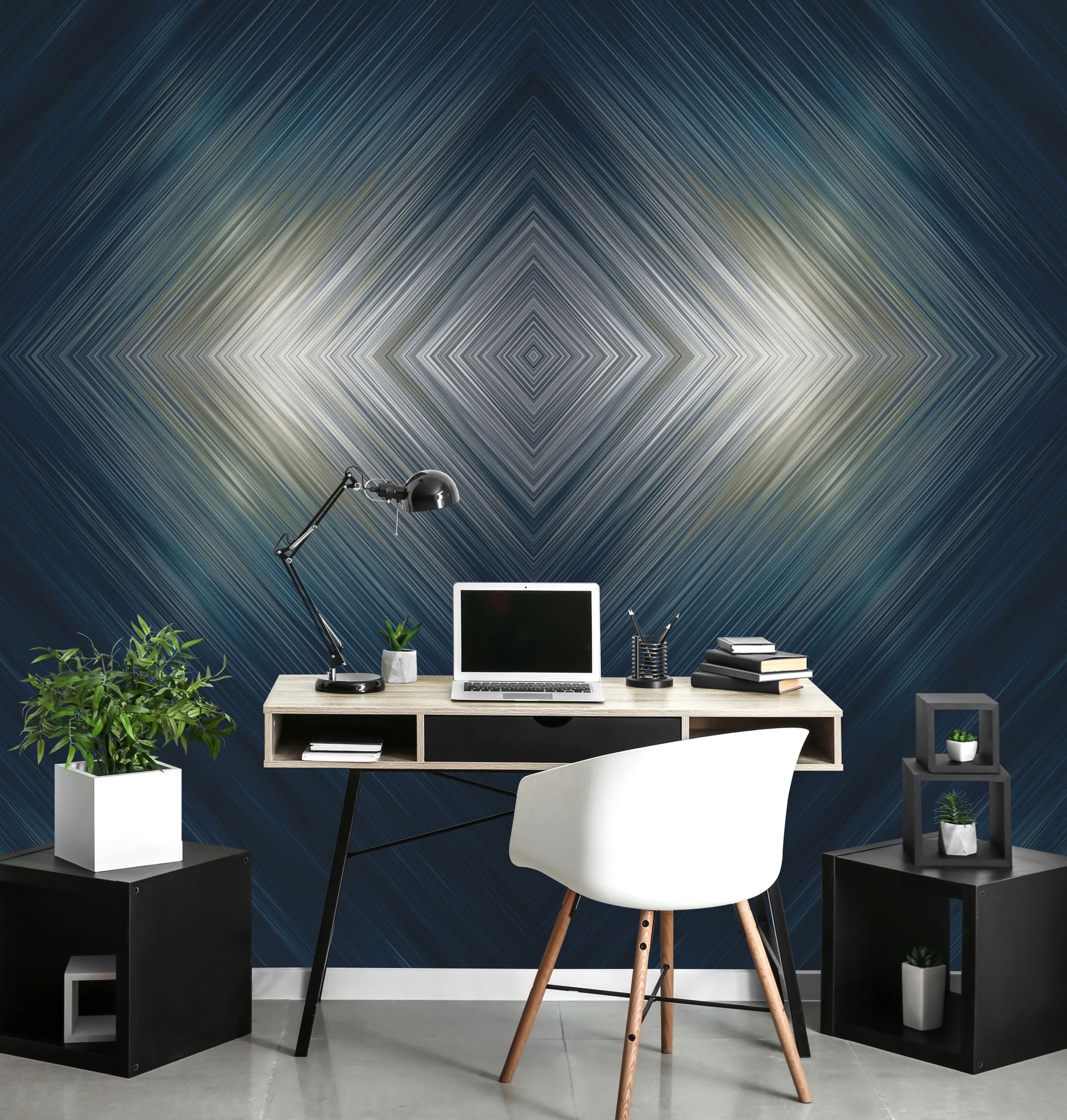 Modern Art Tapete mit konzentrischem Rautenmuster in Dunkelblau-Gold