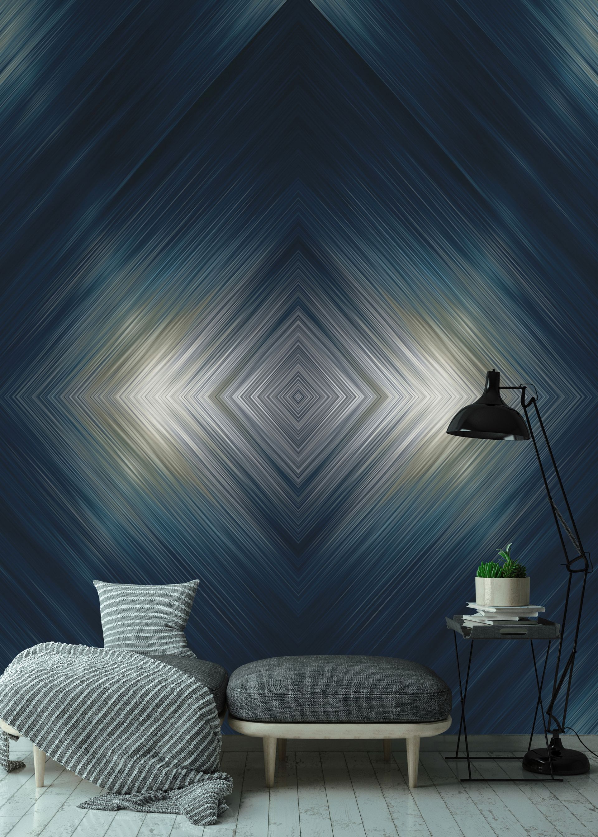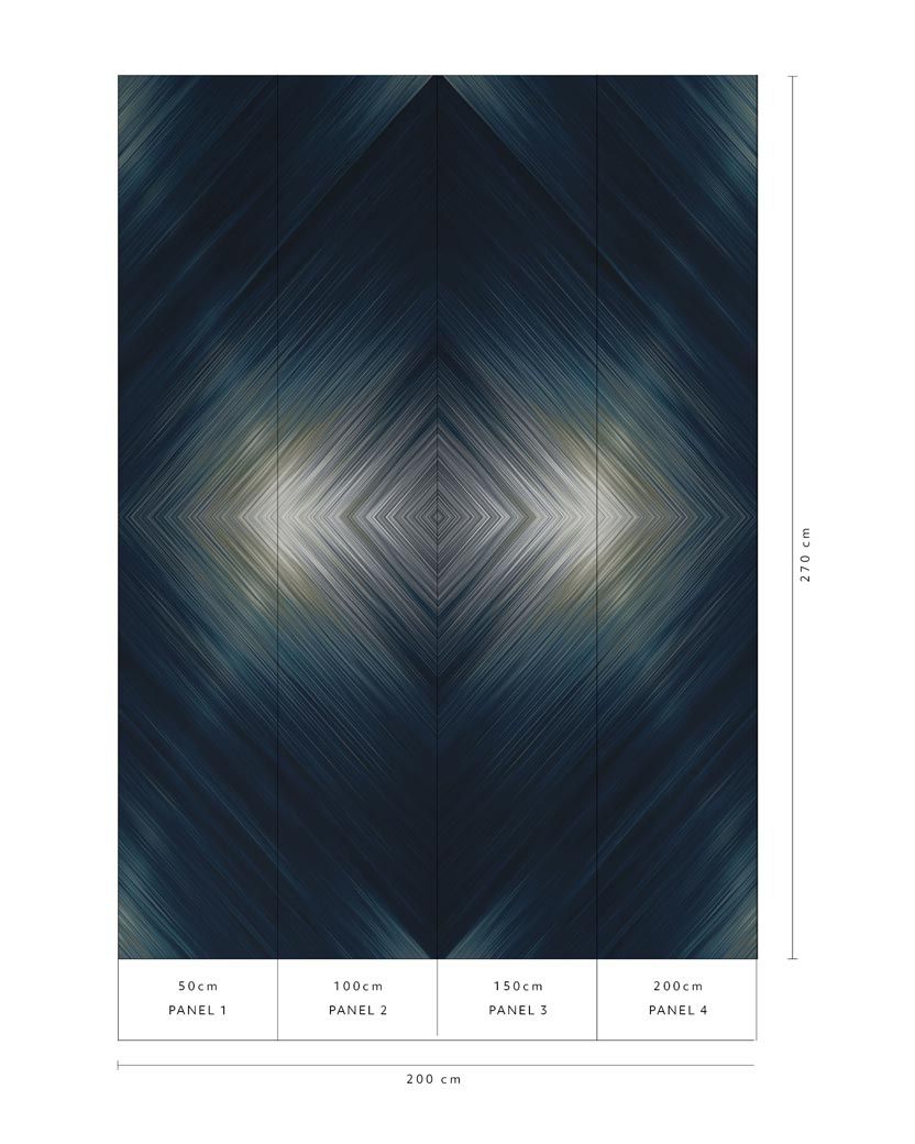 Diese künstlerische Tapete der Art Edition Kollektion besticht durch ihr faszinierendes konzentrisches Rautenmuster, das sich diagonal über die Fläche erstreckt. Feine Linienstrukturen in dunkelblau-petrol Tönen schaffen eine dynamische Strahlenwirkung, während goldene und beige Akzente für luxuriöse Lichtreflexe sorgen. Die geometrische Komposition erzeugt eine beeindruckende optische Tiefe und verleiht jedem Raum eine zeitgenössisch-künstlerische Atmosphäre.