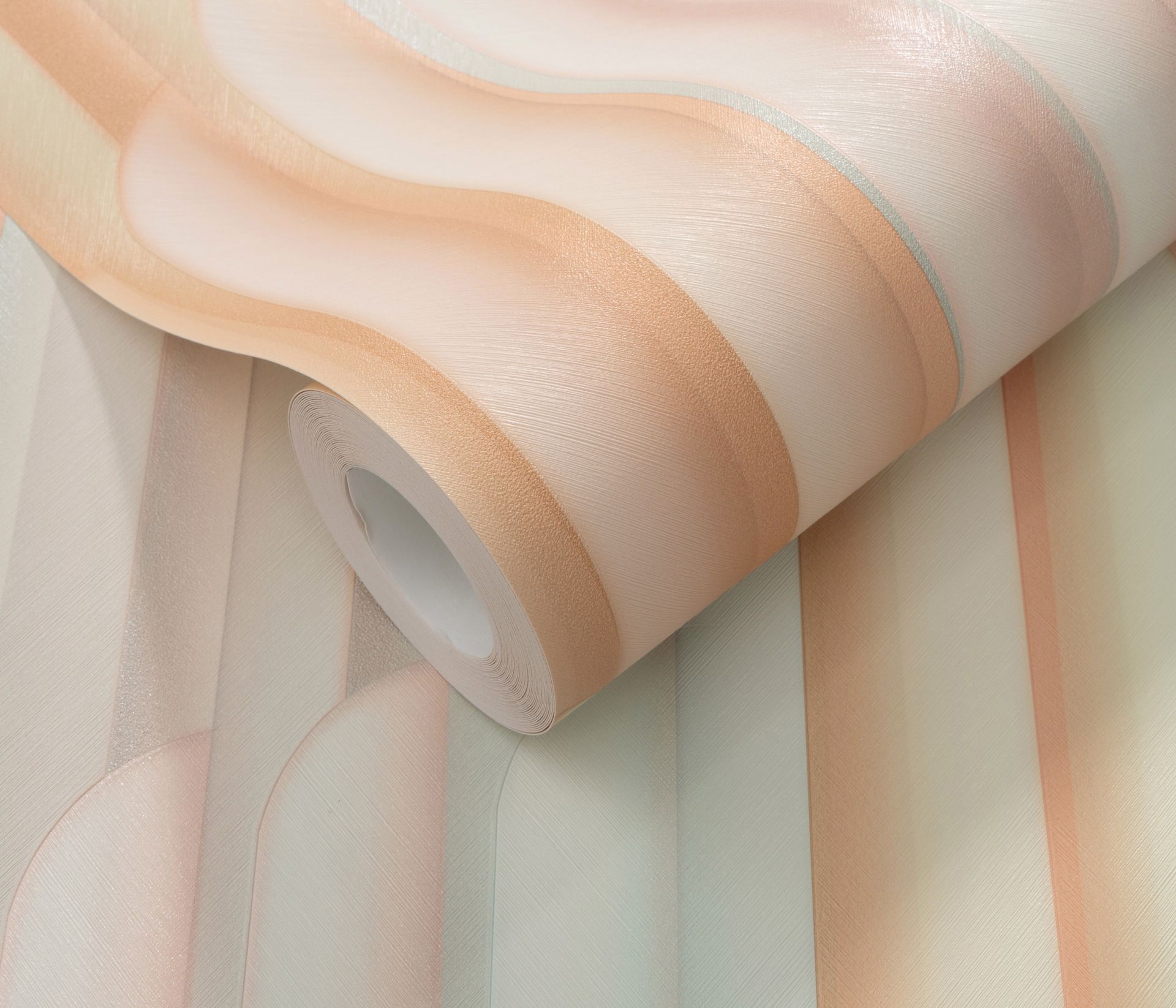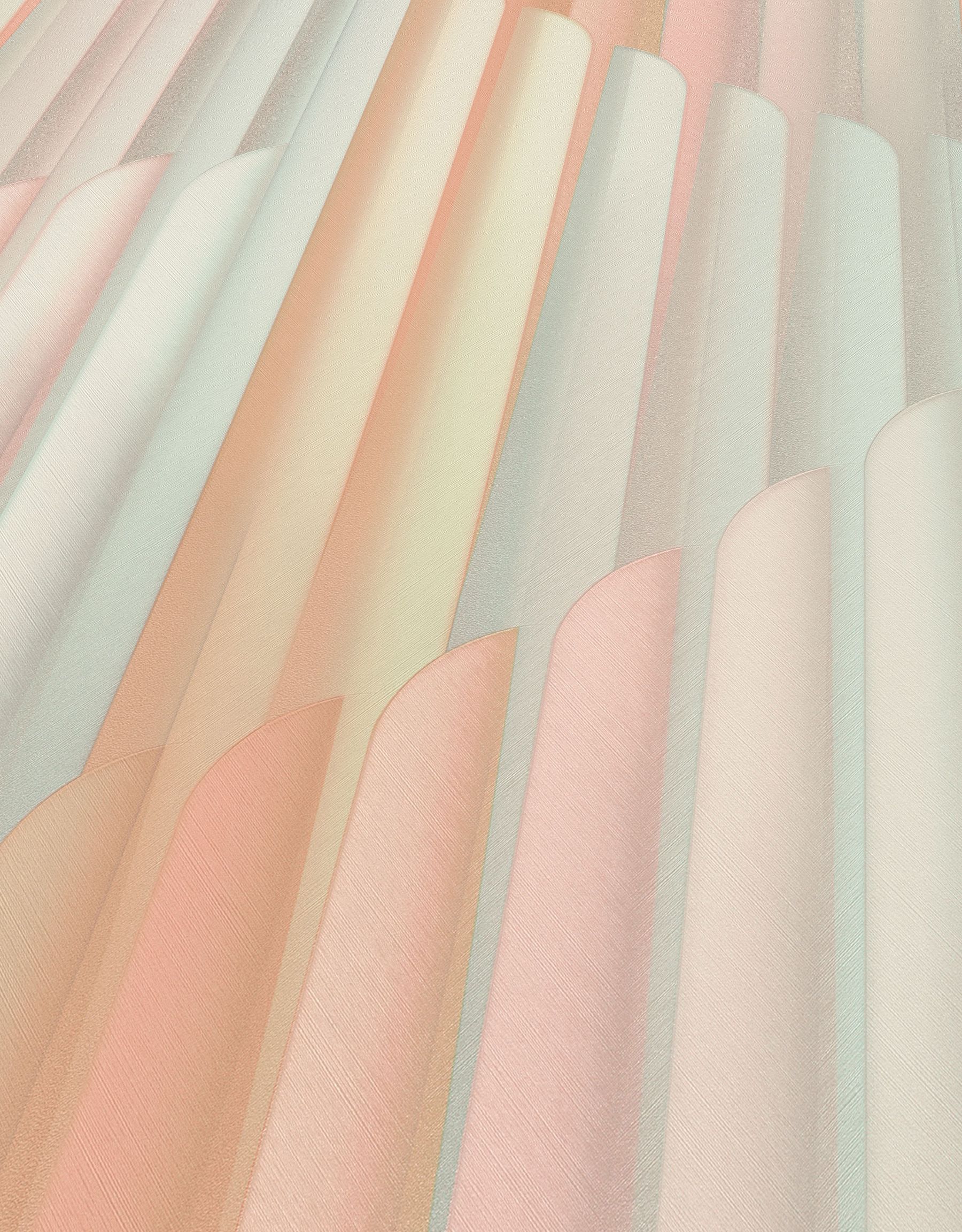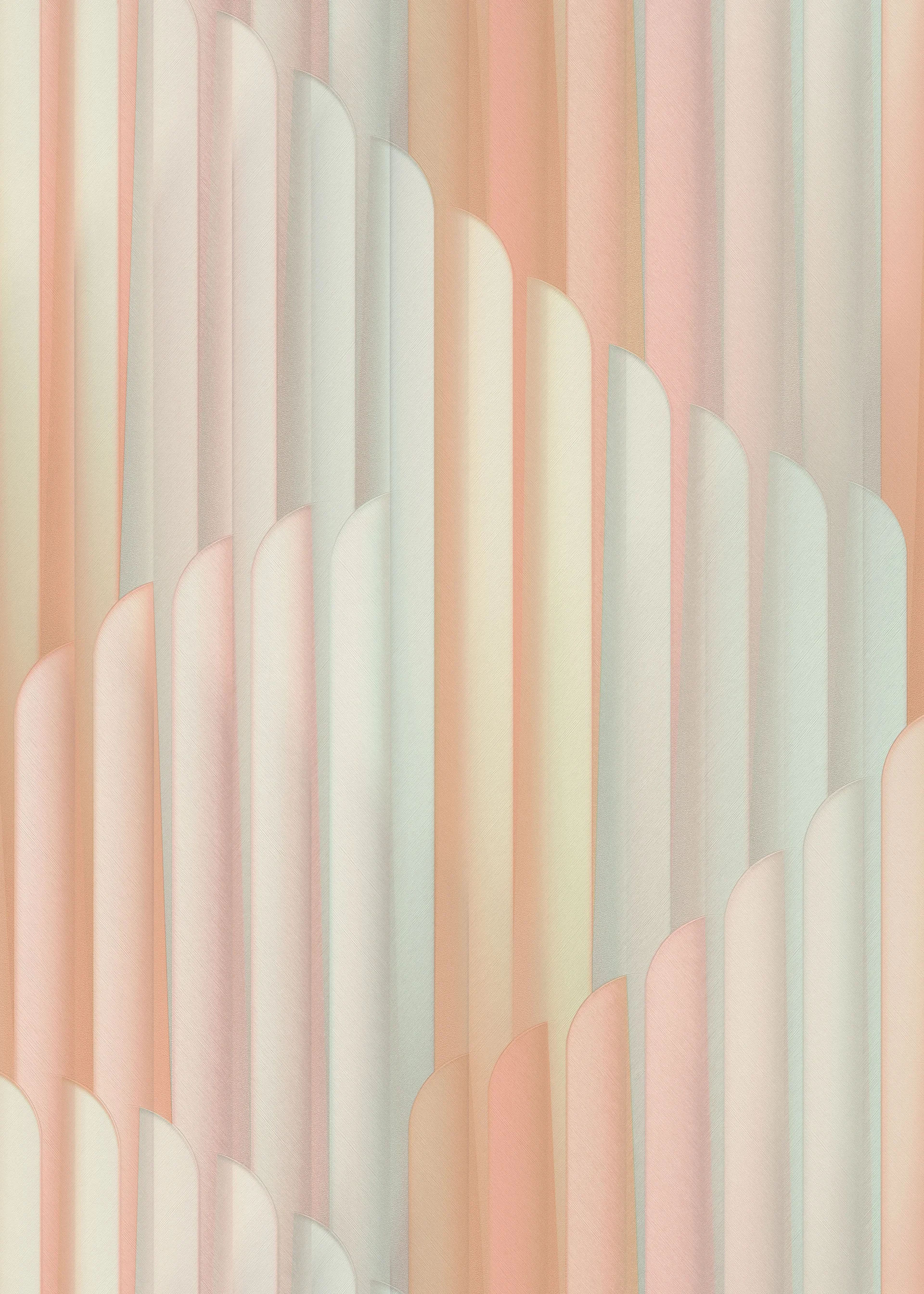 Diese Art-Déco Tapete aus der Kollektion Elysium besticht durch ihr sanftes Zusammenspiel aus Pastellfarben in Beige, Rosa, Mint und Pfirsich. Die charakteristischen geometrischen Stufenformen bewegen sich diagonal durch vertikale Streifen und erzeugen eine harmonische Tiefenwirkung. Die matte Oberfläche mit sanften Farbverläufen verleiht dem Design eine elegante Zurückhaltung.