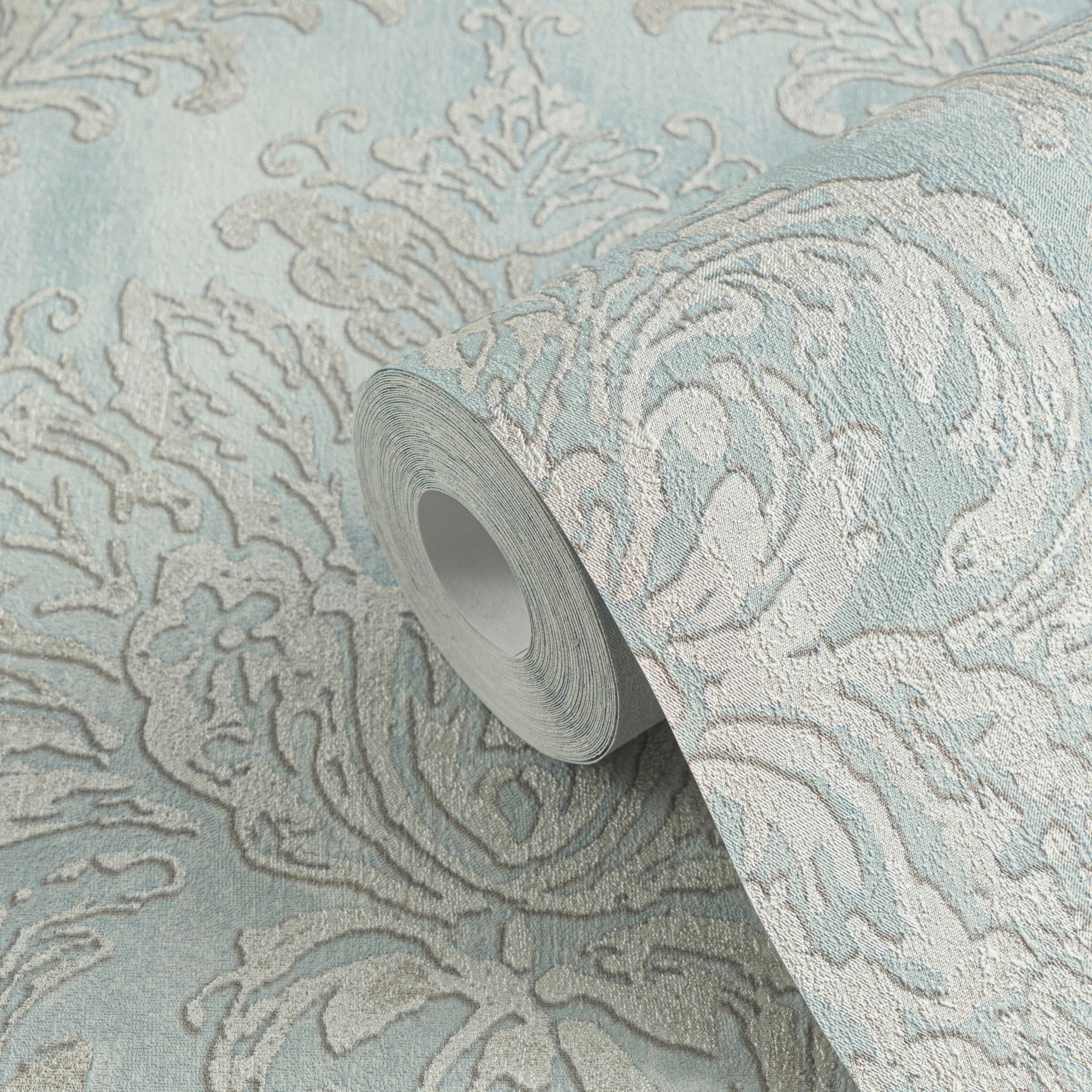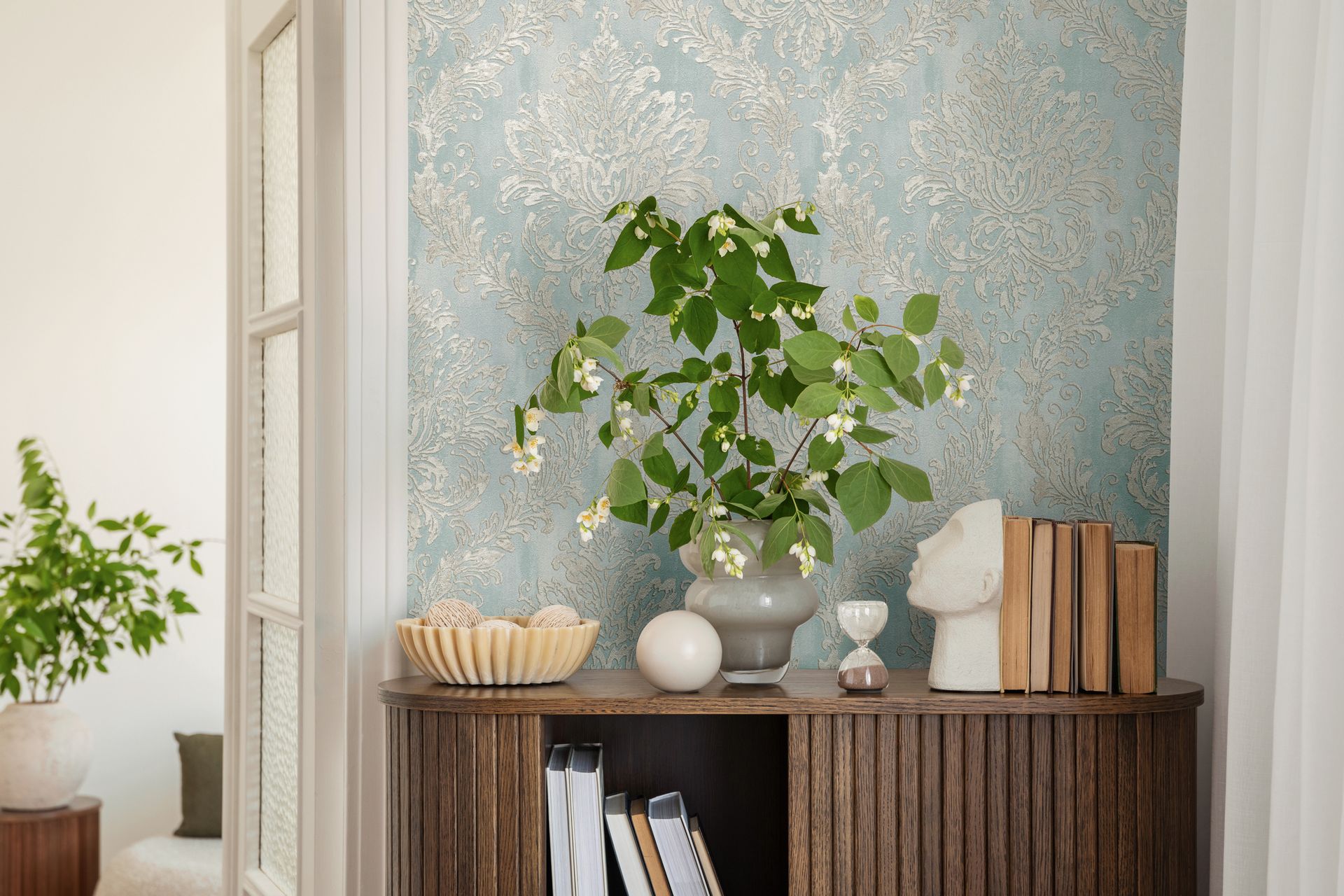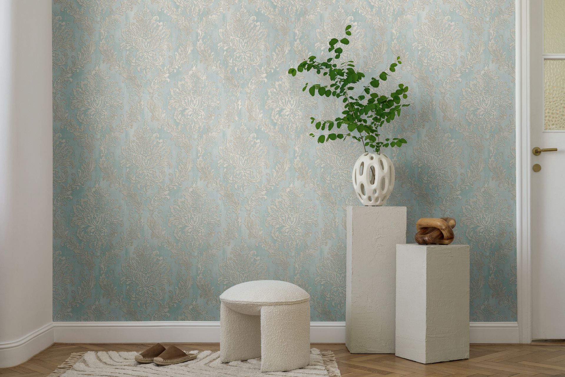 Die Vliestapete mit Ornamentstruktur in Blau und Beige vereint klassische Barockelemente mit zeitgemäßer Farbgebung. Das elegante Muster wirkt dank der harmonischen Farbkombination edel und dezent zugleich – ideal für Wohnräume mit stilvollem Anspruch.