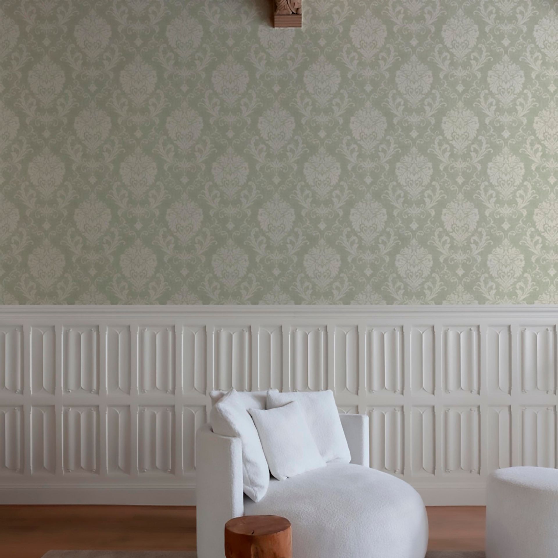 Diese elegante Tapete besticht durch klassische Ornamentik in zarten Tönen. Das Muster zeigt geschwungene, symmetrische Blattmotive in Weiß auf einem Untergrund aus zartem Grün mit leinenartiger Textur. Die Kombination wirkt zeitlos und verfeinert zugleich.