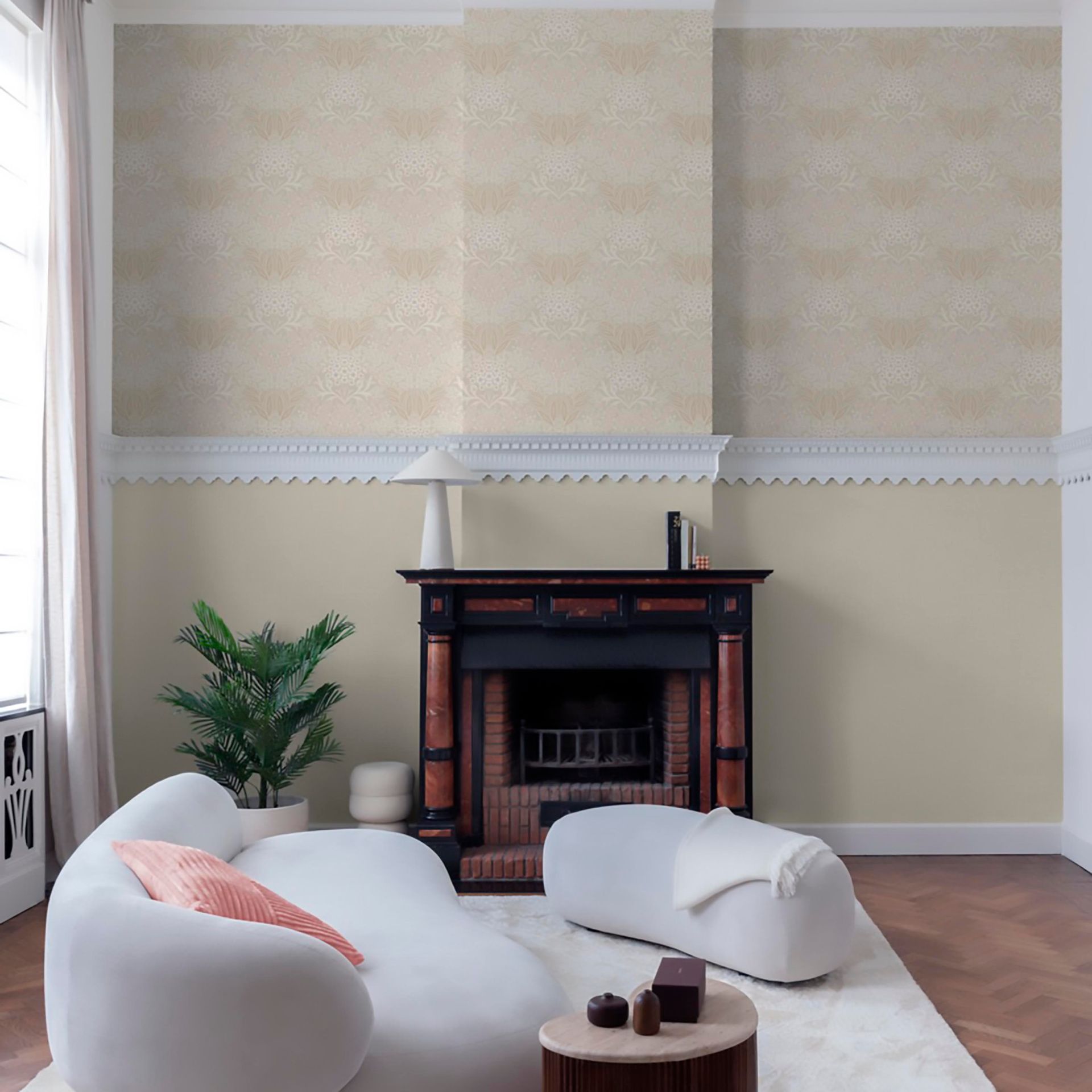 Die Farbpalette aus warmem Beige, Weiß, zartem Rosa und cremefarbenen Tönen schafft eine ruhige, einladende Raumatmosphäre. Die feinen Farbabstufungen und subtilen Kontrastierungen verleihen der Tapete Tiefenwirkung und Eleganz. Besonders geeignet als durchgehende Wandgestaltung in klassisch-traditionellen oder zeitgenössisch modernen Räumen.